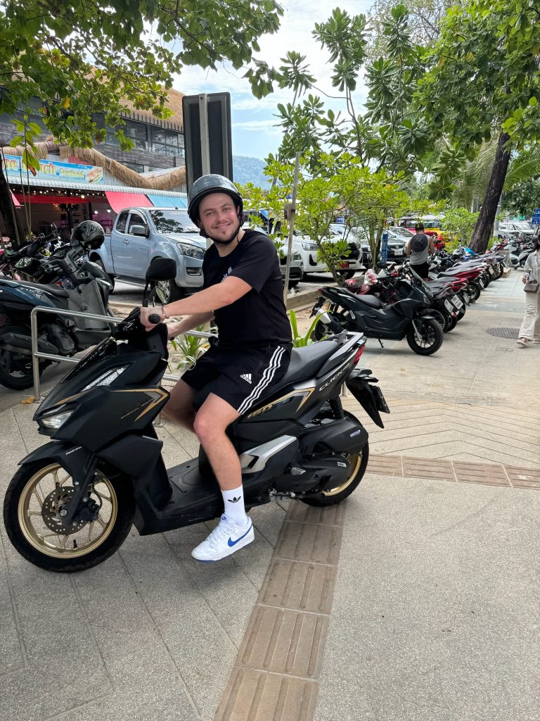 Die erste Nacht auf unserer großen Reise war nicht wirklich geil. Trotz der Klimaanlage war es warm und die Betten ungemütlich. Egal…Der Tag begann und wir waren heiß darauf, die Gegend zu erkunden. Zum Glück konnten wir direkt im Hotel einen der vielen Motorroller mieten für 400 Baht (12 Euro). Nach 5 Jahren auf Bali das erste Mal wieder auf dem Roller unterwegs. Ein paar Handgriffe waren notwendig, um den Roller zu starten. Danach ging es los und wir fuhren zur Strandpromenade von Patong. Achja, hier war ja Linksverkehr. Dort haben wir in einem modernen, nicht ganz traditionellem Restaurant mit Blick auf den Strand gefrühstückt: Natürlich mit Fruite-Shakes (pürierte Früchte und Eiswürfel) – Hammer erfrischend, lecker und hoffentlich gesund…