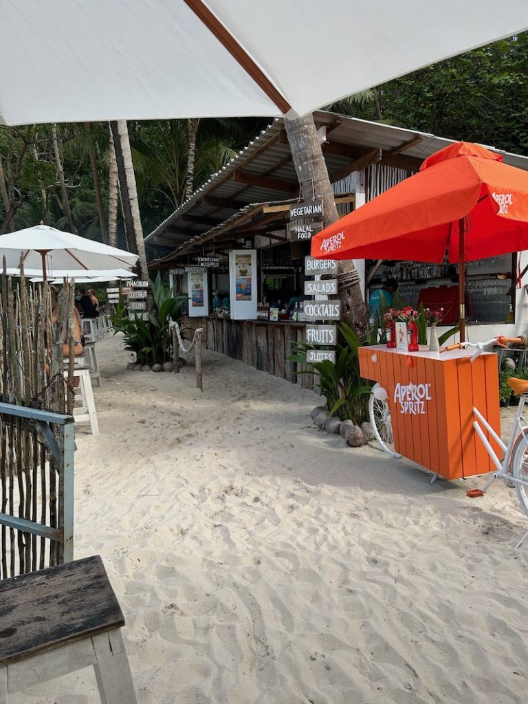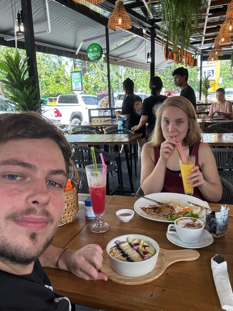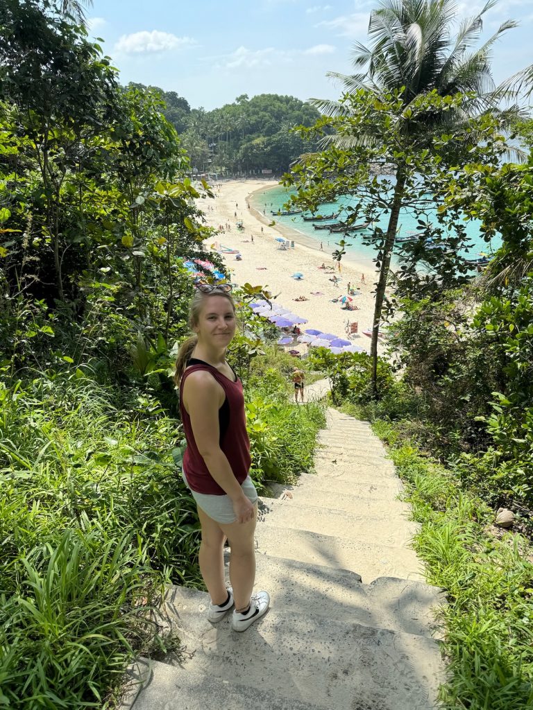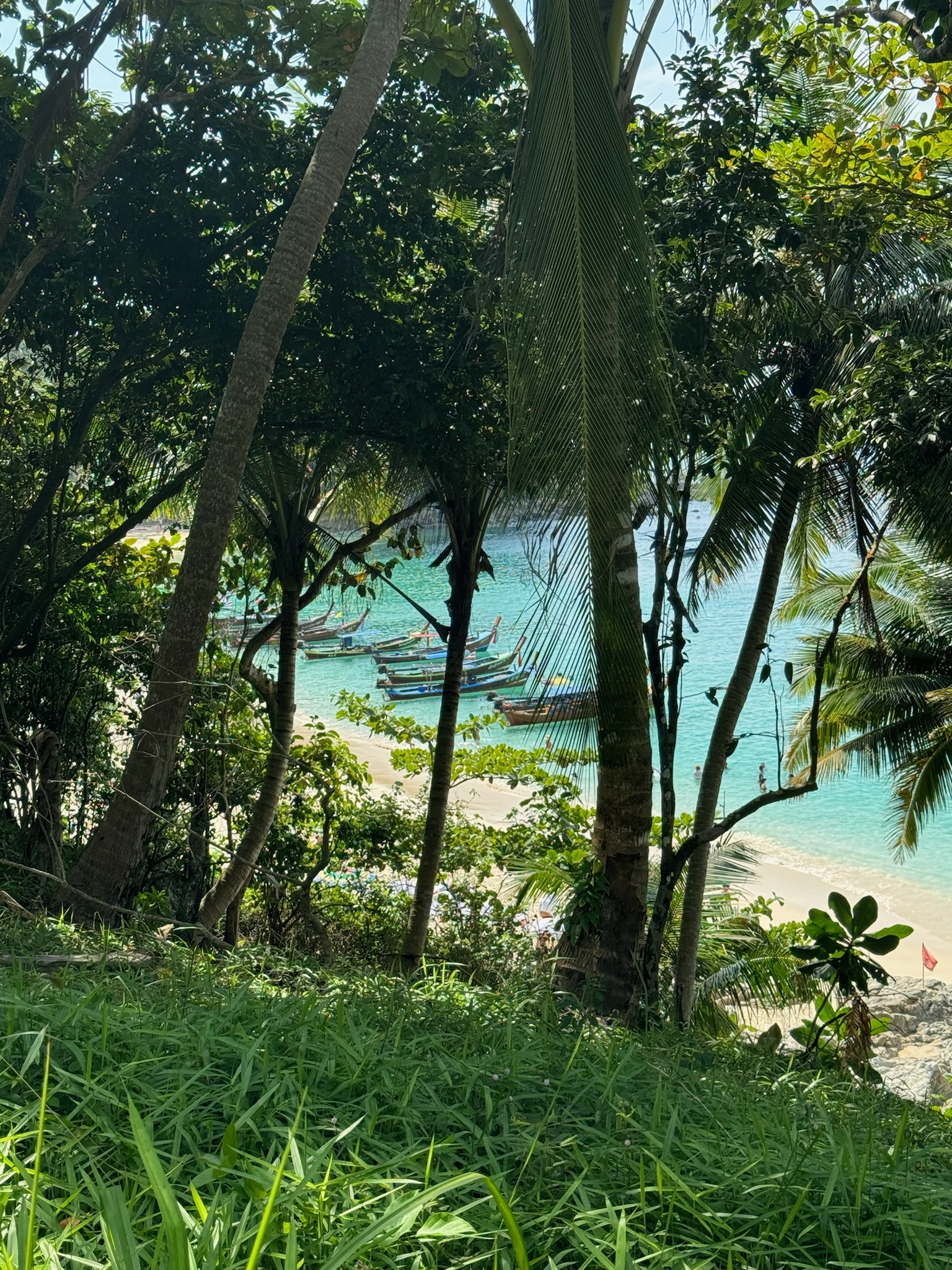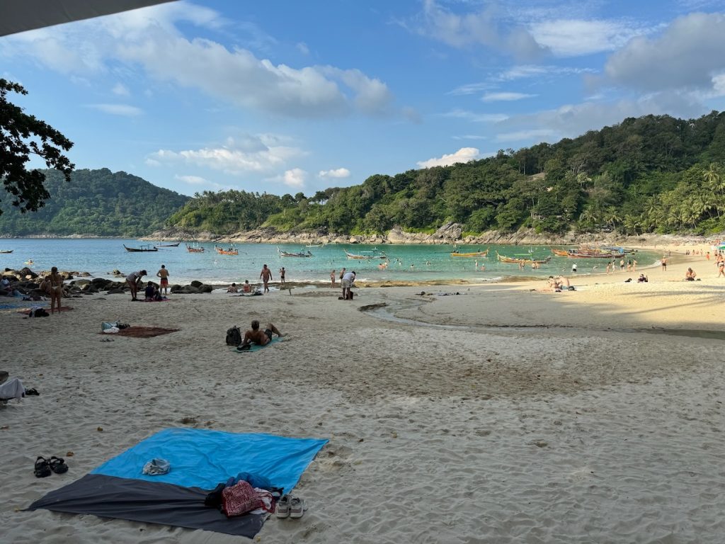Als alle gesättigt waren, ging es los. Wir haben uns vorher informiert über die schönsten Strände Phukets und dort immer wieder den Freedom Beach gelesen. Also war klar: Da müssen wir hin. Nach 20-30 Minuten Fahrt mit dem Roller waren wir in einer wunderschönen Bucht mit weißem Sand und türkisem Wasser. Der Strand ist eher abgelegen und man muss einen sehr steilen Weg gehen, um hinzukommen. Das ist zwar anstrengend, hat aber den Vorteil, dass dort nicht viele andere Touris sind. Man hätte sich auch mit einem Jeep runterbringen lassen können, aber das haben einfach mal sein lassen und „nur“ die 200 Baht Eintritt gezahlt. Wir haben uns einen Schattenplatz am Rand unter Bäumen gesucht. Am Nachmittag haben wir uns dann im Restaurant dort überteuerte Reis-Bowls und ne Coke gegönnt.