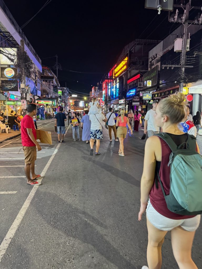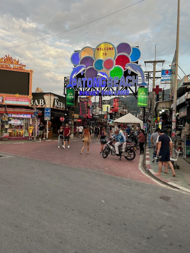 Nach ein paar Stunden haben wir den Weg zurück angetreten: Ein steiler, schweißtreibender Weg hoch zu unserem Roller, mit dem es dann zurück nach Patong ging. Witziger Moment: Einen der besoffenen Engländer aus dem Flugzeug haben wir auf den Straßen wiedergesehen. Dort angekommen setzten wir uns an den Strand von Patong zum Sonnenuntergang (ca. 18:15 Uhr), von dem man wegen Wolken leider nicht viel gesehen hat. Danach ging es zur Partymeile, der Bangla Road.