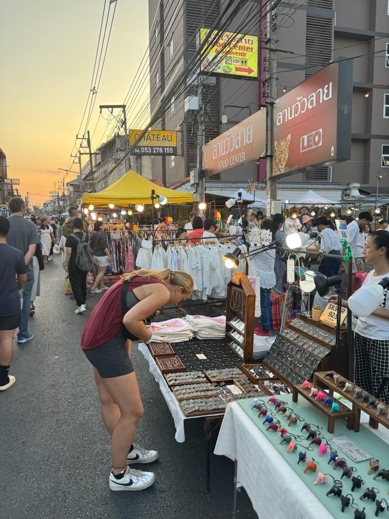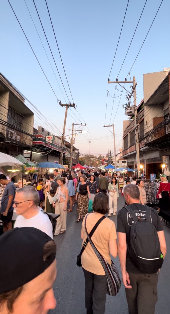 Nach einer Runde durch die Stadt ging es zum Saturday Market außerhalb der südlichen Stadtmauer. Für diese Märkte wird oft eine sonst befahrene Straße zu einer sogenannten „Walkingstreet“. Hier setzten wir uns in einen Food Court zum Abendessen. Hier sahen wir zum ersten Mal Krokodilfleisch und gegrillte Skorpione.