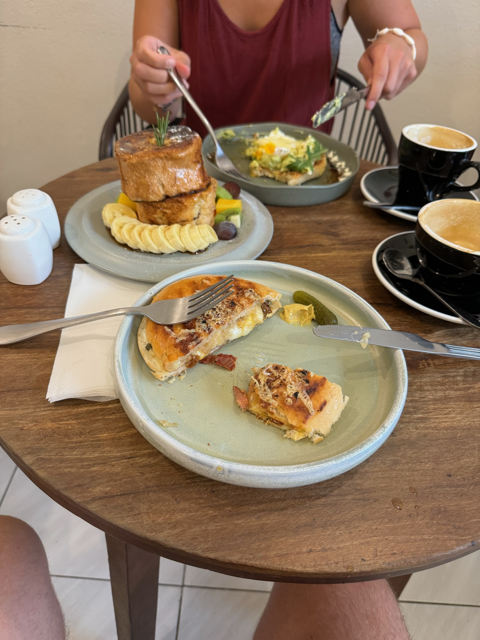 Für heute hatten wir nicht viele Pläne, also machten wir uns langsam fertig und liefen los. Das Frühstückslokal, wo Marco am Vortag was geholt hatte, hatte leider zu. Sonst gab es nichts passendes in der Nähe, deshalb wollten wir erst mal zum Rollerverleih. Den wir in der Nähe bei Google gesehen hatten, gabs nicht. Also mussten wir zum ersten Mal ein bisschen weiter, ca. 20 Minuten zu einem Verleih laufen. Von dort fuhren wir zu einem rausgesuchten Café in einem anderen Teil der Stadt, das aber heute zu hatte. Heute liefs irgendwie nicht. Daneben gab es aber ein Café, das ähnlich gut aussah, also setzten wir uns einfach da rein und bestellten uns ein geiles, teures Hippster-Essen.