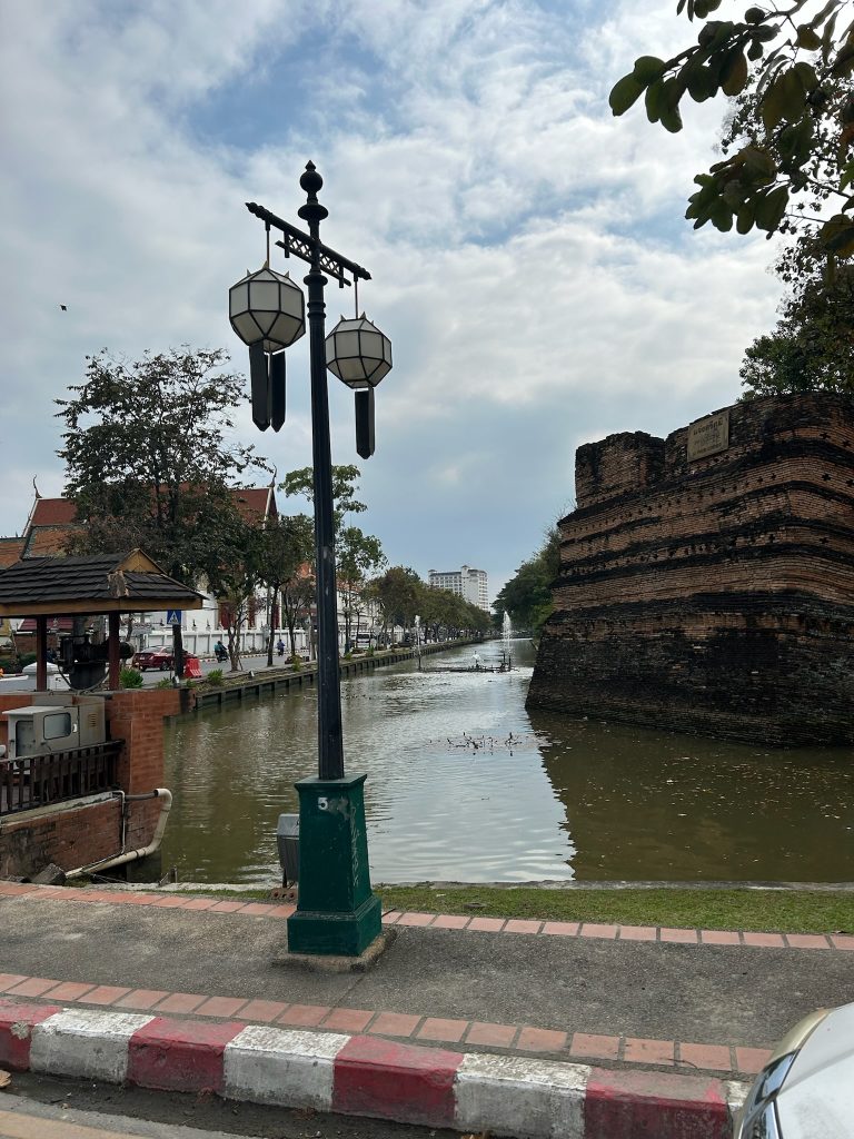 Wir machten nochmal einen Zwischenstopp im Hotel, bevor wir Mittags in die Innenstadt fuhren, die sich innerhalb einer quadratischen Stadtmauer mit Gracht befindet. Auf den Hauptstraßen ist hier echt viel los. Sonst mussten wir bisher noch nicht in einer Großstadt mit viel Verkehr Roller fahren (Chiang Rai ging klar). Wir wollten ein bisschen durch die „Old City“ laufen. Da ich keine langen Klamotten mit hatte, planten wir die Tempel für den nächsten Tag ein.