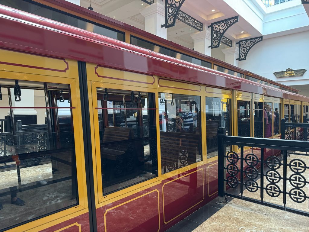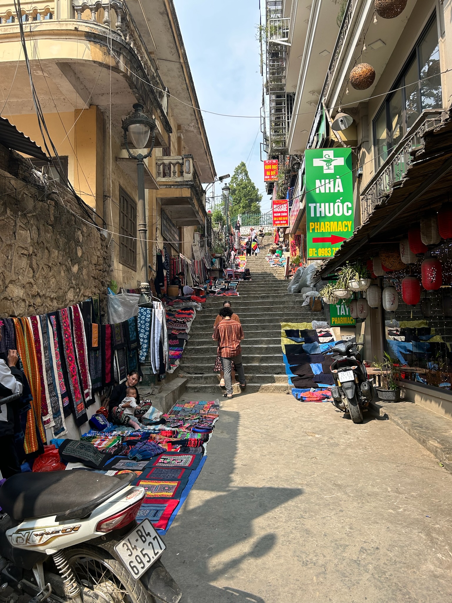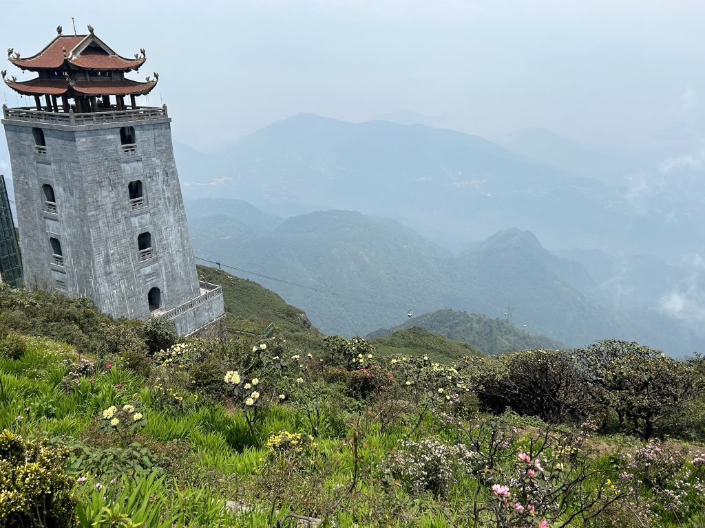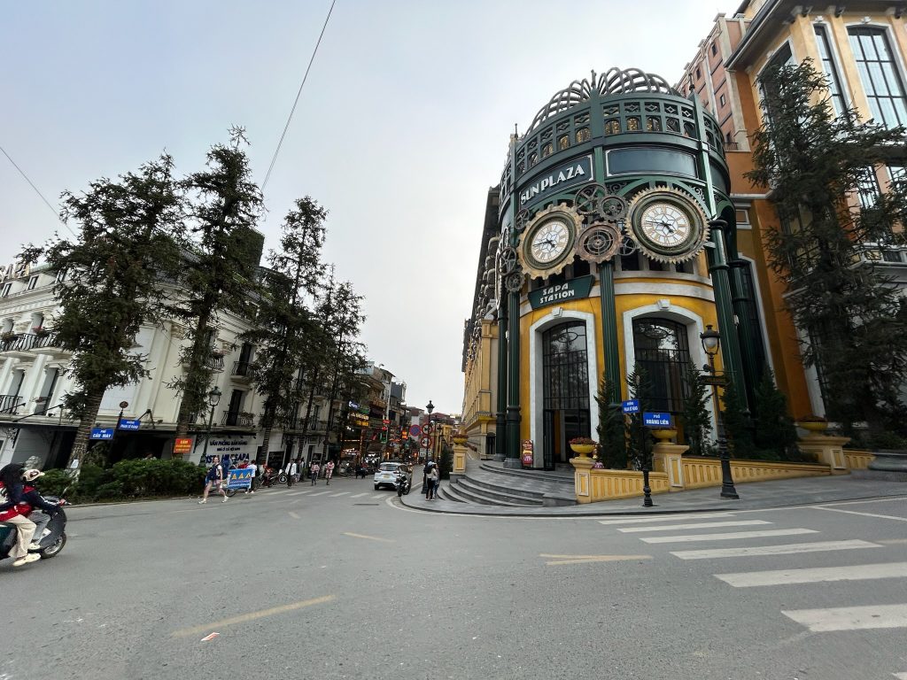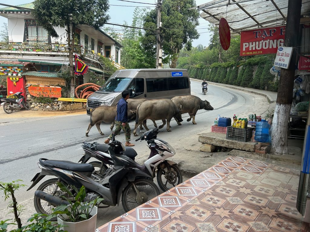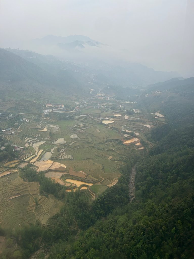 Um 9 Uhr setzten wir uns runter zum Frühstück, welches wir wieder von der Karte auswählen konnten. In der Wartezeit habe ich ein paar Postkarten geschrieben. Danach checkten wir aus und bezahlten unsere Rechnung. Heute wollten wir mit der Seilbahn auf den Fansipan / Phan Xi Pang, den höchsten Berg Indochinas (Laos, Vietnam, Kambodscha). Unser Host bot uns an, die Tickets für uns zu buchen. Wir wollten auch die Fahrt mit dem Zug aus der Stadt zur Seilbahn-Station mitnehmen (7€ Zug + 30€ Seilbahn p.P.). Wir wollten es später einfach zusammen mit unserem Abendessen vor der Abfahrt bezahlen. Also liefen wir los in die Innenstadt und nahmen um 12 Uhr den Zug zur Seilbahnstation. Die Fahrt dauerte ein paar Minuten und man hatte schon einen Blick auf die Berge.
