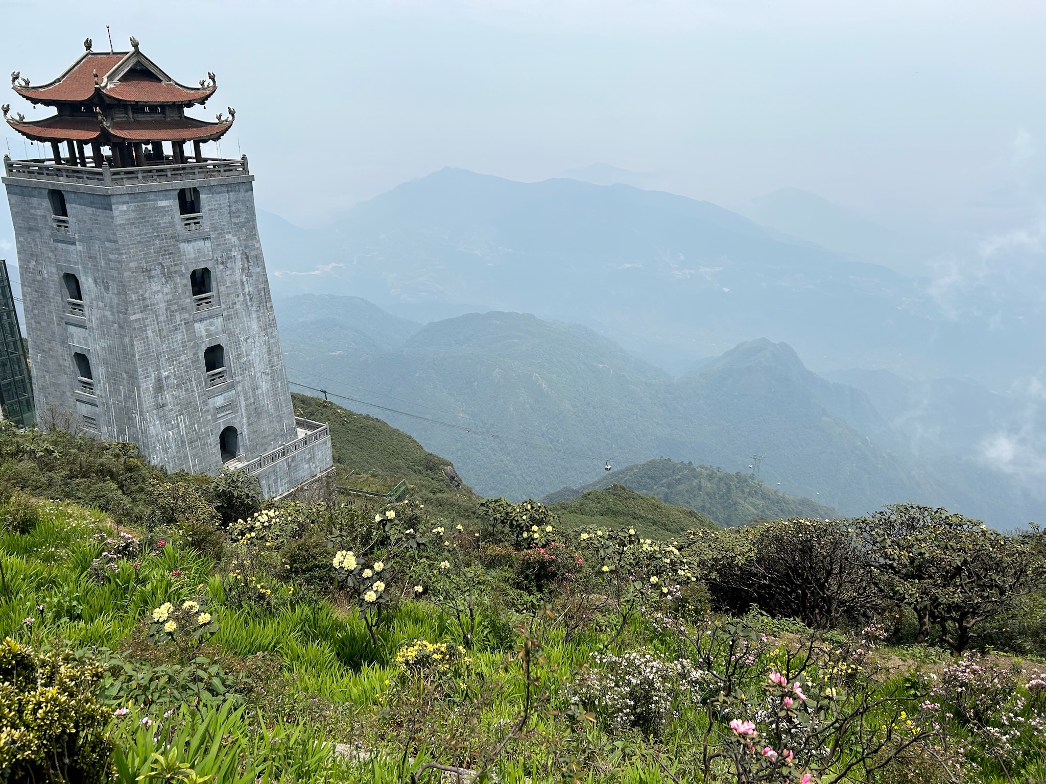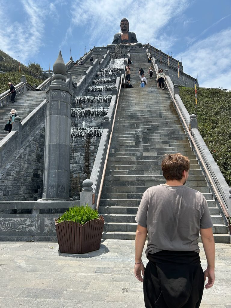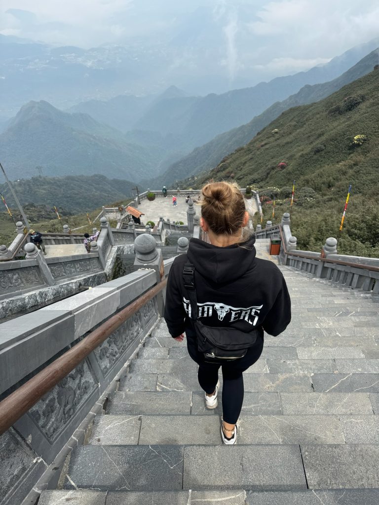 Nach dem Umsteigen und einer 30minütigen Fahrt über das Thal und den Berg hoch kamen wir gegen 13 Uhr oben an. Hier war es ganz schön kühl und windig. Wir liefen eine Stunde lang hunderte Treppenstufen hoch bis zur höchsten Spitze auf 3.143 m Höhe. Wir glaubten, man merkt schon die Höhenluft. Dabei kamen wir an einer großen Buddha Statue und einem Tempel vorbei. Wir stiegen das letzte Stück zwar durch die Wolken durch, aber oben angekommen konnten wir sogar ein bisschen Aussicht genießen.