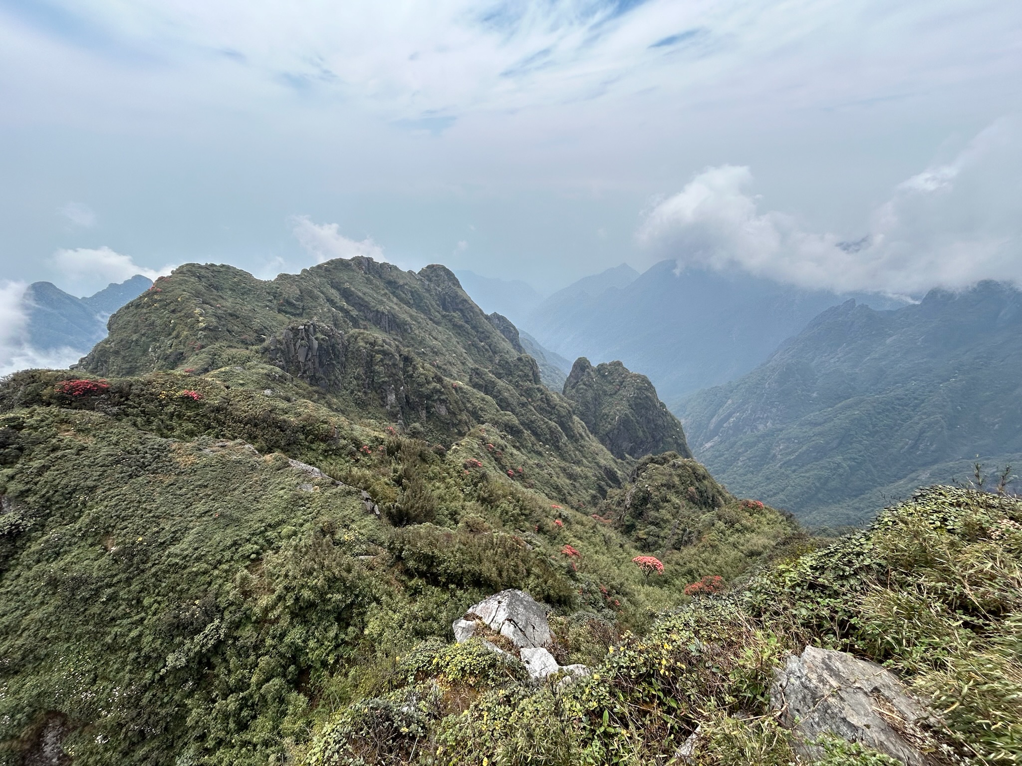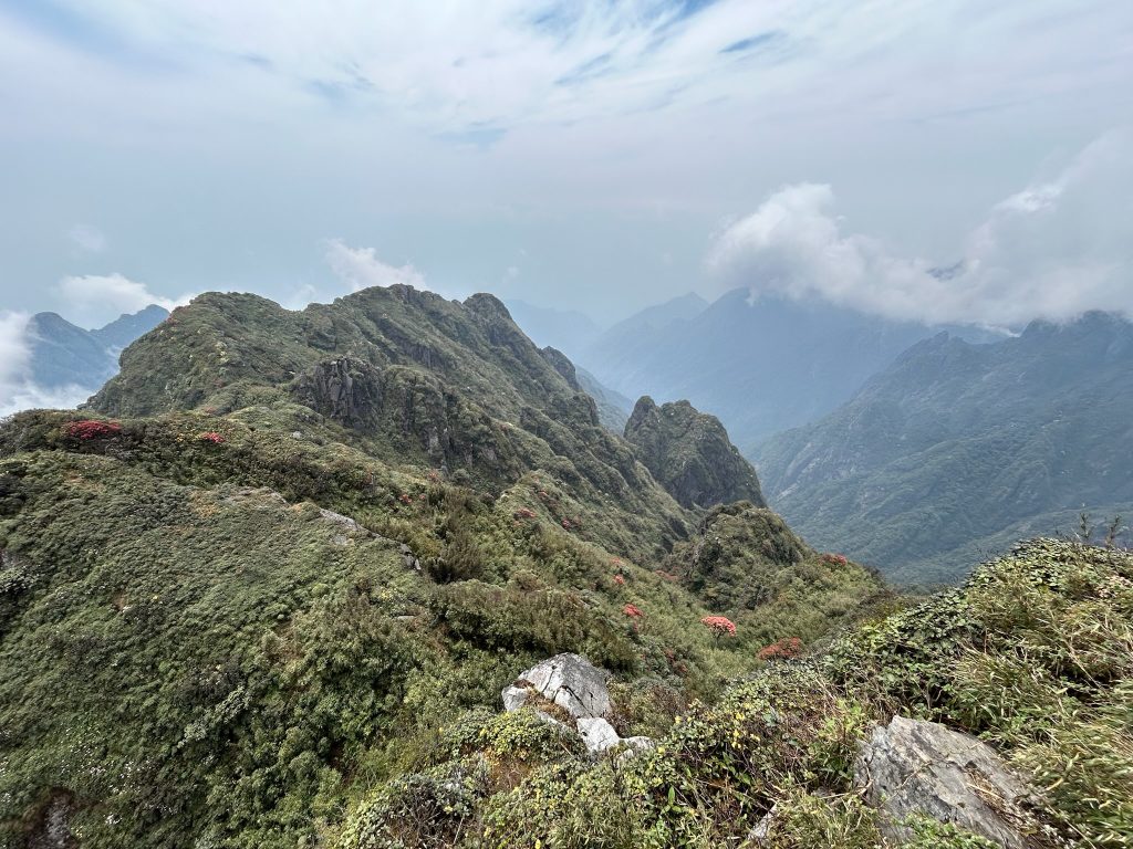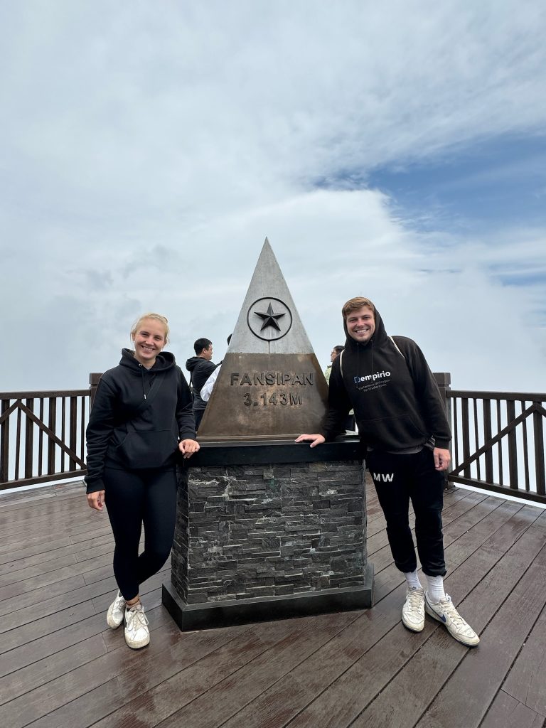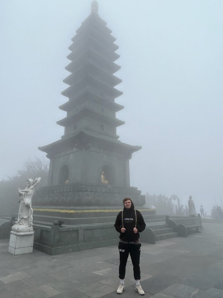 Nach dem Umsteigen und einer 30minütigen Fahrt über das Thal und den Berg hoch kamen wir gegen 13 Uhr oben an. Hier war es ganz schön kühl und windig. Wir liefen eine Stunde lang hunderte Treppenstufen hoch bis zur höchsten Spitze auf 3.143 m Höhe. Wir glaubten, man merkt schon die Höhenluft. Dabei kamen wir an einer großen Buddha Statue und einem Tempel vorbei. Wir stiegen das letzte Stück zwar durch die Wolken durch, aber oben angekommen konnten wir sogar ein bisschen Aussicht genießen.