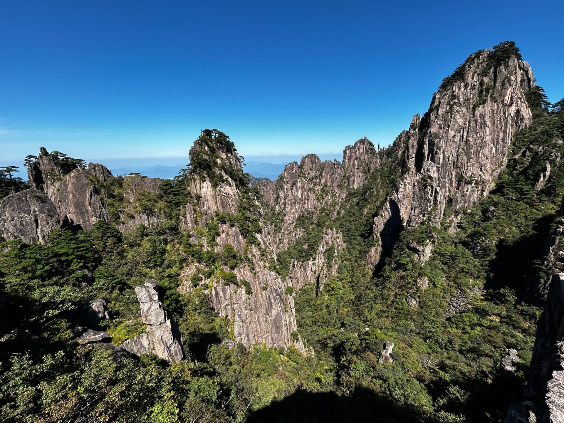 Wir hatten Frühstück inklusive, was wie erwartet komplett chinesisch war. Also gab es Bratnudeln, Ei, Süßkartoffeln und frittierten Teig zum Frühstück. Für heute hatten wir einen Ausflug auf den Huangshan Berg geplant. Um 10 Uhr fuhren wir mit dem Taxi zum Tourism Transfer Center am Hauptbahnhof. Dort kauften wir uns ein Ticket für den Shuttlebus zum Tangkou Transfer Center (4€ p.P). Hier mussten wir in einen anderen Shuttlebus (2€) umsteigen, der uns den Berg hoch bis zur Seilbahnstation brachte. Hier mussten wir Eintritt und das Seilbahn-Ticket für die Hinfahrt (zusammen 22€ p.P.) bezahlen. Bis hierher waren wir 2,5 Stunden unterwegs. Die Fahrt mit der Seilbahn dauerte ca. 15 Minuten. Hier oben waren wir auf ca. 1.800 m Höhe. Man konnte auf einem gepflastertem Weg mit vielen Stufen durch das Granit-Massiv laufen und von verschiedenen Aussichtspunkten die bizarren Gesteinsformationen bestaunen. Diesmal hatten wir endlich mal Glück und komplett blauen Himmel, sodass wir auch eine gute Aussicht hatten. Wir liefen etwa drei Stunden hier oben rum, die Kartenführung war leider sehr verwirrend.