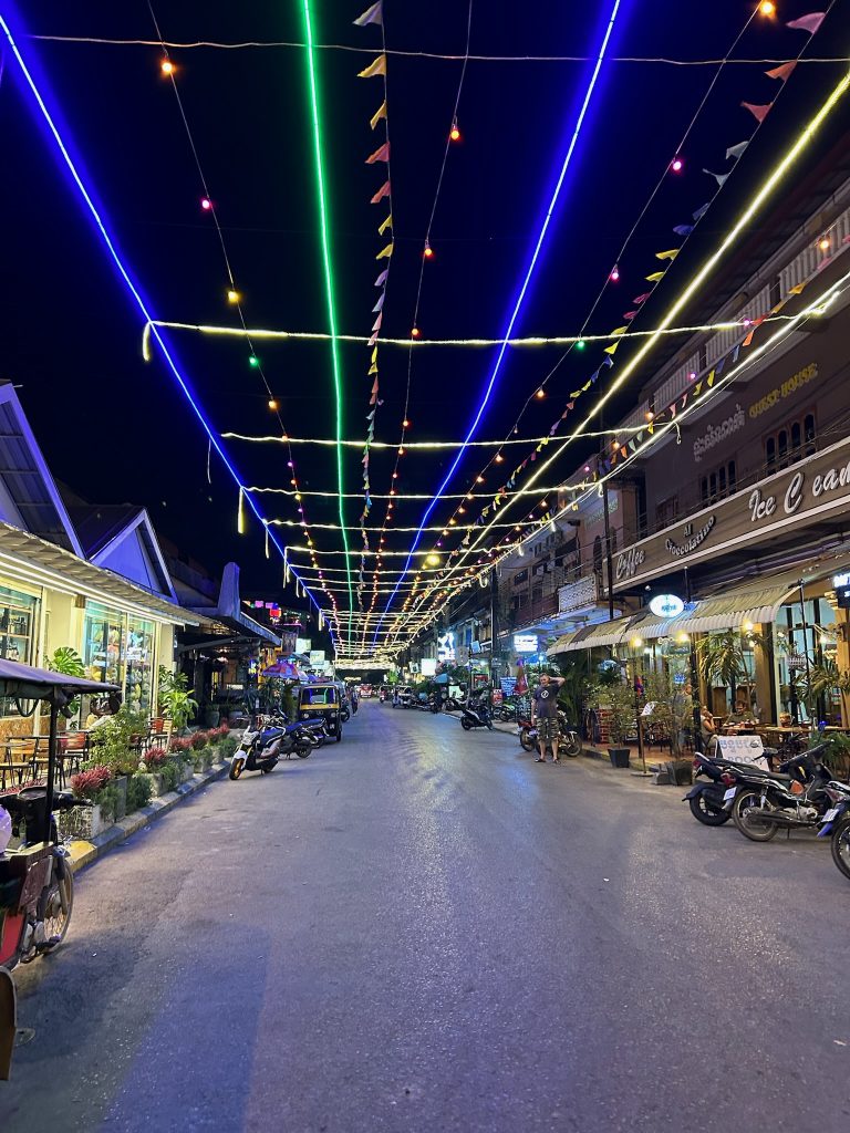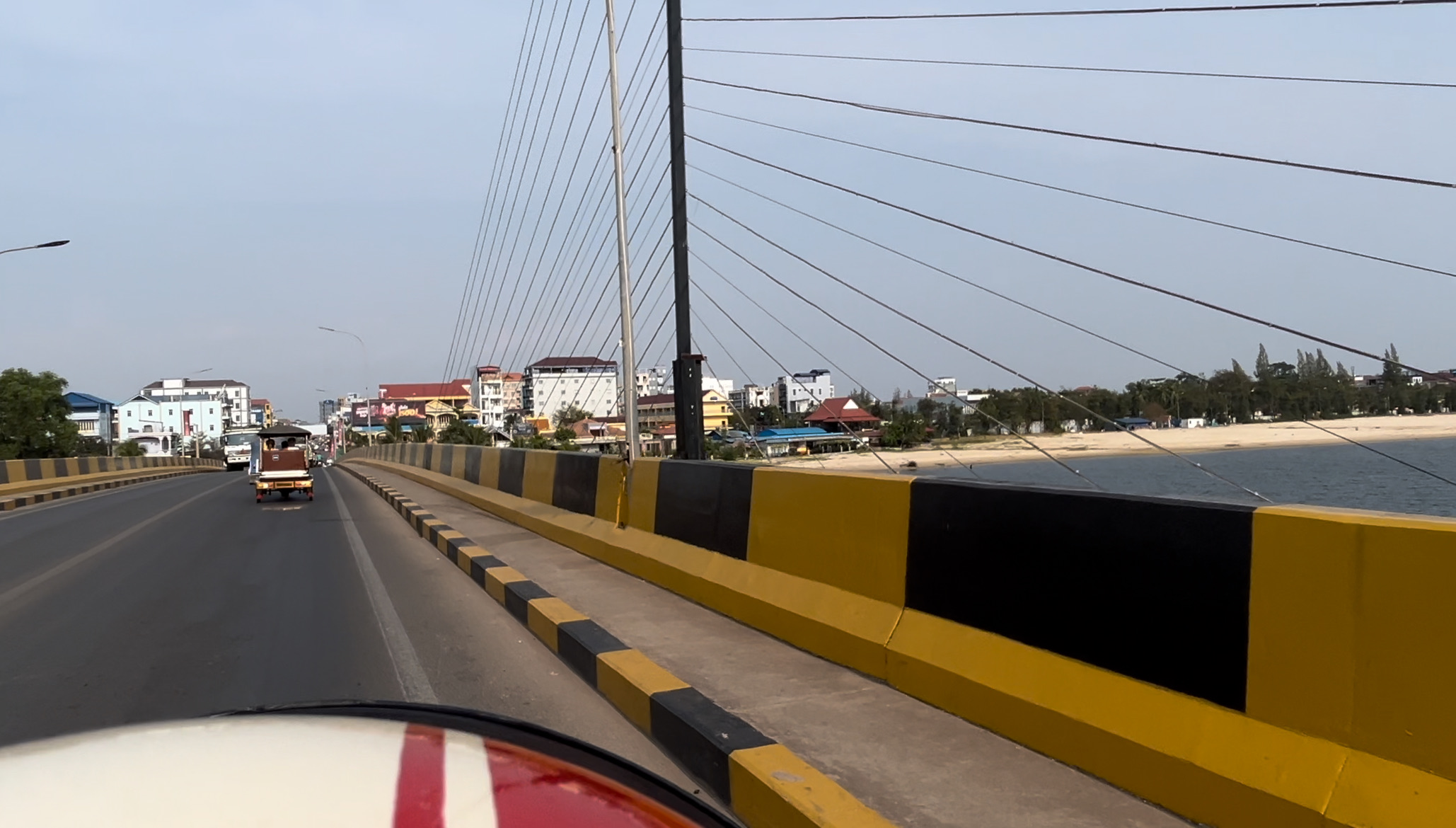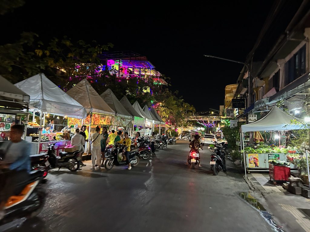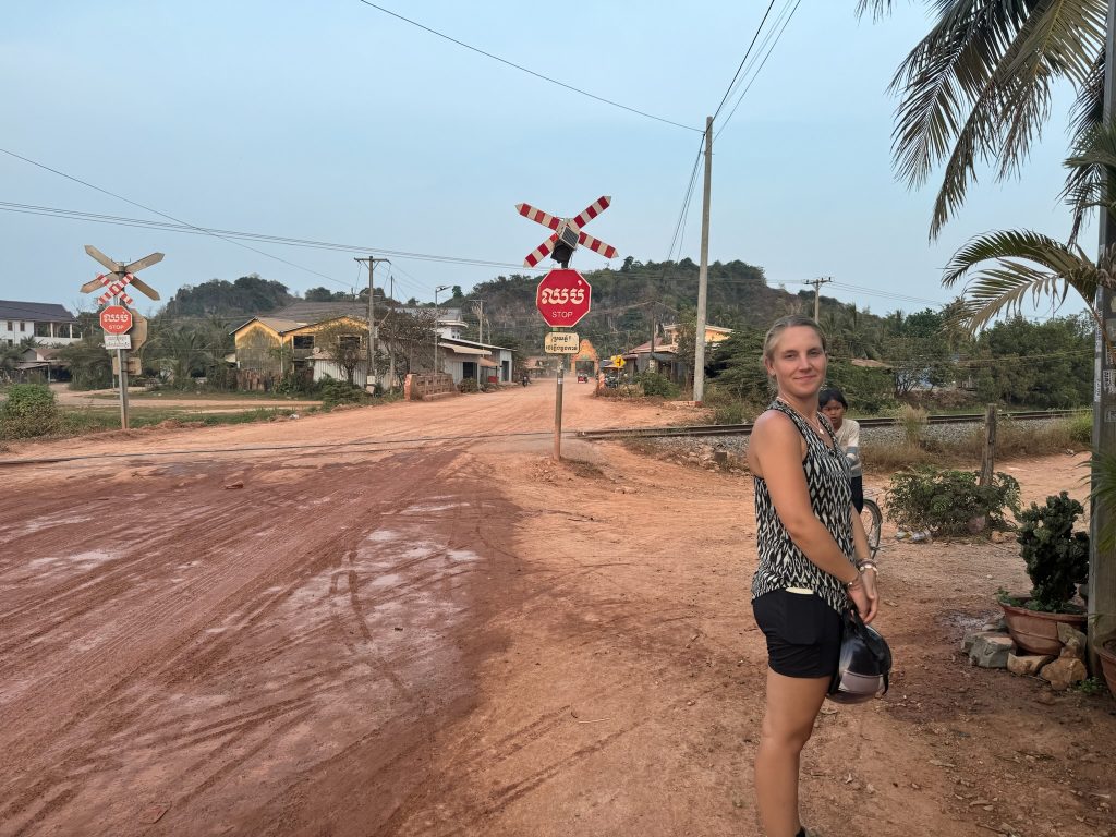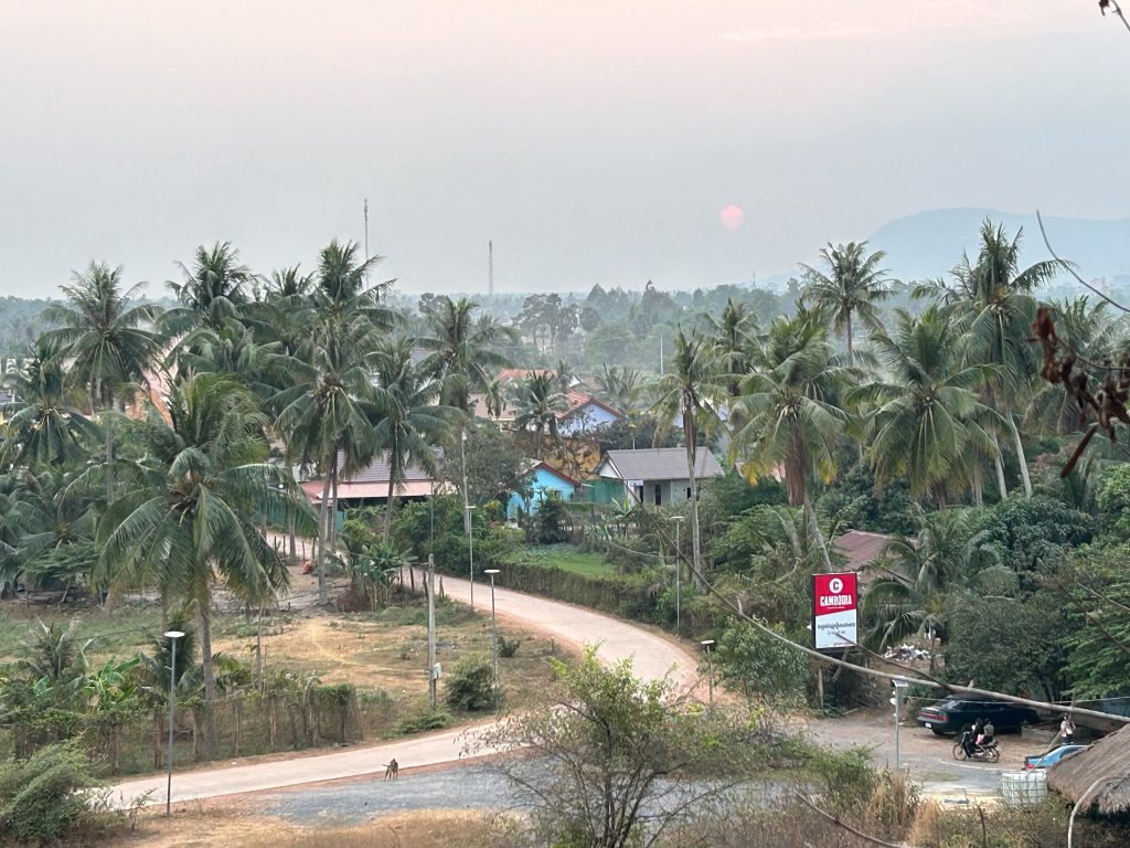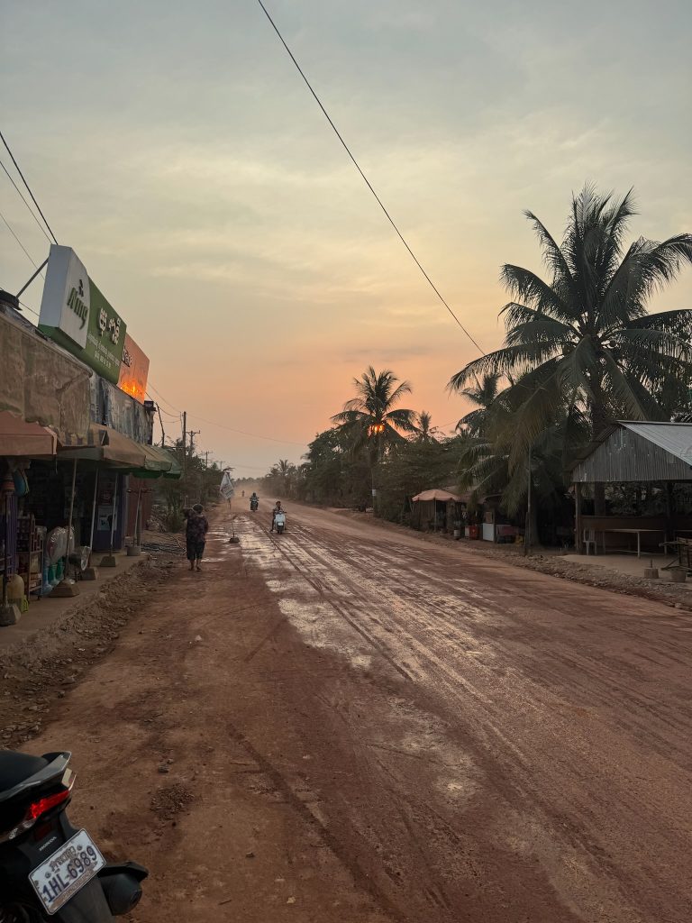 Wir wollten noch weiter zur Phnom Chhngok Cave mit dem Höhlen-Tempel fahren aber erfuhren von dem Guide, dass sie schon um 17 Uhr schließt. Also wurde das leider nichts mehr und wir überlegten, was wir stattdessen am Abend noch machen könnten. Wir wollten bei der Höhle den Sonnenuntergang schauen und fuhren los, um uns ein Getränk zu hohlen. Wir fuhren bis zur Hauptstraße zurück aber haben keinen Stand gefunden. Auf dem Rückweg zur Höhle haben wir dann zufällig noch einen Laden entdeckt und bestellten uns einen Lime-Juice. Wir kletterten ein Stück den Berg hoch und sind durch die Aktion fast zu spät gekommen aber hatten noch einen schönen Blick. Danach fuhren wir zurück in die Stadt, in ein hippes Viertel am FLuss und setzten uns dort in ein Lokal für unser Abendessen.