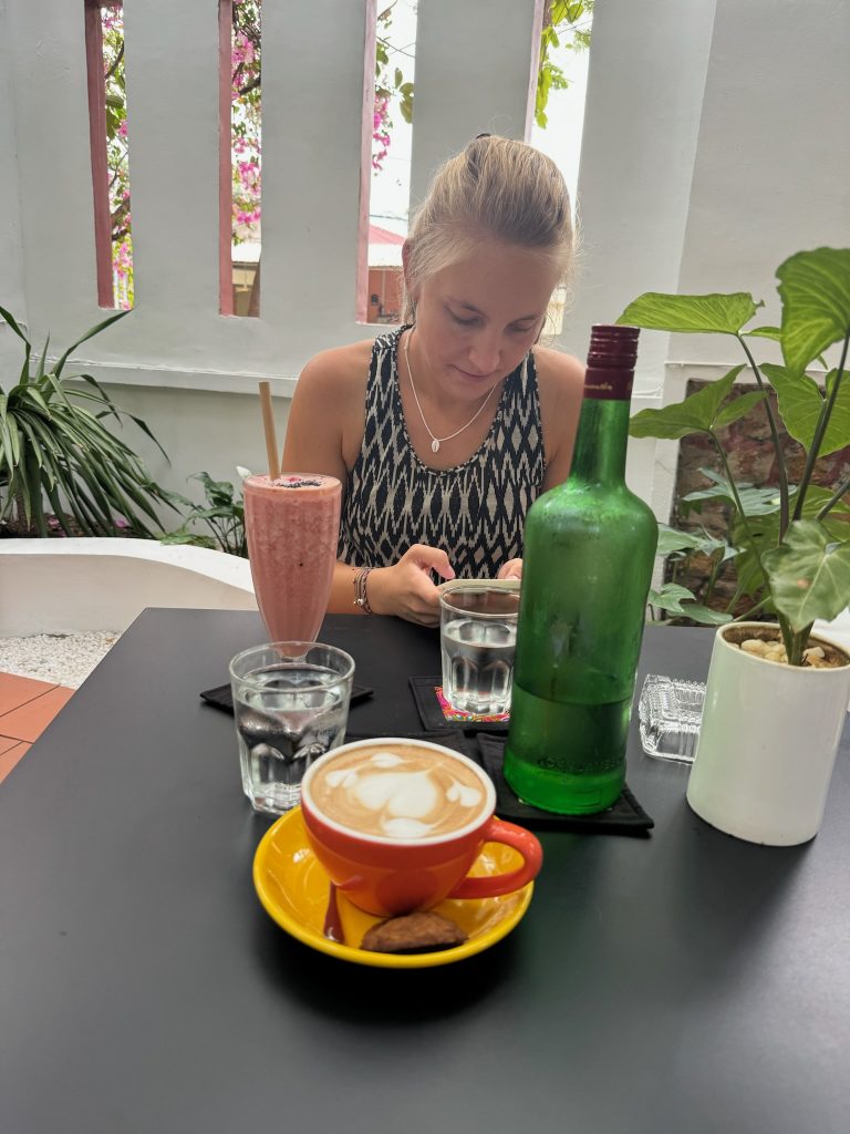 Irgendwie war es eine harte Nacht, deswegen sind wir nicht so richtig aus dem Bett gekommen. Um 10 Uhr liefen wir zu einem süßen Frühstückslokal ein paar Straßen weiter. Nach einem Zwischenstopp im Hotel fuhren wir zum Rollerverleih, um dort Bus und Fähre zur Insel Koh Rong zu buchen. Wir hatten die Strecke vorher übers Internet verglichen, aber hier ist sie ein paar Dollar günstiger und sogar eine Abholung vom Hotel mit drin. Von hier aus fuhren wir zum Bokor Nationalpark.