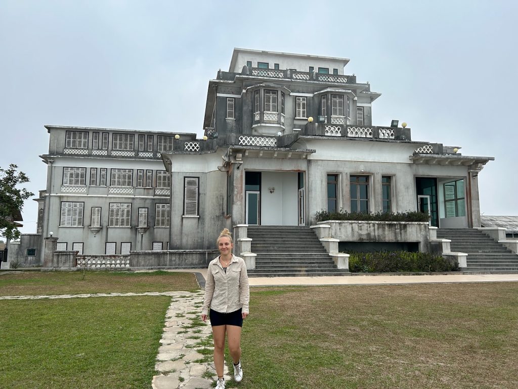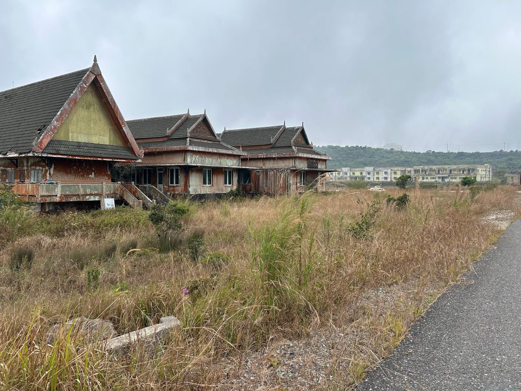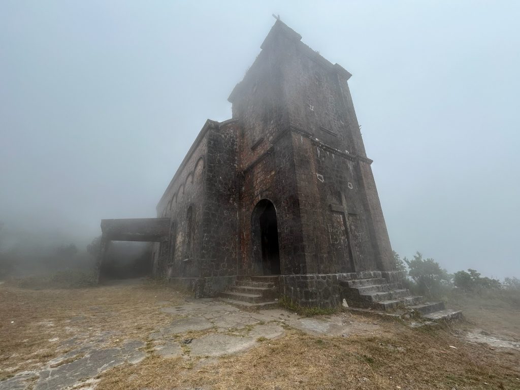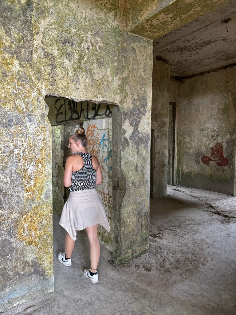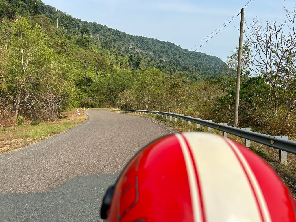 Die Fahrt dauerte ca. 1 Stunde. Die Strecke ging erst etwas aus dem Ort raus und dann auf guter Straße mit vielen Kurven den Berg hoch durch einen schönen Wald. Am Straßenrand saßen viele Äffchen. Ab einer bestimmten Höhe wurde es merklich kühler und wir fuhren auf einmal in den Nebel – das sah ziemlich mystisch aus. Auf dem Berg befindet sich die „Bokor Hill Station“. Sie war in den 1920er Jahren ein Luxusresort für Kolonialbewohner und mittlerweile eine Geisterstadt. Wegen des Nebels hatten wir leider mal wieder keine Aussicht vom Berg aus aber für die Besichtigung war der Nebel ziemlich passend. Nachdem wir das Gelände und alle zugänglichen Gebäude erkundet hatten, tankten wir hier noch, weil ich Angst hatte, dass wir mit zwei Strichen sonst nicht bis zur Stadt zurück kommen.
