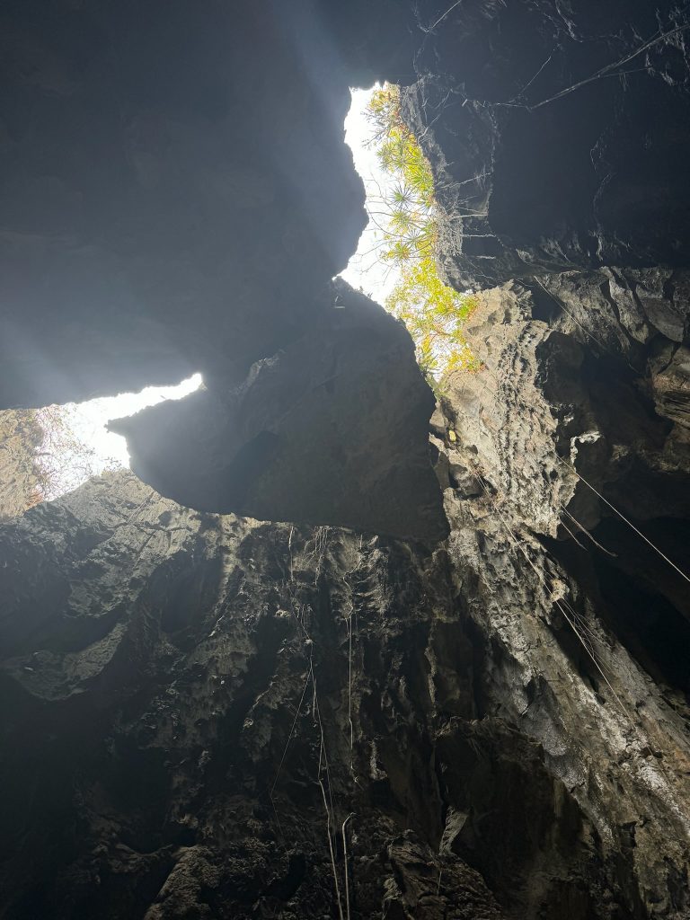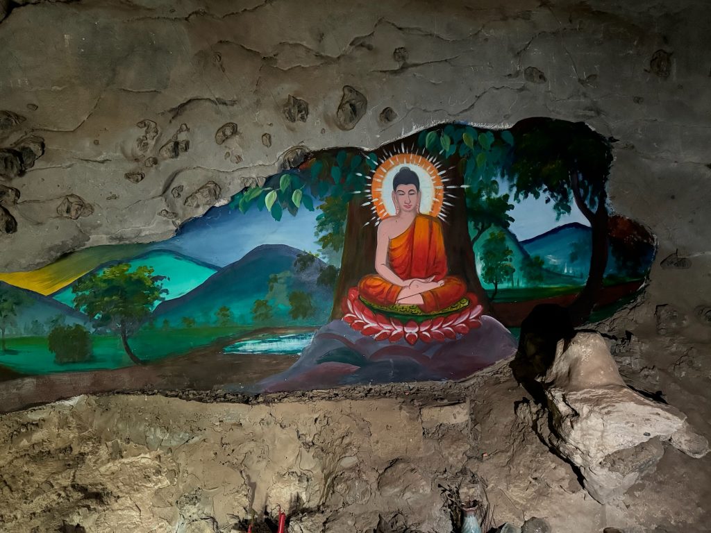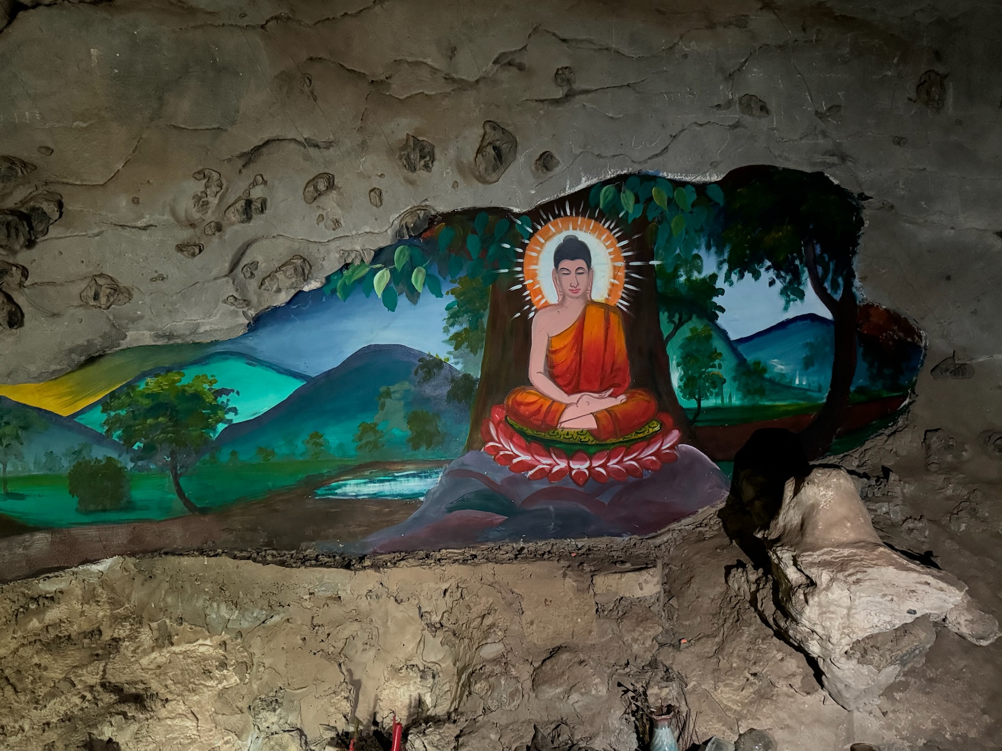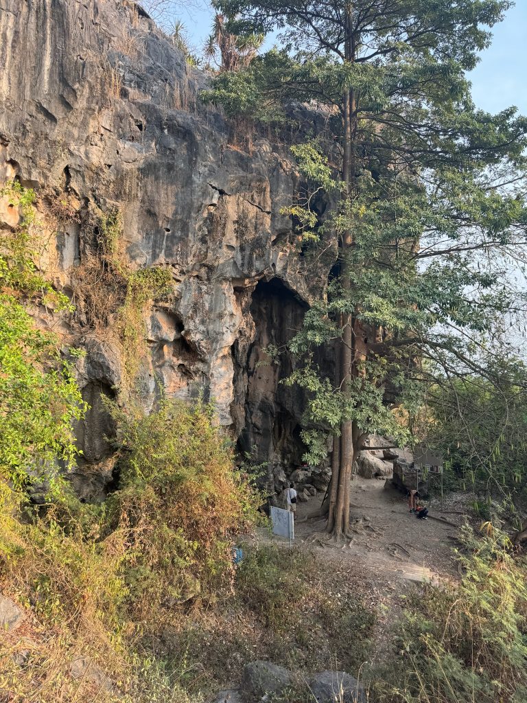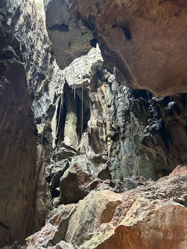 Danach wollten wir noch zu einem Höhlen-Tempel, der 30 Minuten Fahrtweg entfernt lag. Auf dem Weg hielten wir bei der Phnom Kbal Romeas Höhle, da sie am Weg lag. Der Weg hierhin führte über eine rote, super staubige Schotterstraße. Entweder wird hier gerade gebaut oder das sind die wirklichen Straßen im Hinterland von Kambodscha. Auch die Häuser und Bäume am Straßenrand waren mit rotem Staub überzogen – und später auch unsere Klamotten…Nach einem kleinen Durchgang kam man in eine große Höhle, in der man auch klettern konnte. Als wir wieder aus der Höhle rauskamen, sprach uns ein Einheimischer an, ob wir eine geführte Tour durch die Höhle (15 Minuten für 6$) haben wollen (davon hatte ich vorher gelesen). Wir willigten ein (Marco nur, weil er 6.000 Riel verstanden hatte) und liefen ihm nach durch die Höhle. Dadurch kamen wir in Bereiche, die wir selber nicht entdeckt hätten. Er zeigte uns Stalagmiten, Stalaktiten und glitzernden Kalkstein. Die meiste Zeit versuchte er uns aber zu überreden noch woanders mit ihm als Guide hinzufahren, was wir mehrmals freundlich ablehnten aber leider etwas nervig war, weil ein Nein nicht reichte.