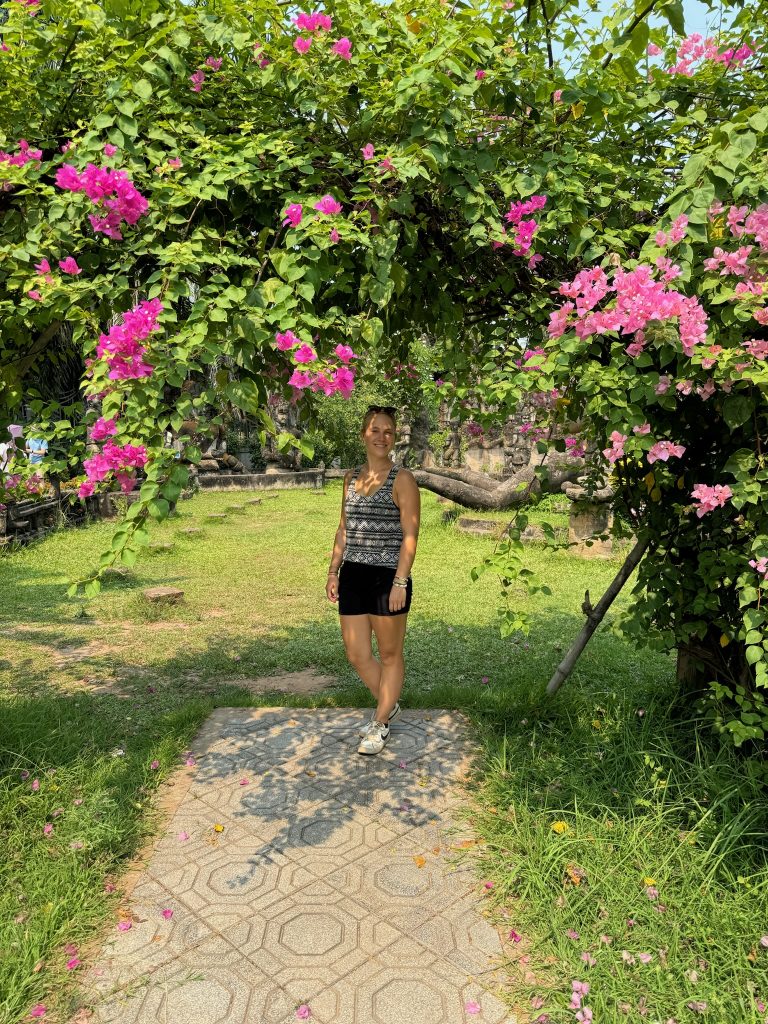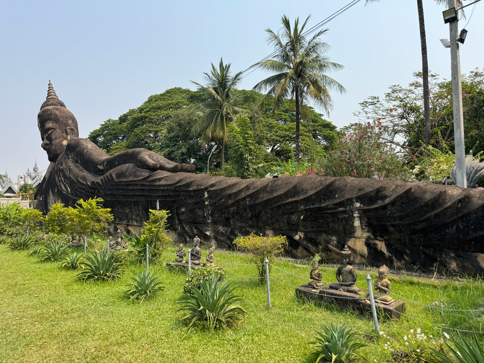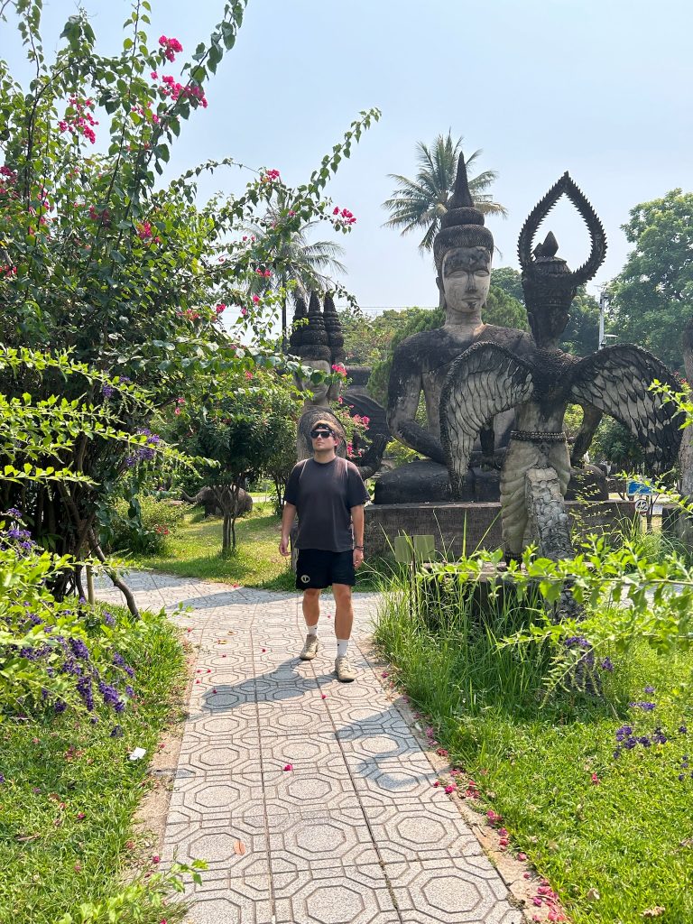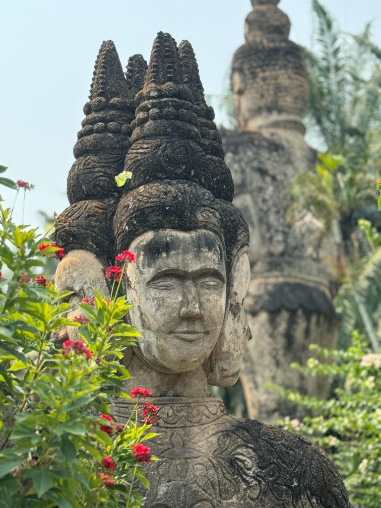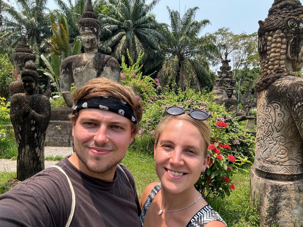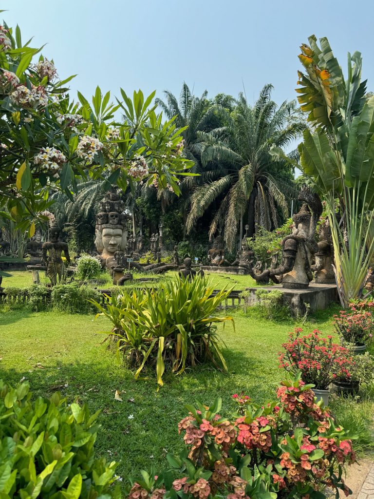 Heute morgen hieß es wieder Sachen packen (wegen Zimmerwechsel). Wir waren früh beim Frühstück, ließen unsere Rucksäcke an der Rezeption und liefen los zur CBS (Central Bus Station). Um 9 Uhr fuhr der Bus los Richtung Buddha Park. Die Fahrt dauerte 50 Minuten (80 Cent p.P.) und führte am Grenzübergang nach Thailand vorbei. Der Buddha Park ist ein Skulpturengarten mit hinduistischen und buddhistischen Skulpturen. Wir schlenderten durch den schön angelegten Park und machten eine Pause bei einem Eiskaffee. Man ist hier aber recht schnell durch und um 12 Uhr nahmen wir den Bus zurück in die Stadt. Während wir auf den Bus warteten, buchten wir ein Hostel in unserer nächsten Destination Pakse.