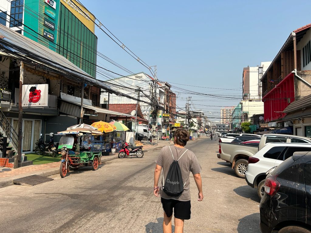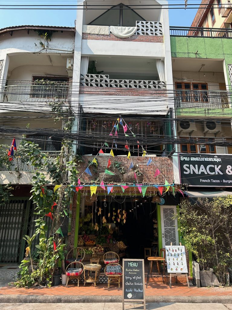 Zurück in der Stadt angekommen, gönnten wir uns einen Mittagssnack in dem hippen Café „Fruit Heaven“ bei uns an der Ecke. Im Hotel buchten wir einen Bus nach Pakse und bezogen unser altes Zimmer. Die Schiebetür wurde repariert, sodass man eine angenehme Temperatur einstellen konnte. Von dem Ausflug bei der Hitze waren wir so kaputt, dass wir erst mal drei Stunden geschlafen haben. Gegen 19 Uhr gingen wir nochmal los, Geld abheben und Abendessen im altbewährten Café Sinouk.