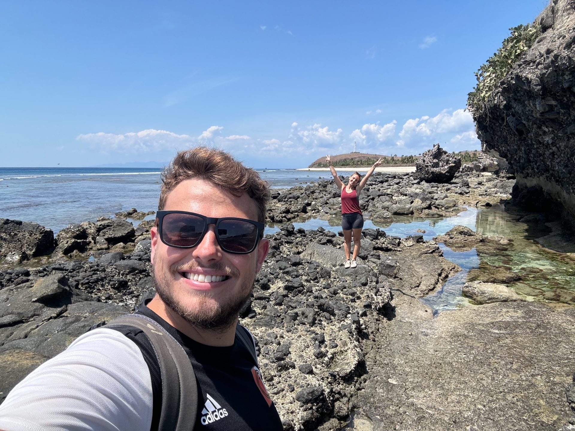 Nach dem Frühstück haben wir für uns die nächsten Tage geplant. Mittags fuhren wir dann los zum Desert Point an der Nordwest-Spitze der Halbinsel. Die Fahrt sollte 40 Minuten dauern. Das letzte Stück über den Berg war seit langem mal wieder super schlecht (Straße kann man das gar nicht nennen). Wir mussten auf der Mischung aus Sand und Steinen den richtigen Weg für den Roller suchen. Marco hat zwar mittlerweile viel Erfahrung aber es war trotzdem anstrengend. Trotz dass es hier super trocken ist und es sonst nichts gibt, leben hier ein paar Menschen. Der Desert Point ist bekannt als Surf-Spot, hier gibt es ein paar Unterkünfte, Surfcamps und Strandlokale. Endlich am Strand angekommen, sind wir einmal den Strand entlang bis zu einer Klippe gelaufen, wo es auch nicht mehr weiter ging. Danach haben wir uns in eins der Lokale gesetzt und einen Mittagssnack bestellt.