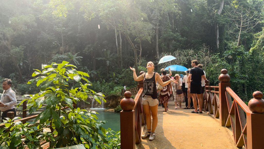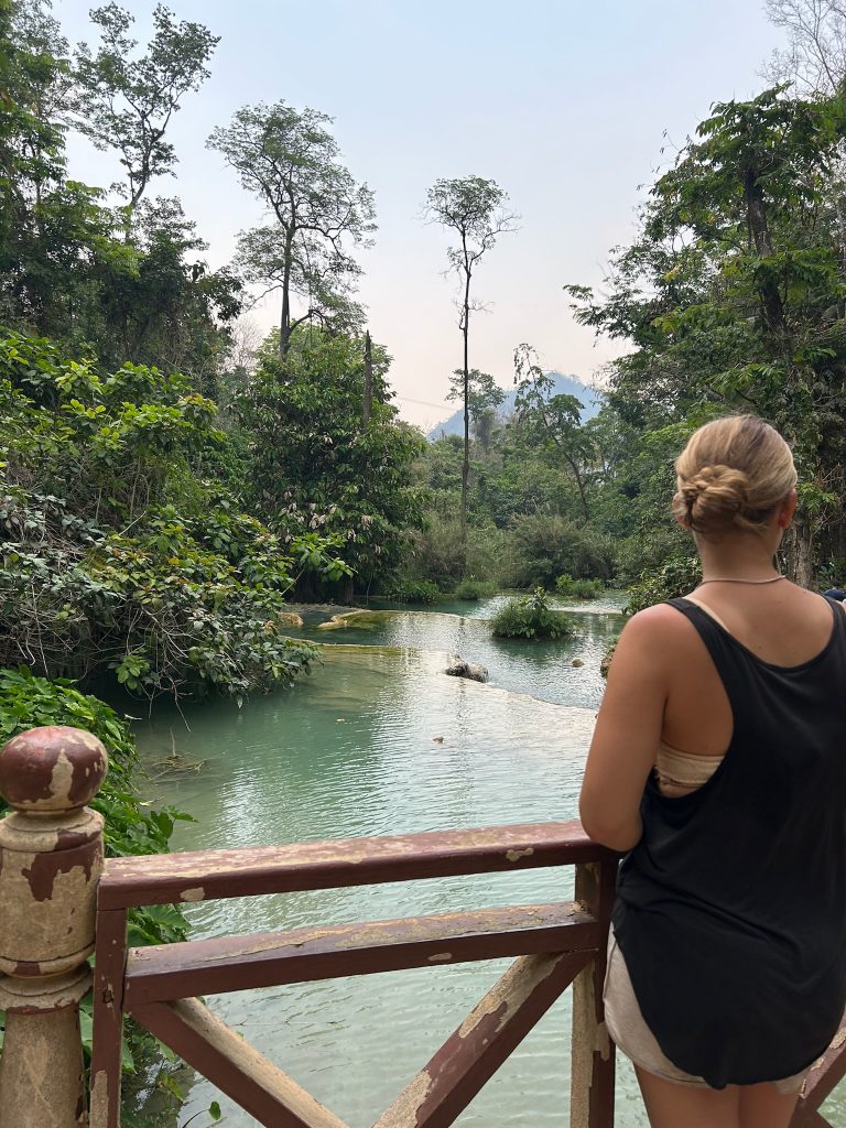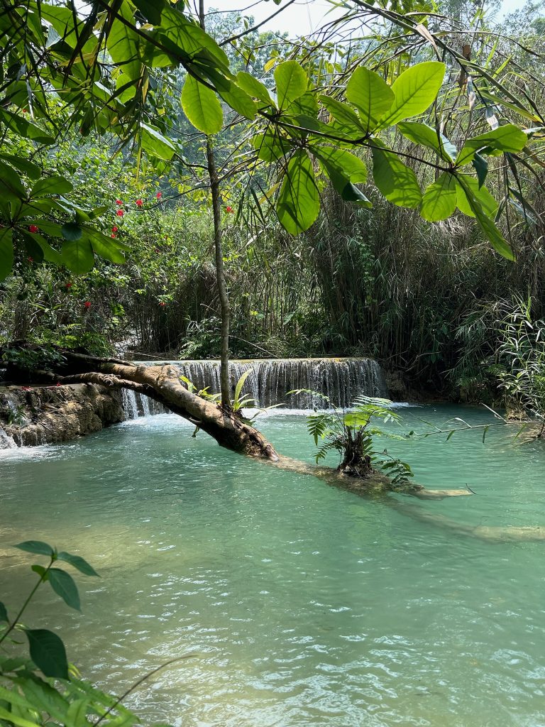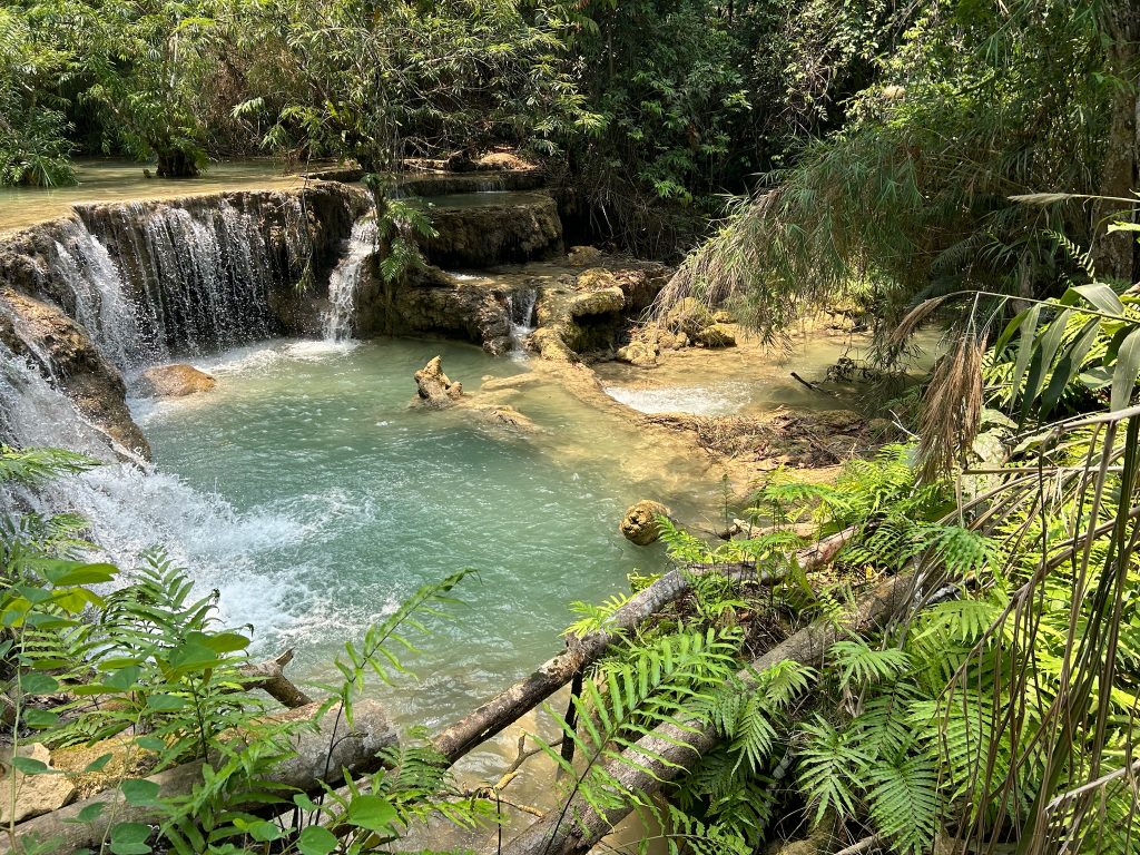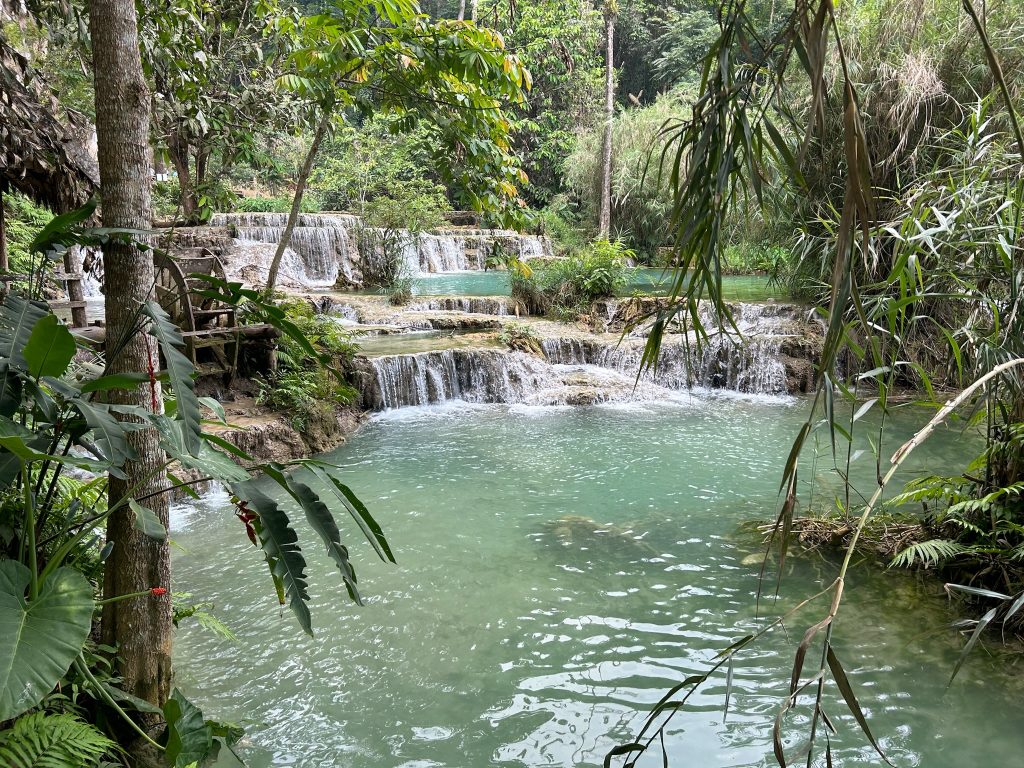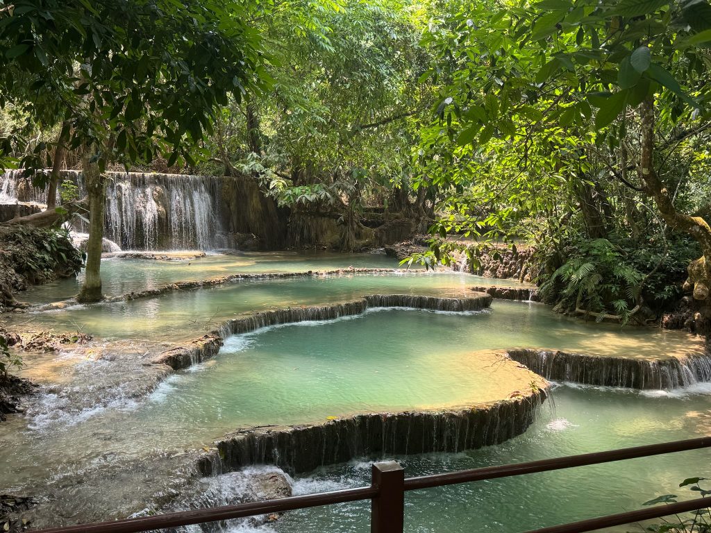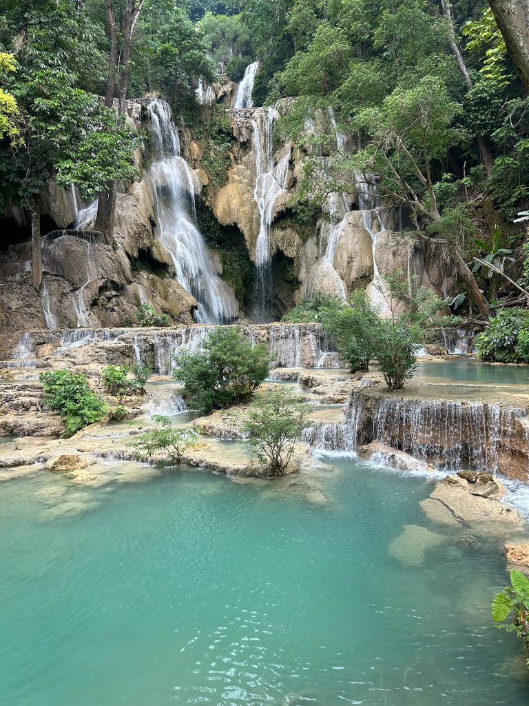 Heute mieteten wir uns nach dem Frühstück einen Roller (150.000 Kip = 6,50€). Als wir um 10:30 Uhr endlich losfahren konnten, mussten wir erst mal zu einer Tankstelle fahren. Danach fuhren wir zum Ticketschalter vom LCR (Laos-China-Railway), um uns ein Zugticket für den nächsten Tag nach Vang Vieng zu kaufen. Es waren nur noch Plätze für die Fahrt um 12:52 Uhr frei. Von hier fuhren wir weiter, insgesamt 1,5 Stunden bis zum Kuang Si Wasserfall. Dabei kamen wir an einem Elefanten Camp vorbei, wo wir von der Straße aus Elefanten (stehend in einem Käfig für die Touristen) sehen konnten. Gegen 13 Uhr kamen wir beim Parkplatz zum Wasserfall an. Wir kauften ein Ticket (2,60€) und wurden mit einem Golfcart zum Eingang gebracht. Von hier mussten wir noch ein Stück zum Wasserfall laufen. Der Weg führte an einer Bear Sanctuary vorbei, die Tiere aus der Gefangenschaft rettet, wo wir kleine süße moon bears gesehen haben. Obwohl wir nicht mehr so viel Bargeld dabei hatten, spendeten wir ein paar Euros.