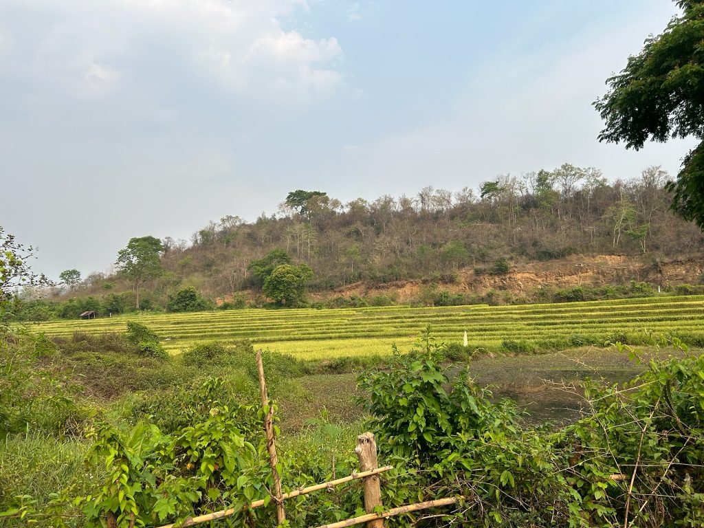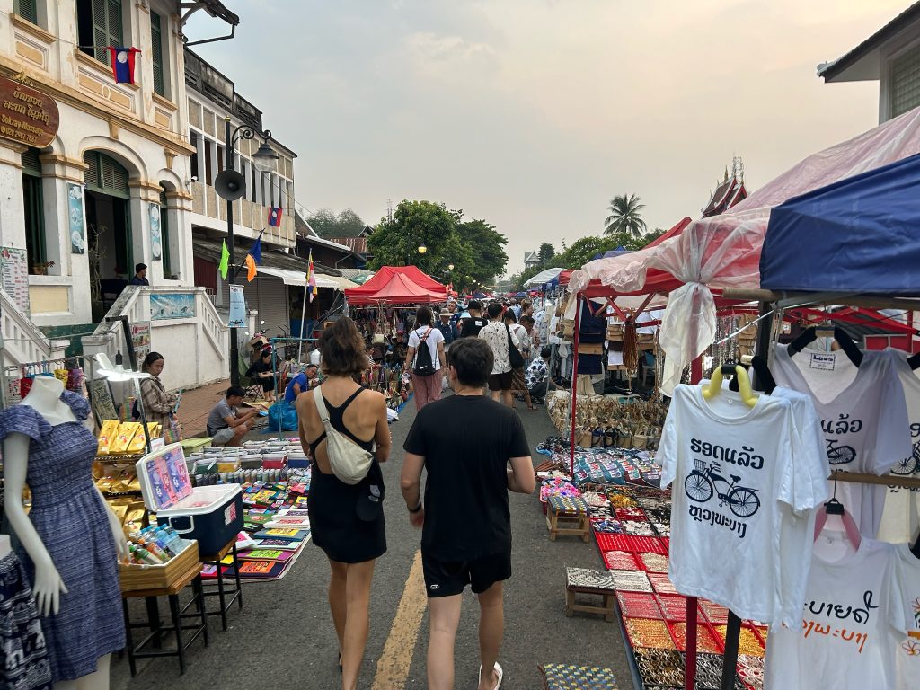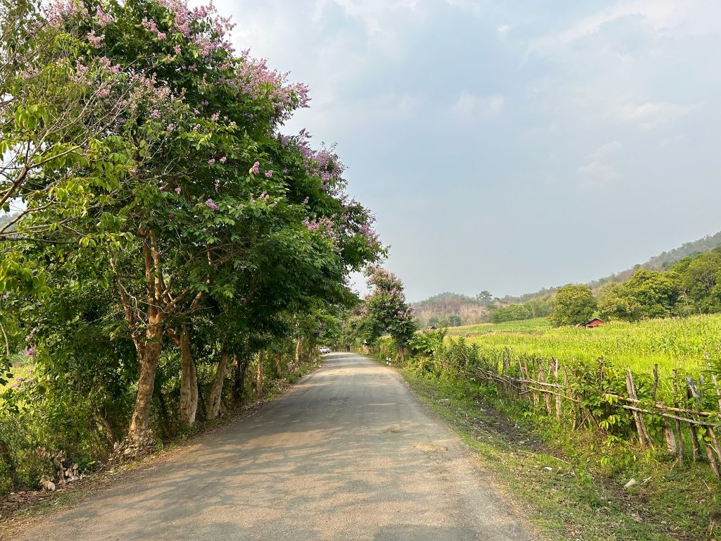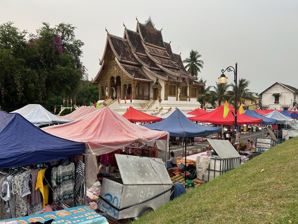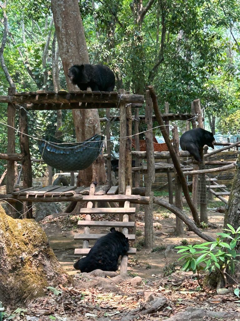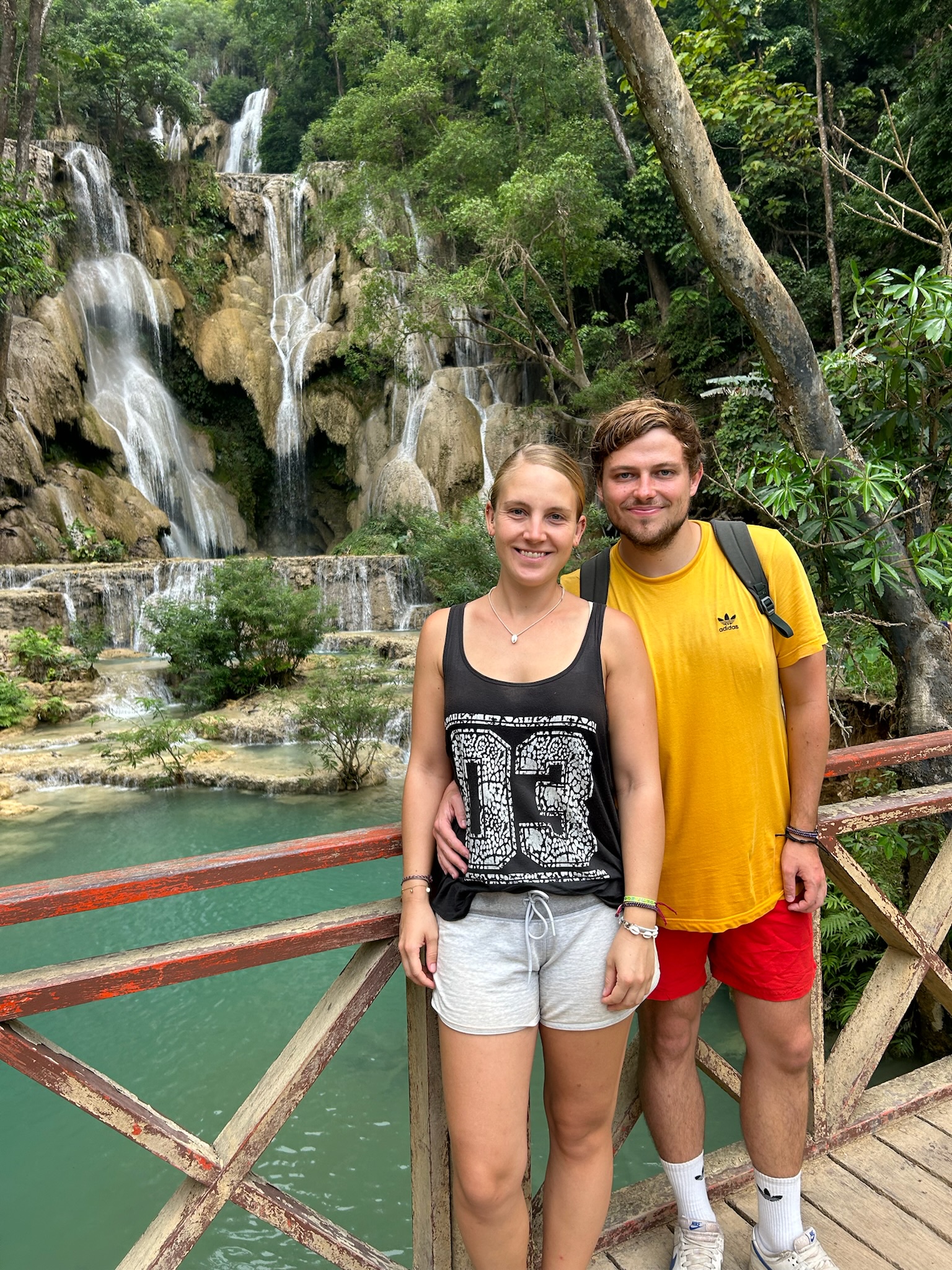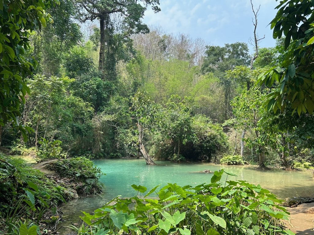 Heute mieteten wir uns nach dem Frühstück einen Roller (150.000 Kip = 6,50€). Als wir um 10:30 Uhr endlich losfahren konnten, mussten wir erst mal zu einer Tankstelle fahren. Danach fuhren wir zum Ticketschalter vom LCR (Laos-China-Railway), um uns ein Zugticket für den nächsten Tag nach Vang Vieng zu kaufen. Es waren nur noch Plätze für die Fahrt um 12:52 Uhr frei. Von hier fuhren wir weiter, insgesamt 1,5 Stunden bis zum Kuang Si Wasserfall. Dabei kamen wir an einem Elefanten Camp vorbei, wo wir von der Straße aus Elefanten (stehend in einem Käfig für die Touristen) sehen konnten. Gegen 13 Uhr kamen wir beim Parkplatz zum Wasserfall an. Wir kauften ein Ticket (2,60€) und wurden mit einem Golfcart zum Eingang gebracht. Von hier mussten wir noch ein Stück zum Wasserfall laufen. Der Weg führte an einer Bear Sanctuary vorbei, die Tiere aus der Gefangenschaft rettet, wo wir kleine süße moon bears gesehen haben. Obwohl wir nicht mehr so viel Bargeld dabei hatten, spendeten wir ein paar Euros.