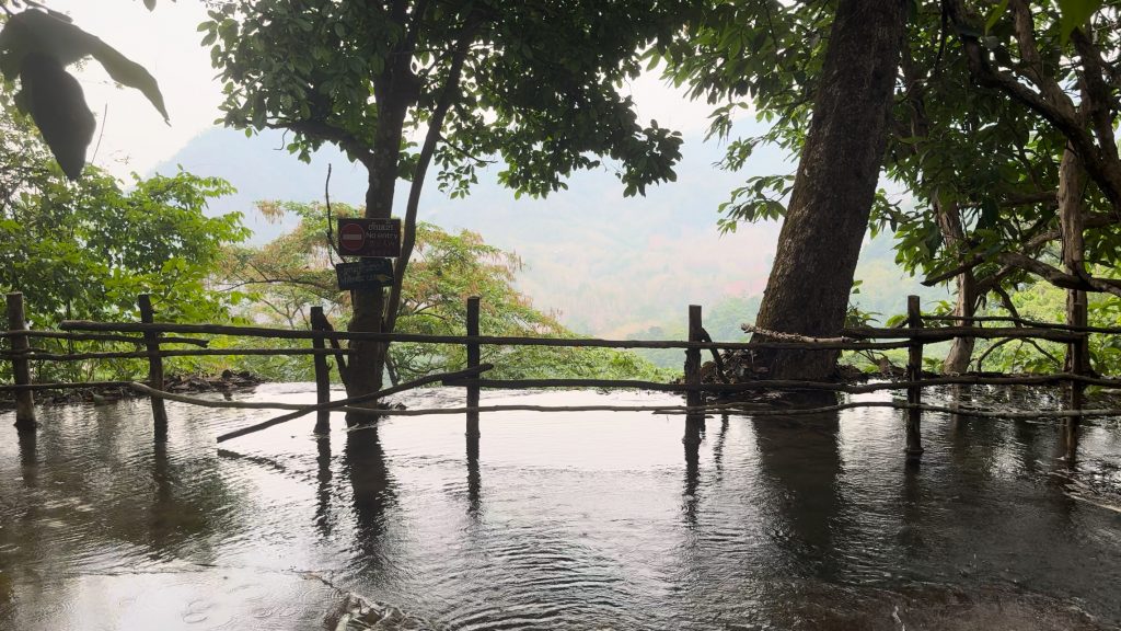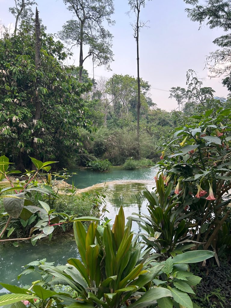 Anschließend liefen wir zum Hauptwasserfall, vor dem eine Brücke entlang führt und wo man nicht schwimmen darf. Durch das türkisfarbene Wasser sieht er super schön aus. Wir machten uns noch an den Aufstieg zum Top des Wasserfalls über einen steilen Pfad durch den Wald. Dabei fing es an zu regnen. Hier oben fließt ein Fluss den Berg runter und man kann eine Bootsfahrt bis zur Quelle machen. Auf der anderen Seite führte der Weg über eine Metall-Treppe wieder runter. Wir gingen an den Becken entlang zurück zum Eingang, kauften uns mit dem letzten Bargeld noch ein Wasser und fuhren mit dem Golfcard zurück zum Parkplatz.