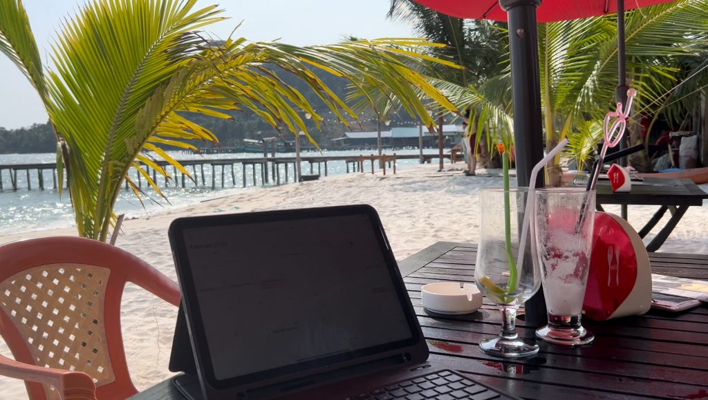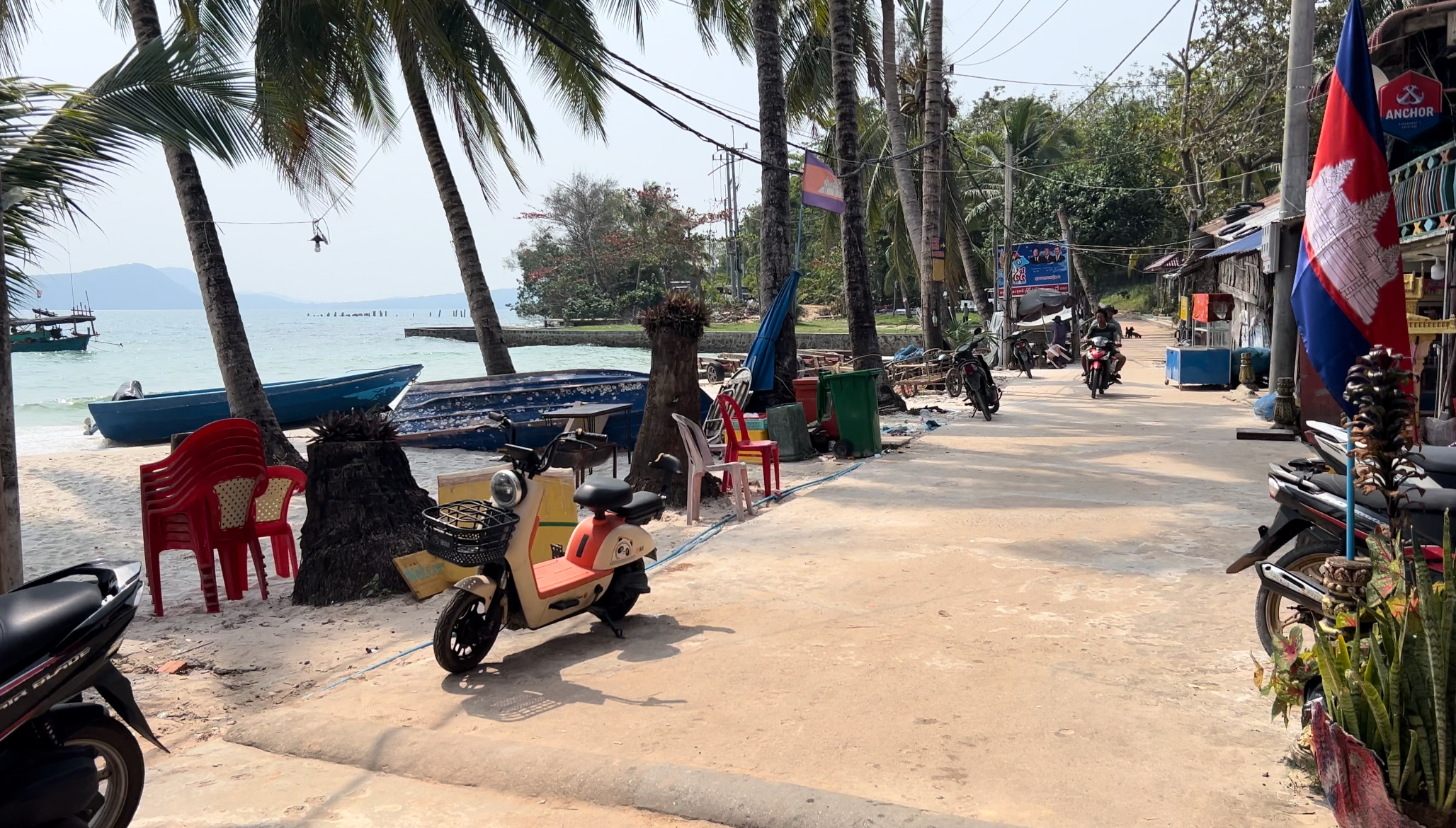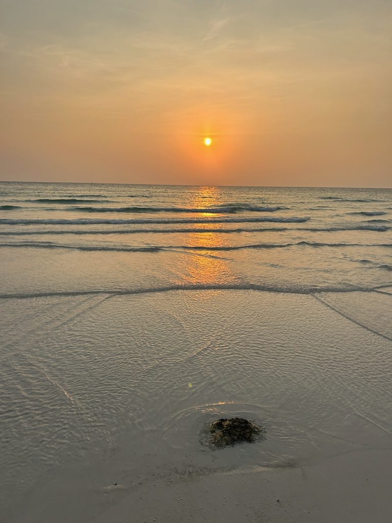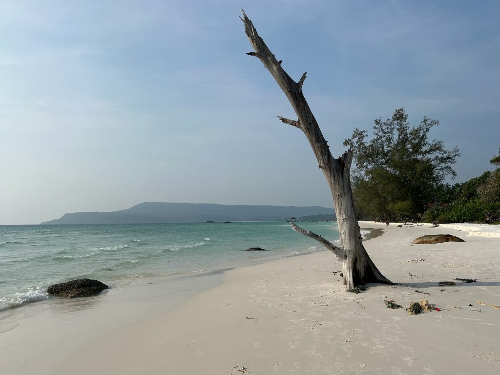 Heute liehen wir uns einen Roller für drei Tage. Nach dem Frühstück fuhren wir nach Nordwesten zum Sok San Beach. Der Anfang der Straße aus dem Ort raus ist super sandig und kiesig, aber die restliche Straße der Insel ist zwar schmal (reicht für die Roller, Tuk Tuks und wenigen Autos) aber gut ausgebaut. Am Strand angekommen, setzten wir uns in ein Strandcafé, aßen einen Mittagssnack und planten ein bisschen.