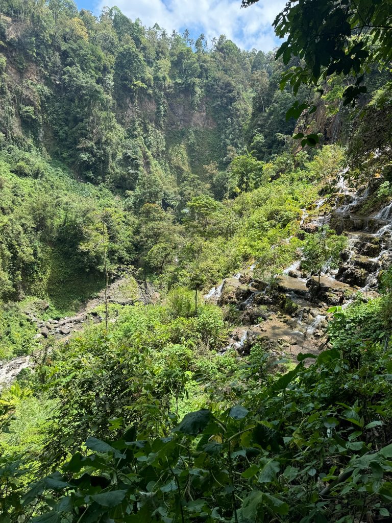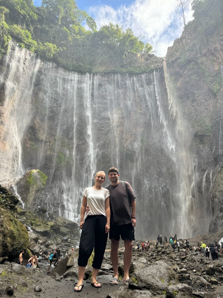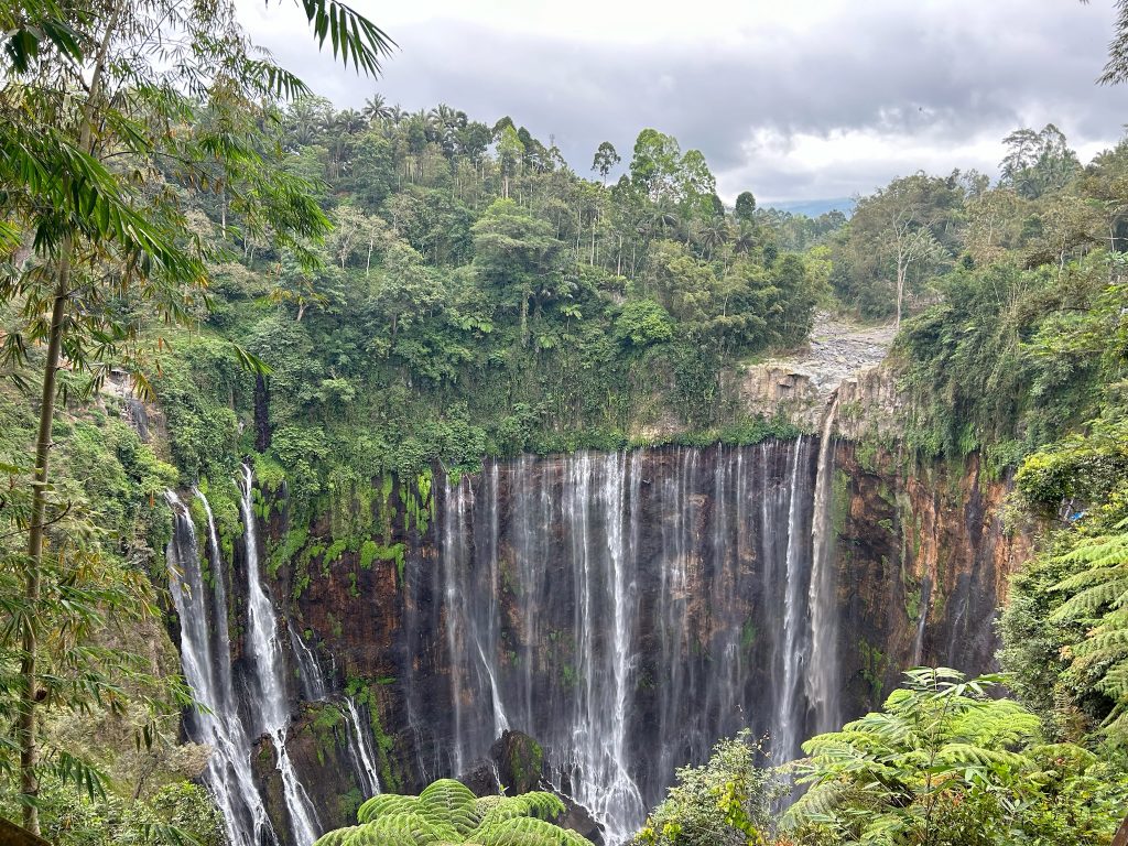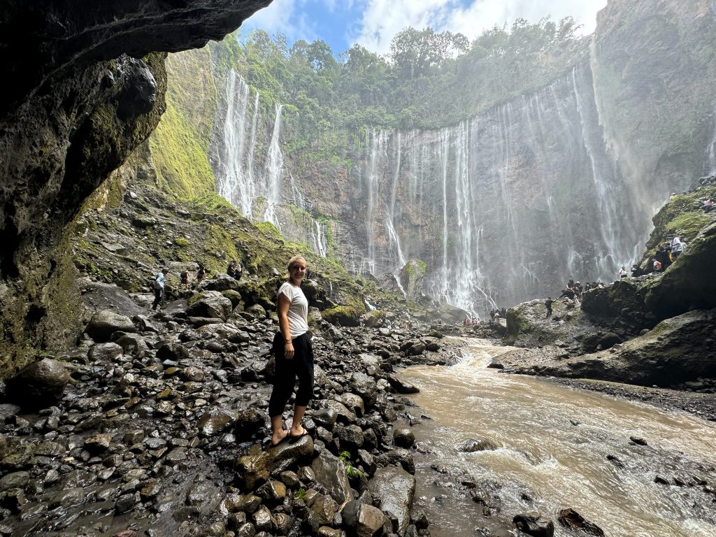 Es hieß sehr früh aufstehen, weil wir um 05:30 Uhr schon von einem Fahrer abgeholt wurden…Das Hotel war so lieb und hat uns ein kleines Frühstück (Toast mit Marmelade und Früchten) zum Mitnehmen vorbereitet, da wir eigentlich Frühstück inklusive hatten. Nachdem wir eingestiegen waren, fuhren wir noch eine halbe Stunde durch die Stadt, um noch ein anderes Pärchen einzusammeln. Der Fahrer war irgendwie verpeilt, er hat den Weg nicht gefunden und dazu waren auch noch Straßen wegen eines autofreien Sonntags gesperrt. Die Fahrt zum Wasserfall dauerte ca. zwei Stunden. Nachdem wir aus dem großen Ort Malang rausgefahren waren, ging die kurvige Strecke durch den Wald an einem Berghang entlang. Beim Parkplatz angekommen, machten wir eine kurze Pause und unser Guide ist zu uns gestoßen. Zuerst gingen wir zu einer Aussichtsplattform, wo man auf die Wand schauen kann, wo der Wasserfall in die Schlucht fällt (130m). Danach ging der steile Abstieg nach unten, zuerst über eine schmale Treppe, später durch einen Wasserfall hindurch. Gut, dass wir vorher ein bisschen über den Wasserfall gelesen hatten und uns noch Flipflops eingesteckt hatten. Wir folgten dem Guide durch den Canyon bis vor den Wasserfall. Hier waren super viele Menschen, aber der Guide führte uns durch den Fluss durch auf die gegenüberliegende Seite. Hier hatten wir Zeit, um ein paar Fotos zu machen und den Anblick zu genießen. Hier war es ziemlich nass, feucht, windig und dadurch kühl.
