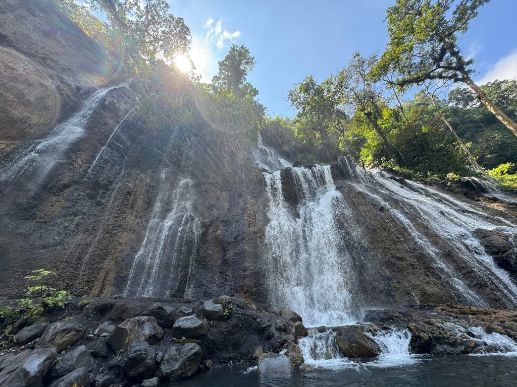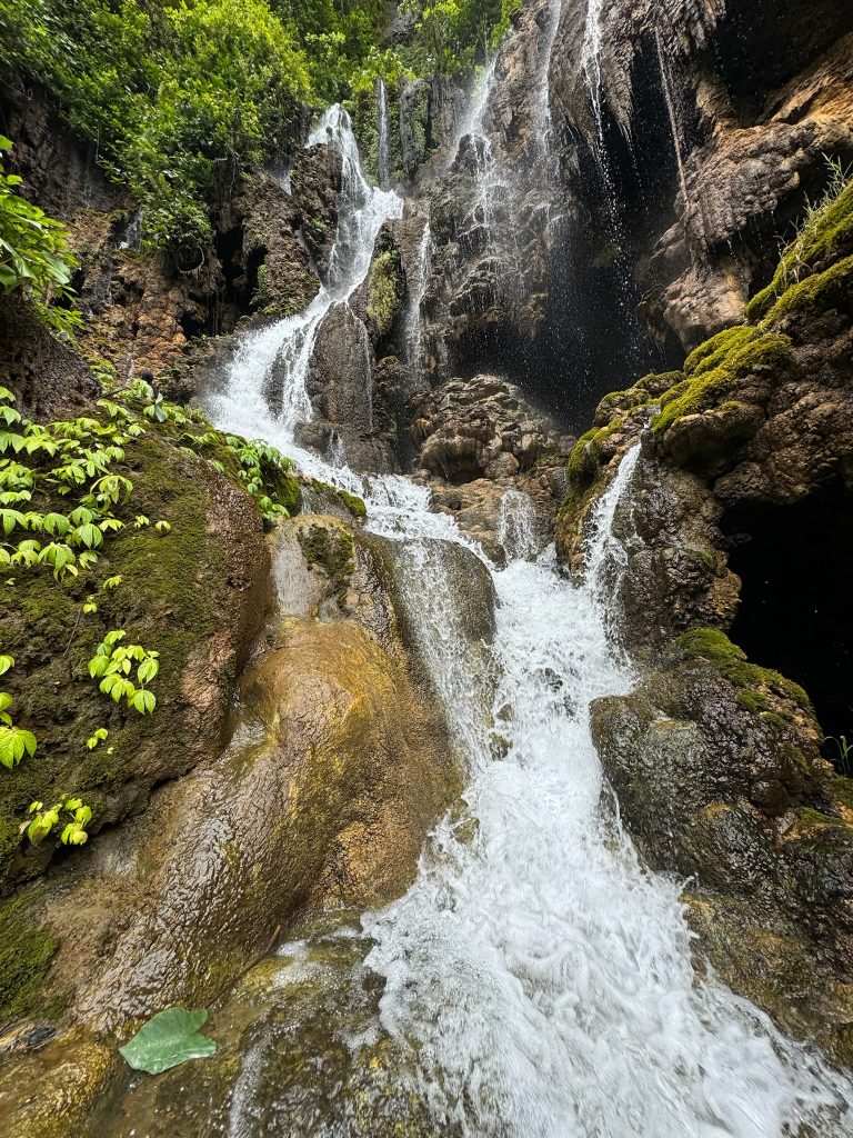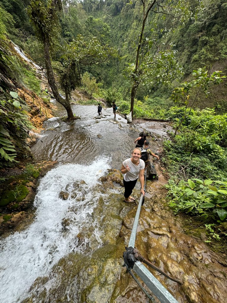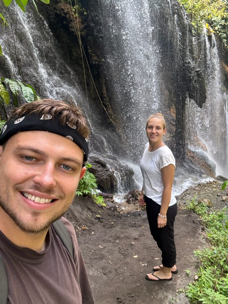 Es hieß sehr früh aufstehen, weil wir um 05:30 Uhr schon von einem Fahrer abgeholt wurden…Das Hotel war so lieb und hat uns ein kleines Frühstück (Toast mit Marmelade und Früchten) zum Mitnehmen vorbereitet, da wir eigentlich Frühstück inklusive hatten. Nachdem wir eingestiegen waren, fuhren wir noch eine halbe Stunde durch die Stadt, um noch ein anderes Pärchen einzusammeln. Der Fahrer war irgendwie verpeilt, er hat den Weg nicht gefunden und dazu waren auch noch Straßen wegen eines autofreien Sonntags gesperrt. Die Fahrt zum Wasserfall dauerte ca. zwei Stunden. Nachdem wir aus dem großen Ort Malang rausgefahren waren, ging die kurvige Strecke durch den Wald an einem Berghang entlang. Beim Parkplatz angekommen, machten wir eine kurze Pause und unser Guide ist zu uns gestoßen. Zuerst gingen wir zu einer Aussichtsplattform, wo man auf die Wand schauen kann, wo der Wasserfall in die Schlucht fällt (130m). Danach ging der steile Abstieg nach unten, zuerst über eine schmale Treppe, später durch einen Wasserfall hindurch. Gut, dass wir vorher ein bisschen über den Wasserfall gelesen hatten und uns noch Flipflops eingesteckt hatten. Wir folgten dem Guide durch den Canyon bis vor den Wasserfall. Hier waren super viele Menschen, aber der Guide führte uns durch den Fluss durch auf die gegenüberliegende Seite. Hier hatten wir Zeit, um ein paar Fotos zu machen und den Anblick zu genießen. Hier war es ziemlich nass, feucht, windig und dadurch kühl.