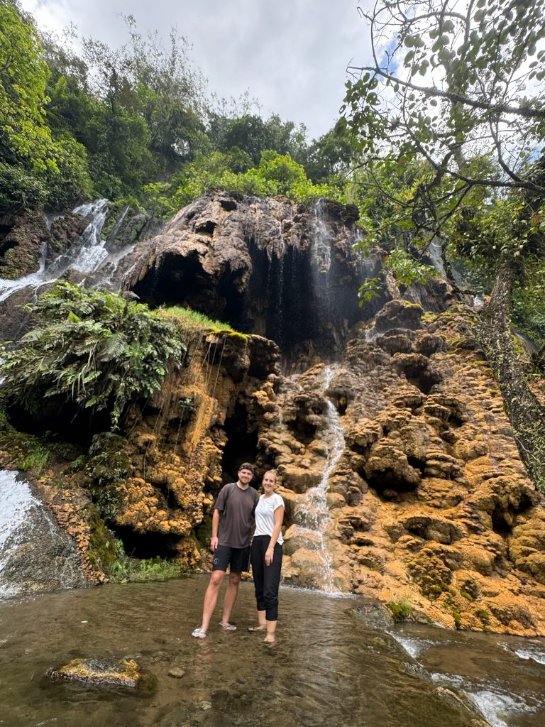 Das andere, australische Pärchen und wir hatten von einer Cave, der Goa Tetes gehört und fragten den Guide danach. Aber er meinte, dass nur die Aussichtsplattform und der Wasserfall in unserem Ticket mit drin sind. Also fragten wir, ob es okay ist, wenn wir die Höhlen besuchen und eben selber den Eintritt bezahlen. Er meinte, es sei okay aber schien nicht besonders glücklich darüber, weil er es mit seinem Boss klären musste. Wir fragten nochmal nach, ob es wirklich okay ist, weil wir nicht wollten, dass er Ärger bekommt, aber haben auch das Problem nicht verstanden, wahrscheinlich wegen dem zusätzlichen Zeitaufwand. Es war aber gut, dass wir gefragt haben, denn wir hätten sonst echt was verpasst. Wir gingen ein Stück zurück durch den Canyon und kamen an weiteren verteilten Wasserfällen und einem davor künstlich angelegtem Pool vorbei. Dann mussten wir einfach durch die Wasserfälle den Berg hoch zu der kleinen Höhle klettern. An den Hängen hat sich an den herunterhängenden feinen Wurzeln eine Art Tropfstein gebildet. Es war ein Erlebnis am Hang entlang durch die Wasserfälle zu klettern, der Rest des Wegen zurück ging aber wieder über eine Treppe. Nach dem anstrengenden Aufstieg zogen wir unsere nassen Klamotten um und fuhren gegen 11:30 Uhr zurück nach Malang. Diesmal war etwas mehr Verkehr, sodass der Rückweg 2,5 Stunden dauerte und wir gegen 14 Uhr zurück in der Stadt waren. Keine Ahnung, warum wir so früh losfahren mussten. Und wir hätten auch die Autobahn fahren können, aber wahrscheinlich sollte das Geld eingespart werden..