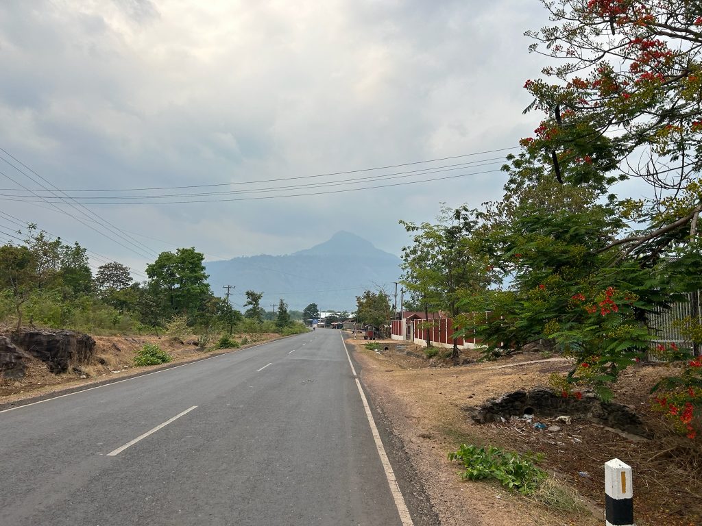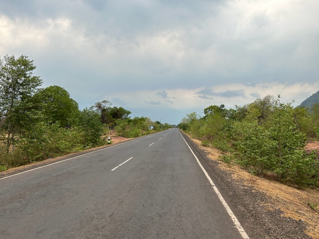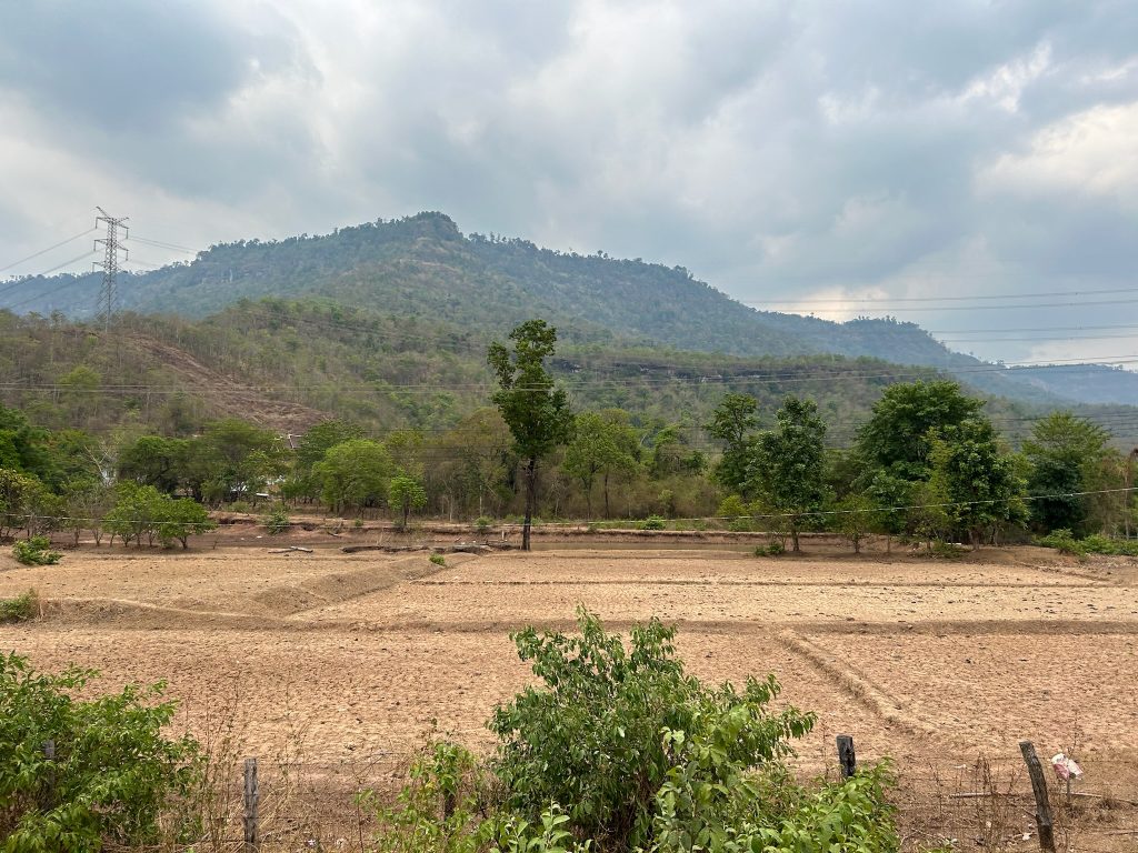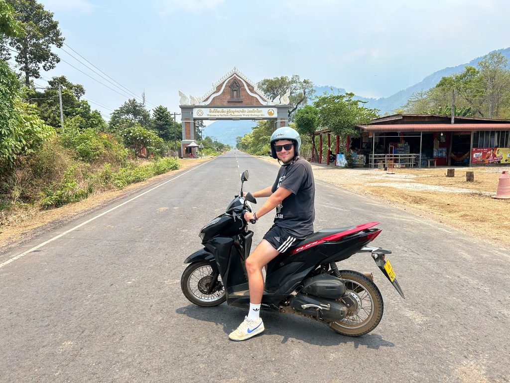 Heute wollten wir es wagen und einen Ausflug zum Wat Phou machen. Wir wollten früh losfahren, um der Mittagshitze etwas zu entgehen, aber wir mussten noch 45 Minuten auf unseren Roller warten, den wir über das Hostel gemietet haben. Um 8:30 Uhr ging es dann los und wir mussten mal wieder erst einmal tanken fahren. Dann ging die Fahrt ca. 1 Stunde lang nach Süden, raus aus der Stadt, zwischen dem Mekong und einer Bergkette lang, später kamen wir noch an grünen Reisfeldern vorbei. Zu einer anderen Jahreszeit wäre es in Laos wahrscheinlich noch schöner, da die Reisfelder zur Zeit überwiegend abgeerntet sind, ist die Landschaft eher trocken und braun.