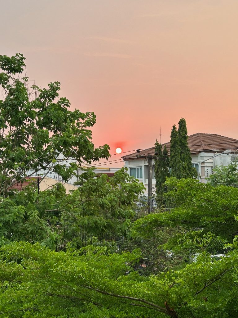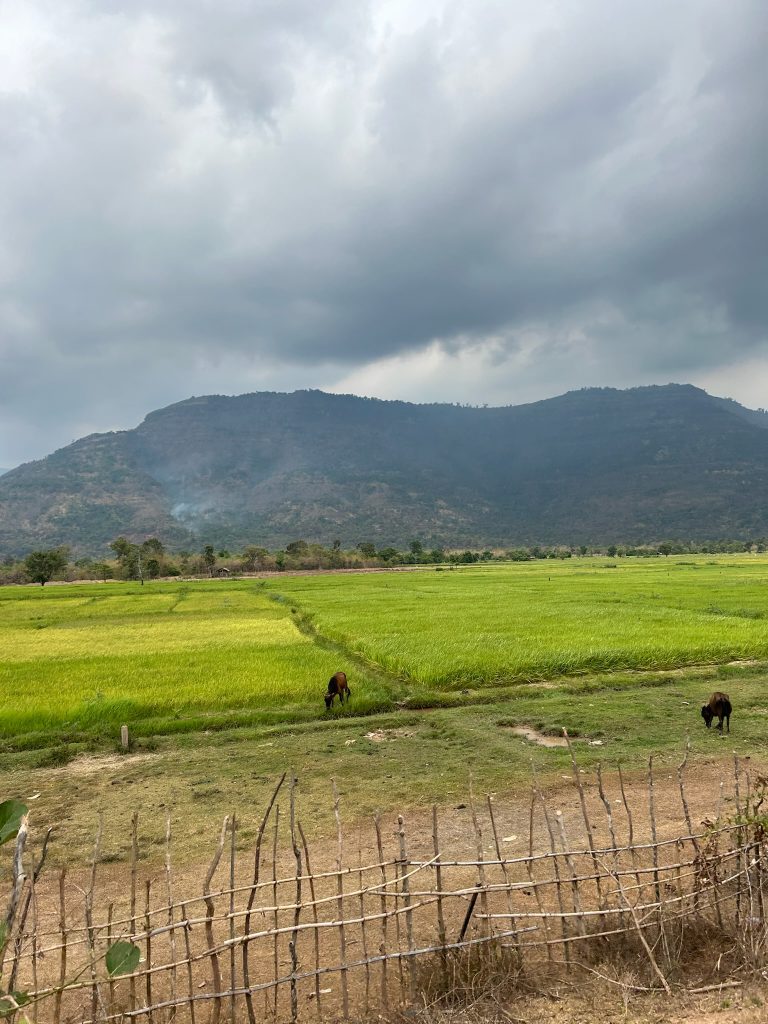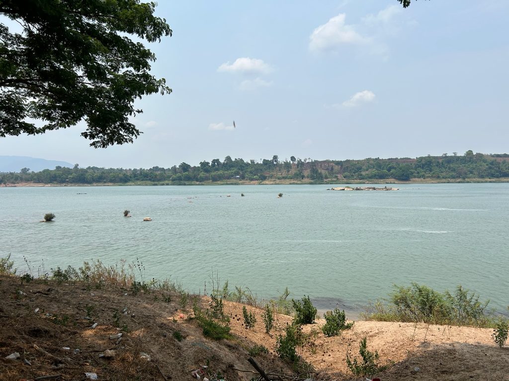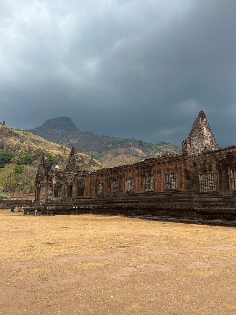 Nach etwa zwei Stunden machten wir uns wieder auf den Rückweg. Diesmal fuhren wir mit dem kostenlosen Golfcart zurück zum Eingang. Wir sahen die dunklen Wolken aber es hat nur genieselt, das war ganz angenehm. Auf dem Rückweg fuhren wir durch den kleinen, süßen Ort Champasak und hielten einmal am Mekong.