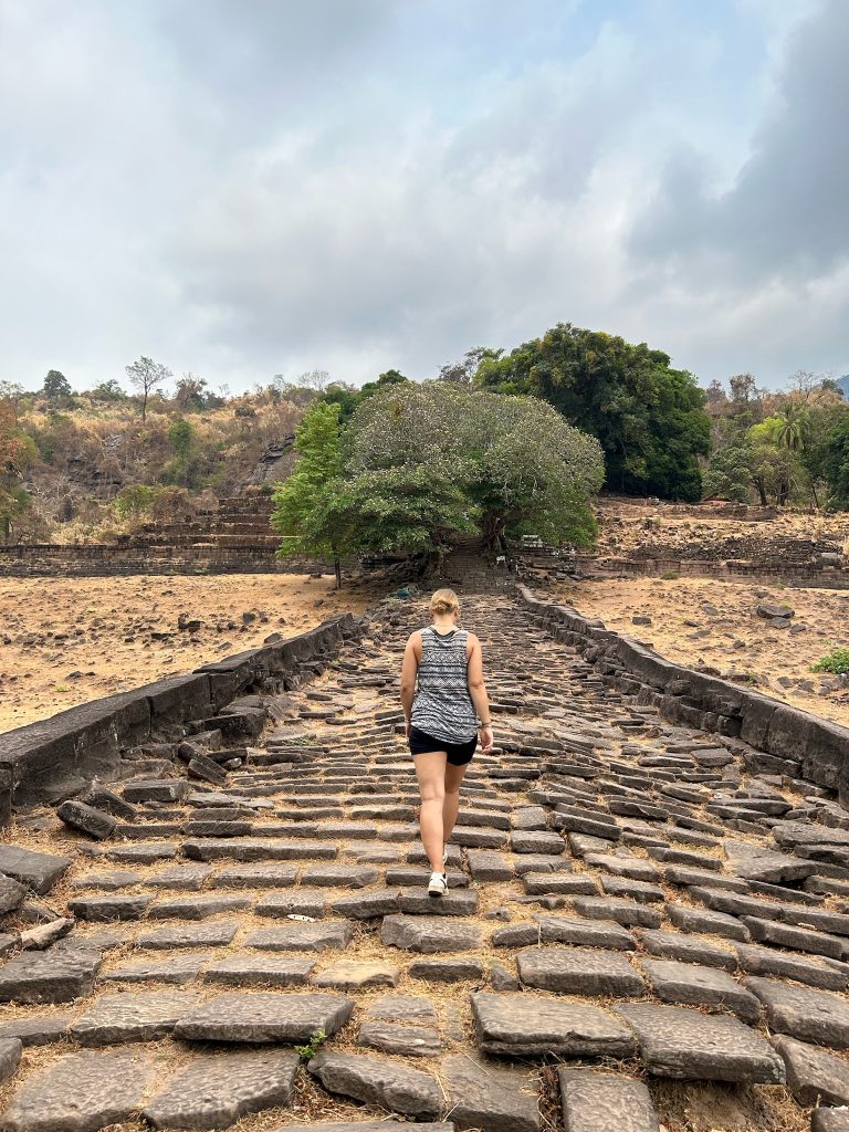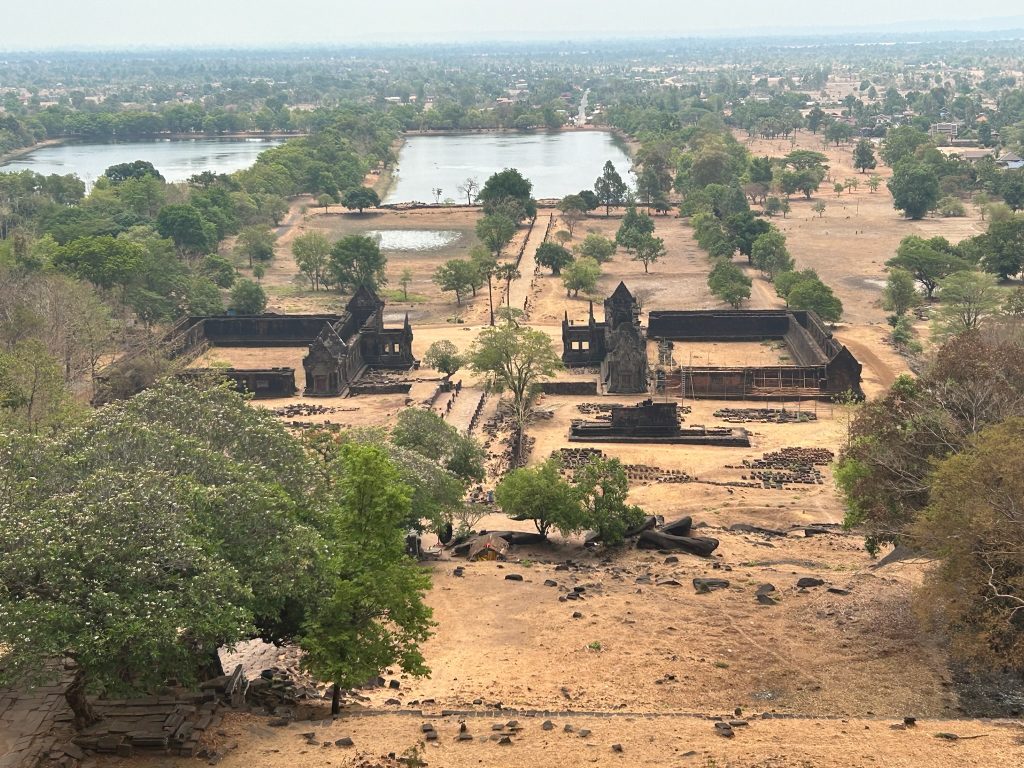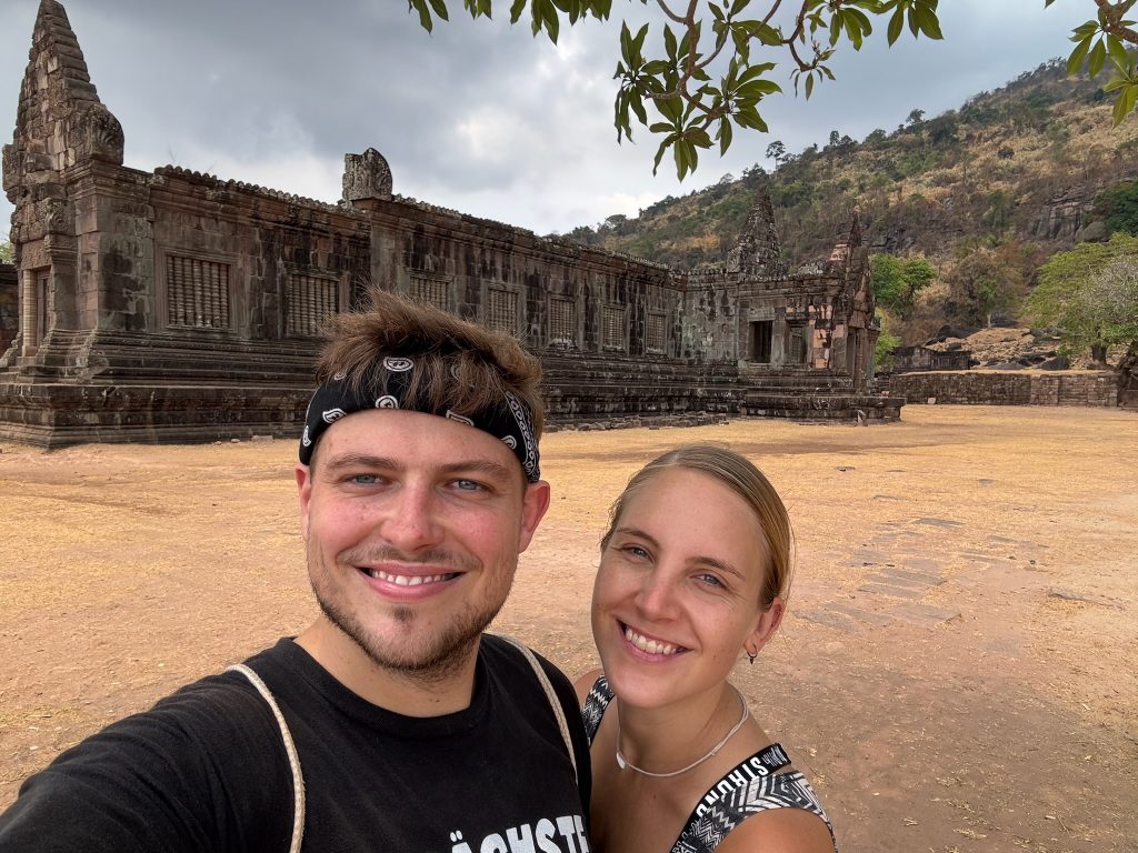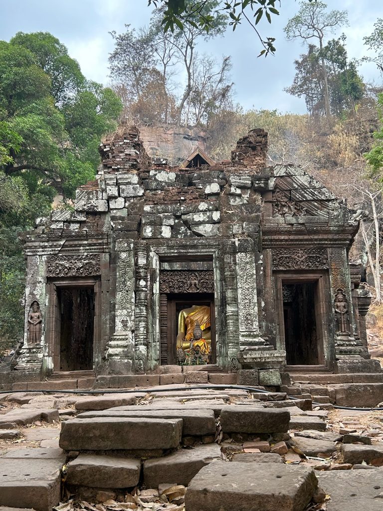 Der Wat Phou ist ein ehemaliger Tempelkomplex der Khmer aus dem 11. bis 13. Jahrhundert. Von hier gab es damals eine Verbindungsstraße bis Angkor Wat. Gegen 10 Uhr sind wir angekommen und holten uns ein Ticket (ca. 2€). Wir mussten einen längeren Weg zwischen zwei Wasserbecken bis zum Berghang laufen. Hier badeten Wasserbüffel und am Rand grasten Kühe. Vor dem Berg liegen zwei große, erhaltene Tempelgebäude. Dazwischen führt ein Weg und später eine Treppe aus schiefen Steinen den Berg hoch. Hier ist wohl noch nicht so viel restauriert und wir konnten ein paar Archäologen bei der Arbeit sehen. Auf dem Berg stand ein kleines Tempelgebäude mit einer goldenen Buddha-Statue darin. Außerdem gab es hier Schnitzereien in Felsen und eine natürliche Quelle zu sehen, bei der das Wasser aus der Felswand kam und aufgefangen wurde. Einen tollen und weiten Ausblick hat man hier ebenfalls. Anfangs waren hier noch Asiaten in Touri-Guppen unterwegs (die sind immer besonders früh dran) aber später waren wir nur mit wenigen anderen Besuchern hier.