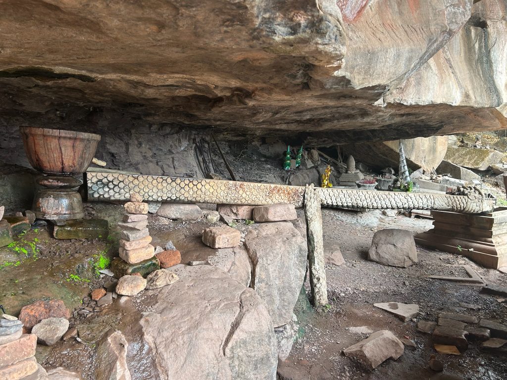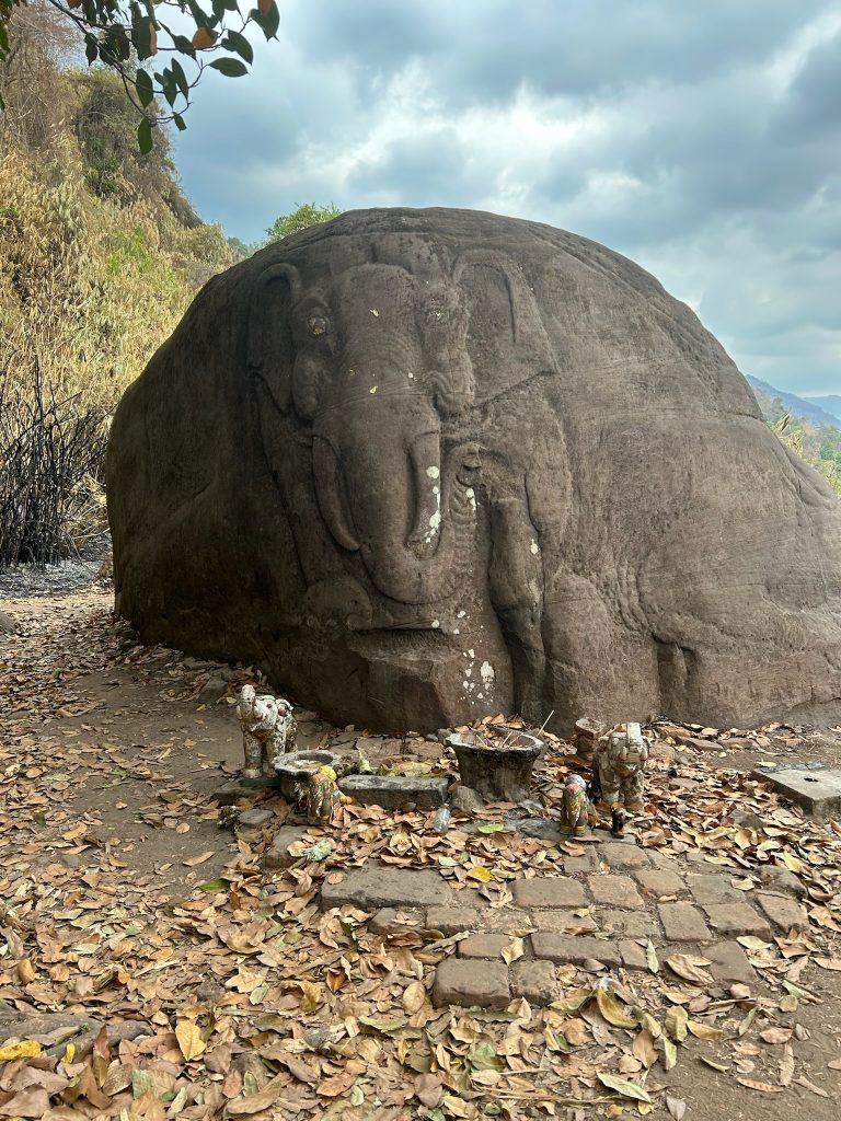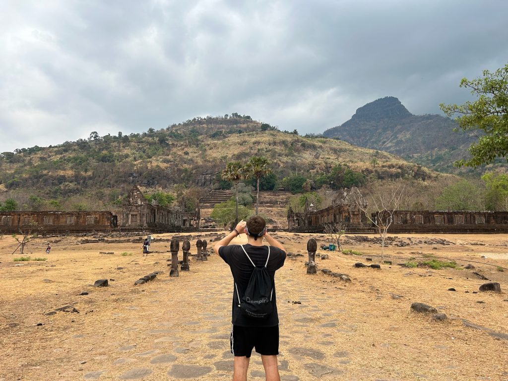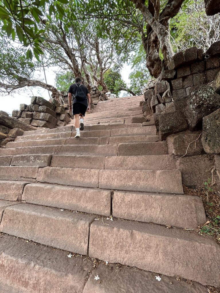 Der Wat Phou ist ein ehemaliger Tempelkomplex der Khmer aus dem 11. bis 13. Jahrhundert. Von hier gab es damals eine Verbindungsstraße bis Angkor Wat. Gegen 10 Uhr sind wir angekommen und holten uns ein Ticket (ca. 2€). Wir mussten einen längeren Weg zwischen zwei Wasserbecken bis zum Berghang laufen. Hier badeten Wasserbüffel und am Rand grasten Kühe. Vor dem Berg liegen zwei große, erhaltene Tempelgebäude. Dazwischen führt ein Weg und später eine Treppe aus schiefen Steinen den Berg hoch. Hier ist wohl noch nicht so viel restauriert und wir konnten ein paar Archäologen bei der Arbeit sehen. Auf dem Berg stand ein kleines Tempelgebäude mit einer goldenen Buddha-Statue darin. Außerdem gab es hier Schnitzereien in Felsen und eine natürliche Quelle zu sehen, bei der das Wasser aus der Felswand kam und aufgefangen wurde. Einen tollen und weiten Ausblick hat man hier ebenfalls. Anfangs waren hier noch Asiaten in Touri-Guppen unterwegs (die sind immer besonders früh dran) aber später waren wir nur mit wenigen anderen Besuchern hier.