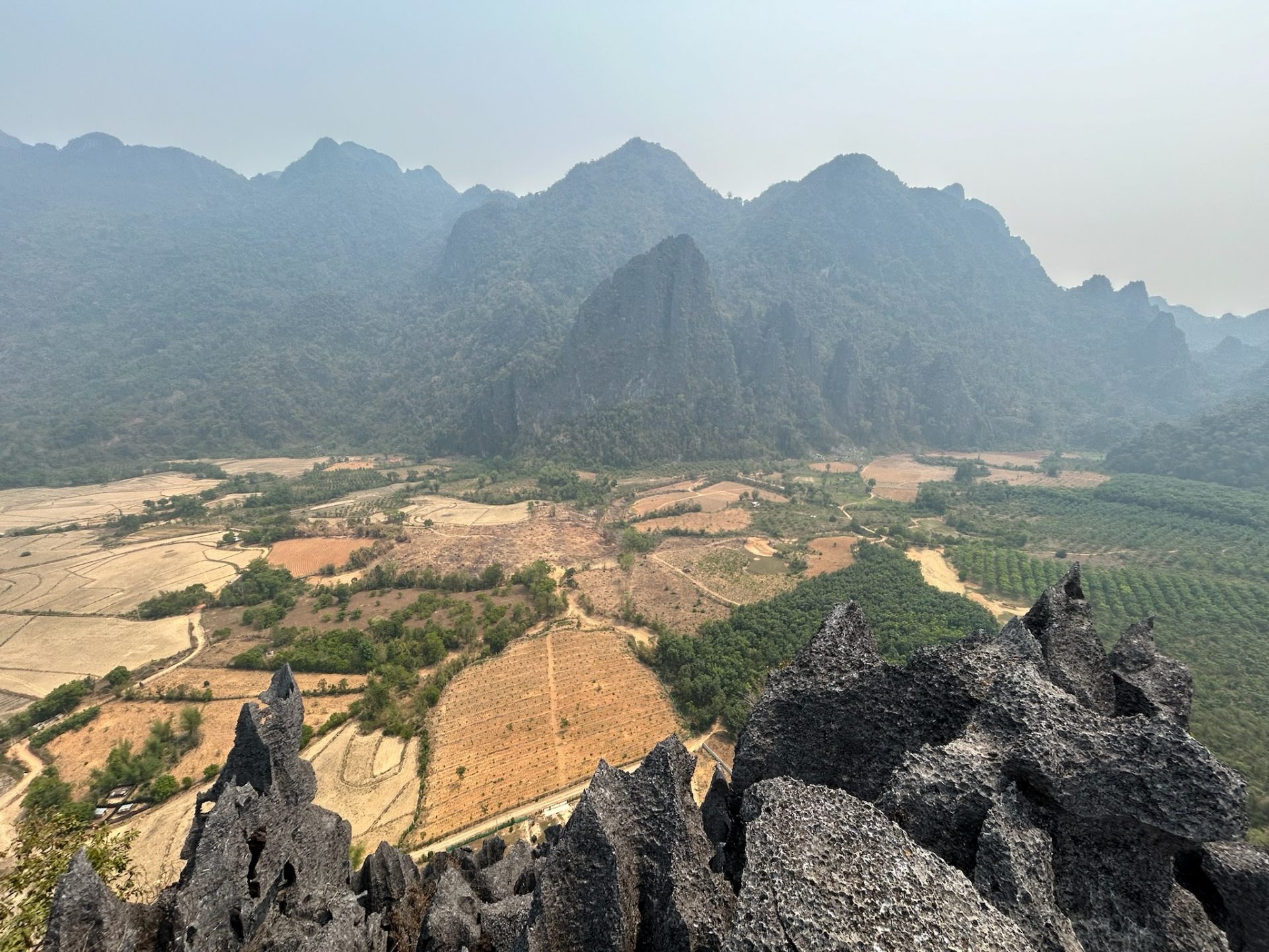 Von hier hat man auch einen Blick auf die Spitze mit dem Pegasus, den man von hier erreichen könnte. Aber da dieser Punkt tiefer lag, der Aufstieg so anstrengend war und es die gleiche Aussicht gab, haben wir uns den geschenkt. Wir machten uns an den Abstieg und kamen dabei an der Phapoungkham Cave vorbei, die wir erkunden wollten. Nachdem wir uns durch einen kleinen Eingang gedrückt haben, kamen wir zuerst in einen recht offenen, unspektakulären Bereich. Ohne die Pfeile hätten wir nicht gesehen, dass es noch weiter in die Höhle rein geht. Der Weg ins Höhleninnere wurde immer verwinkelter und wir mussten zwischendurch immer mehr kriechen. Wir kamen durch kleine Höhlen mit coolen Gesteinsformationen.
