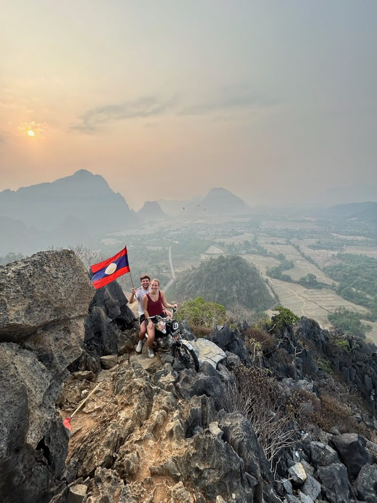 Heute wollten wir auf Empfehlung unseres Hoteliers zum Sonnenaufgang (5:50 Uhr) einen anderen Aussichtspunkt besteigen. Also klingelte um 4:30 Uhr der Wecker und 45 Minuten später fuhren wir los zum Nam Xay Viewpoint. Vom Parkplatz aus sollte der Aufstieg auf 340 m Höhe 30 Minuten dauern und war echt anstrengend. Wir kamen rechtzeitig vor dem Sonnenaufgang an und setzten uns in die Hütte zum Verschnaufen. Zum Sonnenaufgang hinter den Bergen konnten wir in der Ferne auch drei Heißluftballons beim Aufsteigen beobachten. Auf dieser Spitze stehen zwei Motorräder. Anfangs waren wir noch alleine aber nach und nach kamen ein paar Menschen dazu.