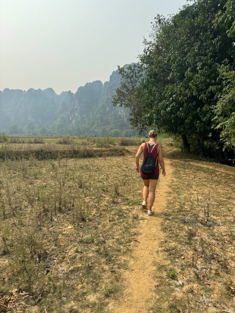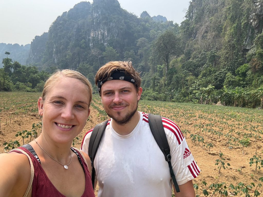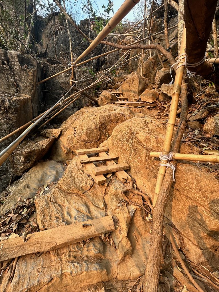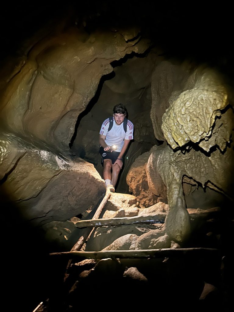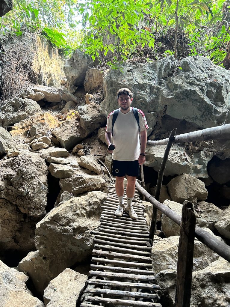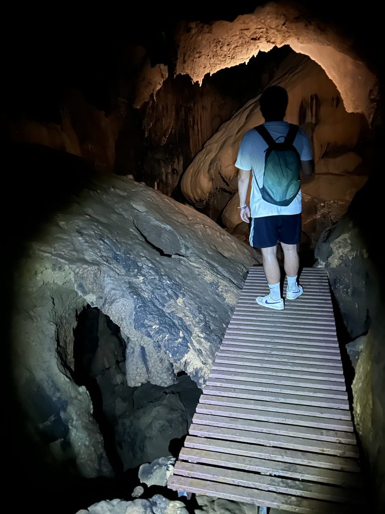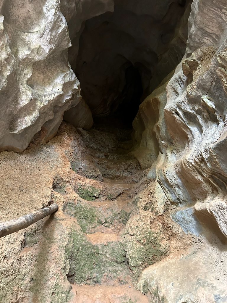 Danach fuhren wir wieder zurück auf dem Loop zur Bor Keo Höhle. Vom Ende des Weges mussten wir weiter zu Fuß über ein trockenes Reisfeld, durch ein trockenes Flussbett, durch ein Süßkartoffelfeld bis zum Berg laufen. Nach dem kurzen Aufstieg zum Höhleneingang ging es zuerst auf eine Art Lehmpfad in die Höhle rein. Später mussten wir wieder mehr klettern und aufpassen, dass wir nicht in die Schluchten rutschen. Am Ende ging es über eine Leiter sogar in eine zweite Ebene bis wir wieder umdrehen mussten. Neben dem Höhleneingang gibt es auch hier einen Naturpool mit super klarem Wasser. Hier waren wir komplett alleine und zurück beim Roller angekommen saß jemand beim Tickethäuschen, sodass wir noch unseren Eintritt zahlten.