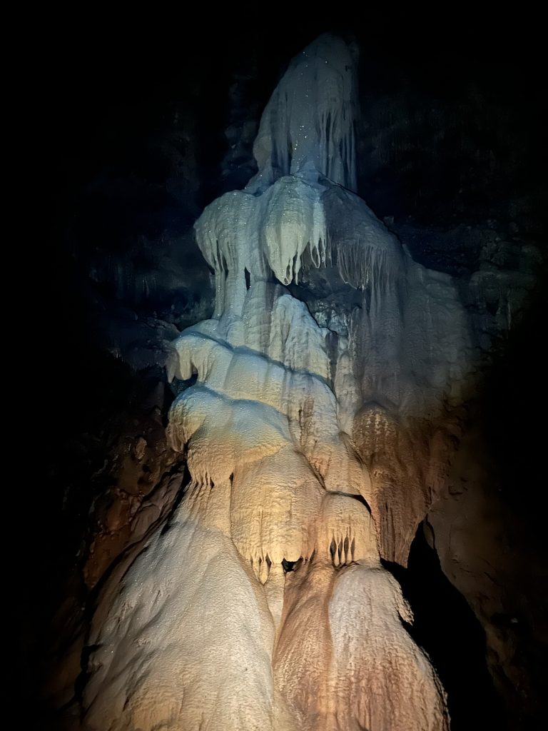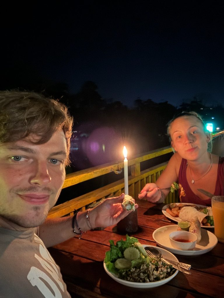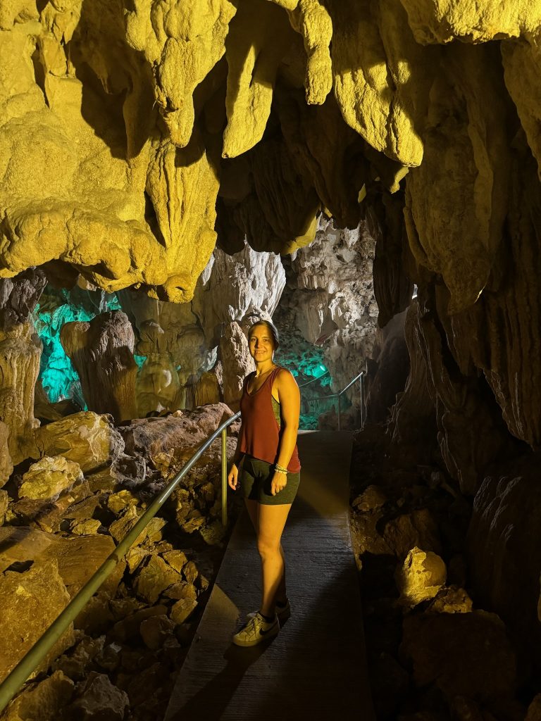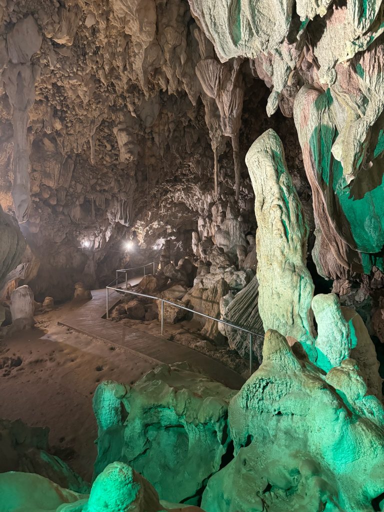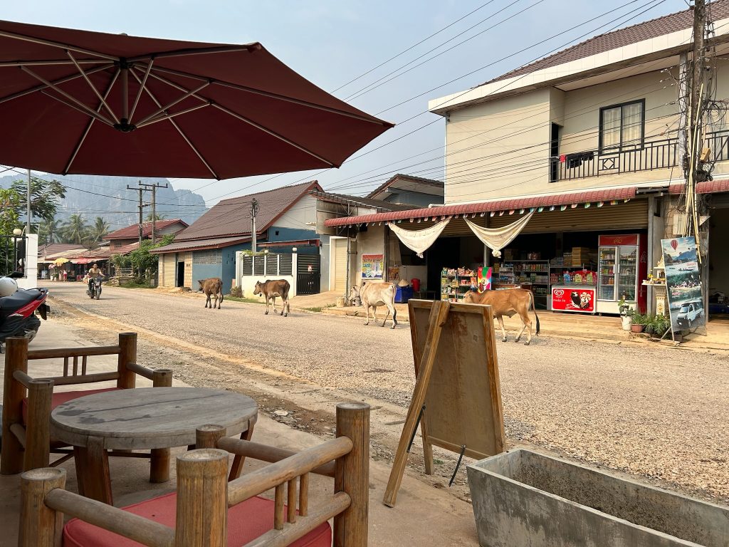 Um 11 Uhr waren wir schon zurück im Hotel für eine Mittagspause. Wir bezahlten unsere offene Rechnung des Zimmers zusammen mit dem Roller und buchten eine Tubing-Tour für den nächsten Tag sowie den Transport nach Vientiane. Um 14:30 Uhr machten wir uns nochmal auf und wollten die Angel Cave 15 Minuten nördlich der Stadt besichtigen. Auf dem Weg dahin machten wir noch einen Stop an der Hauptstraße, um ein Sandwich zu essen. Die Angel Cave liegt auf einer Anlage mit einer weiteren Water Cave, einer Zipline und einem Restaurant. Diese Höhle ist auch ausgebaut und ausgeleuchtet und geht auf einem Weg durch den Felsen, wo man recht schnell durch ist – für einen Eintrittspreis unter 1€ aber voll ok. Zurück in der Stadt fuhren wir noch an einer Bank vorbei, um Geld abzuheben und stöberten kurz in zwei Läden. Wir gaben unseren Roller ab und abends liefen wir nochmal los zum Abendessen.