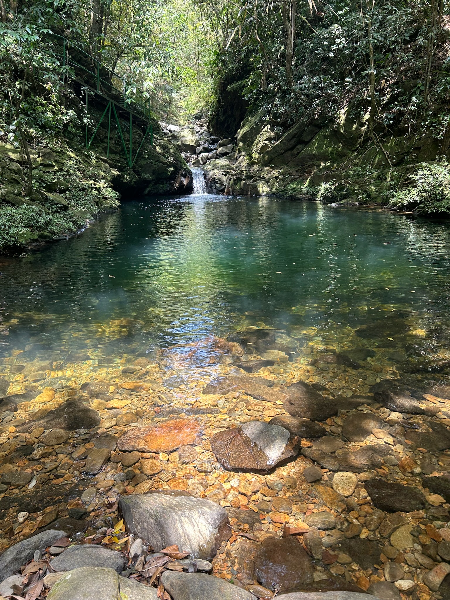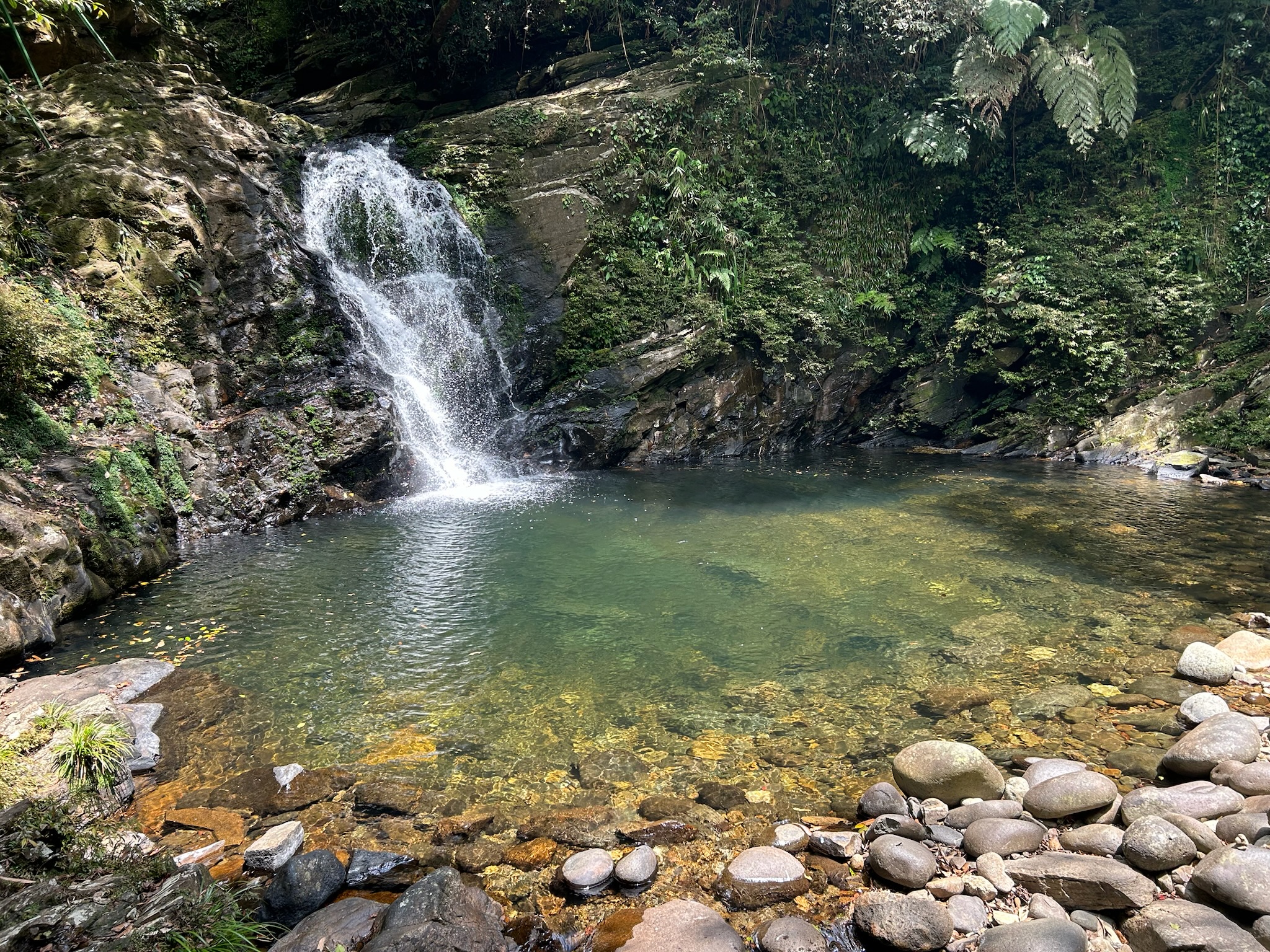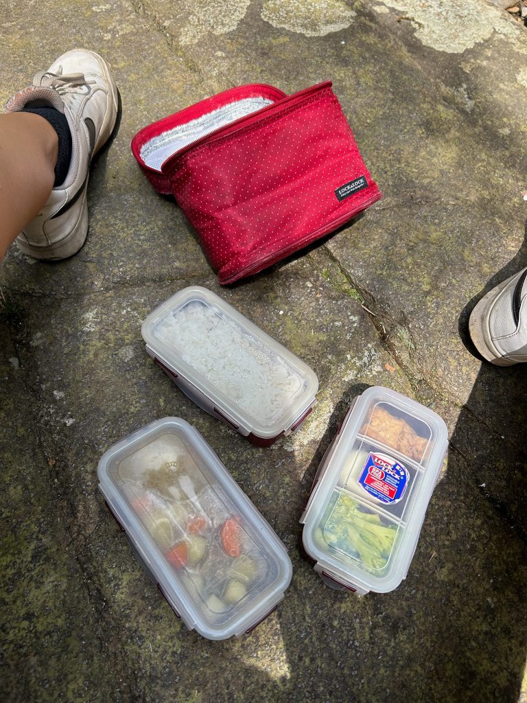 Von einem anderen Parkplatz aus ging es einen Trampelpfad den Berg runter und später an einem Bach entlang, der die sogenannten fünf Seen bildete. An einem der Seen machten wir unsere Mittagspause mit einer bereitgestellten Lunch-Box, das war echt lecker mit Reis, Suppe, Tofu, Gemüse und Ei.