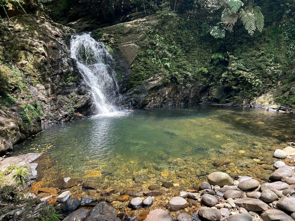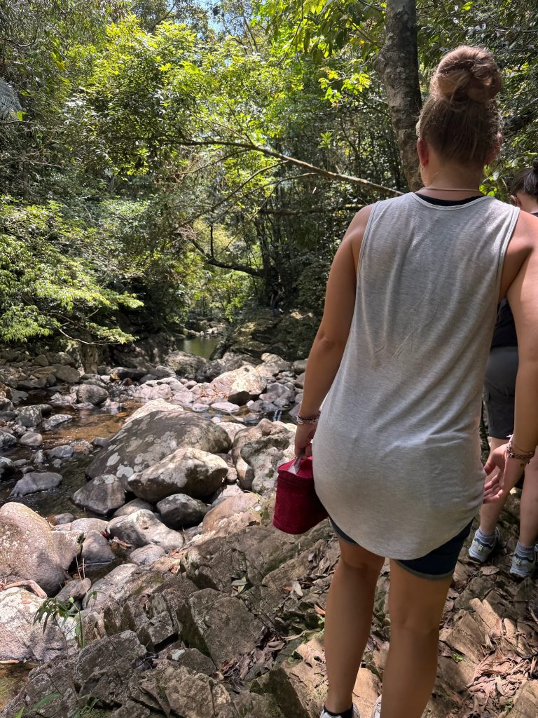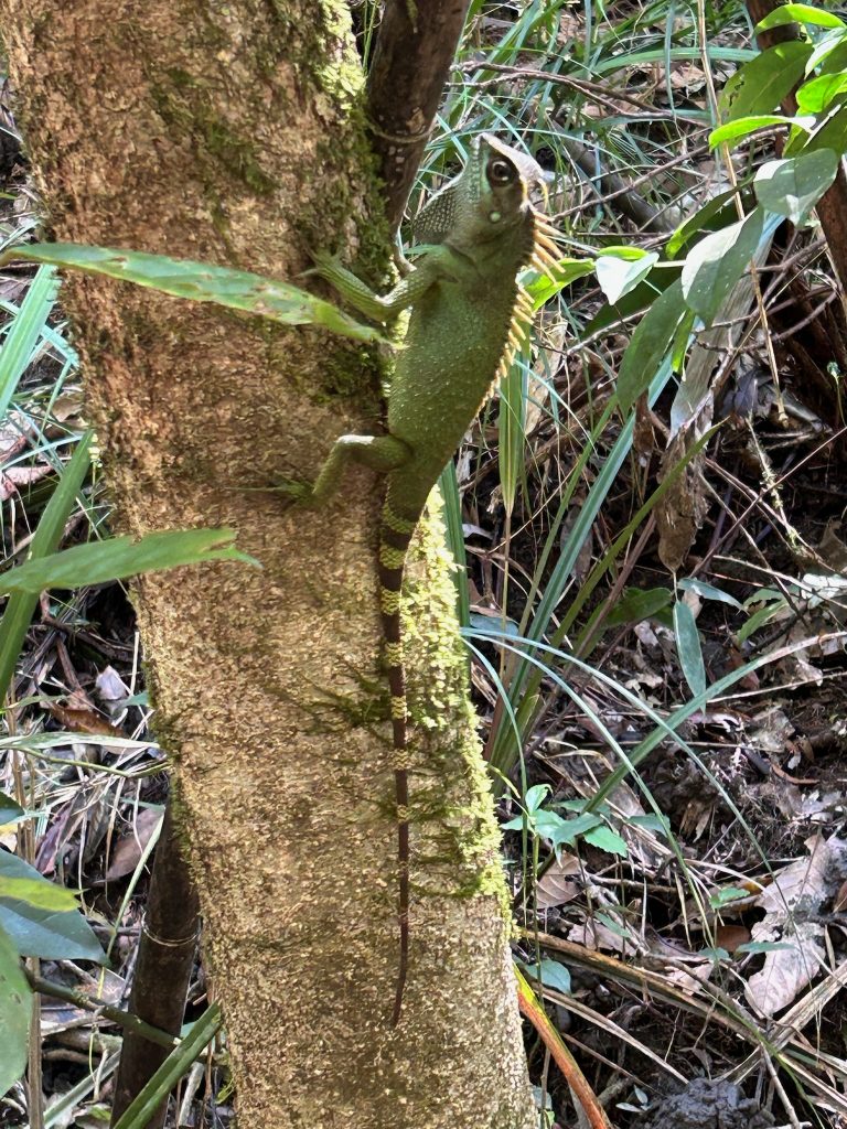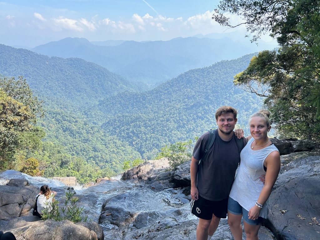 Danach ging es den Trail weiter bis zu einem Wasserfall. Auf dem Weg sahen wir zwei große Eidechsen. Wir kamen leider nur auf dem Top des Rhododendron Wasserfalls an, aber hatten von hier eine mega Aussicht. Der Wasserfall ist 300 m hoch und der Abstieg war nicht Teil der Tour. Hier konnten wir eine Zeit verweilen und den Ausblick genießen. Am Ende entdeckte Marco neben uns auf dem Stein ein „Stock-Insekt“ – ziemlich verrückt solche Tiere in freier Wildbahn zu sehen. Es sah einfach echt aus wie ein Stock mit kleinen Beinchen.. :D. Das war der letzte Stop für heute, von hier aus ging es einen Wanderweg zu einem anderen Parkplatz, wo der Van auf uns wartete.