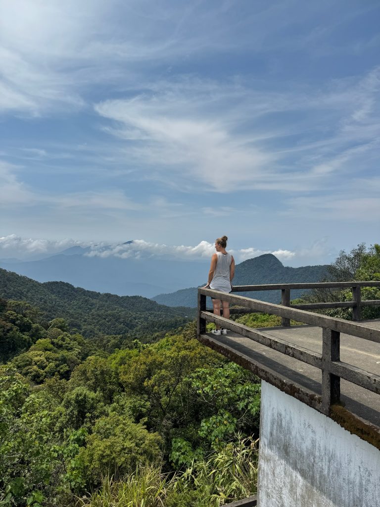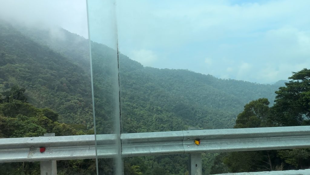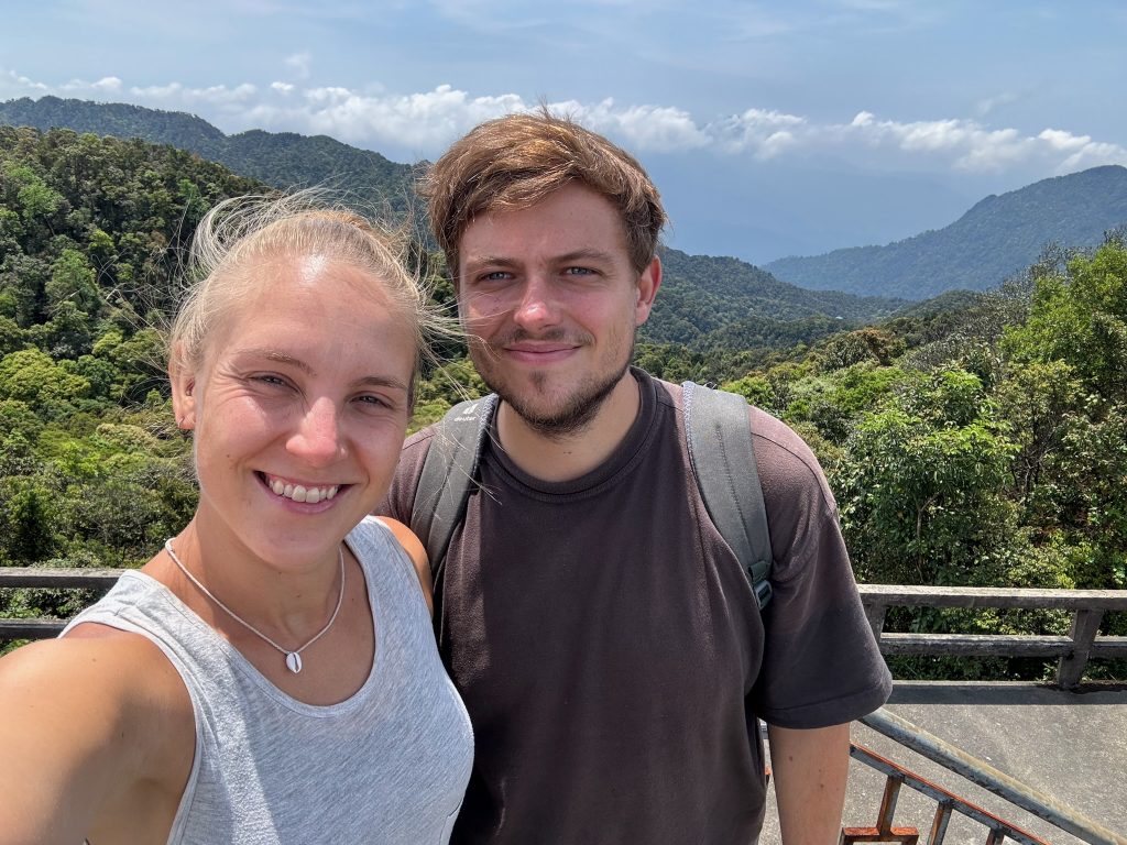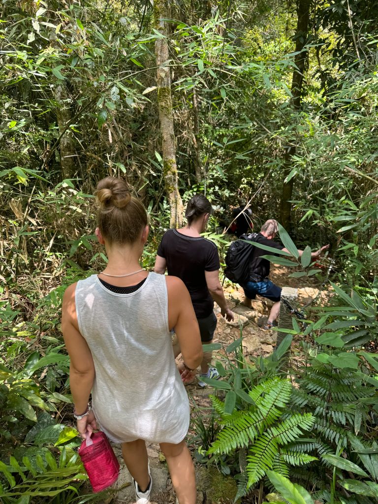 Um 7 Uhr ging Marco los, um uns belegte Baguettes zum Frühstück zu holen. Um 8:30 Uhr wurden wir von unserem Tourguide Sam mit einem Van an der Hauptstraße als vorletzte Teilnehmer abgeholt. Wir fuhren ca. 1,5 Stunden zum Bach Ma Nationalpark im Südwesten von Hue. An der Schranke angekommen, zeigte er uns auf einer großen Karte unsere Route für heute. Als erstes fuhren wir zum höchsten Punkt des Nationalparks. Die Fahrt von einer halben Stunde dorthin am Berghang entlang war schon ein Highlight. Vom Parkplatz aus mussten wir noch ein Stück zu Fuß über einen Weg zur Spitze laufen. Dabei zeigte Sam uns den Baum, aus dessen Rinde Tigerbalm hergestellt wird und die die Soldaten im Krieg zur Heilung ihrer Verletzungen benutzt haben. Er erklärte uns auch das kreischende Dauergeräusch, das wir hörten, welches nämlich von Zikaden (oder Zirpen) stammt und die man auch in der Stadt hört – wusste ich es doch, keine defekte Stromleitung oder so 😀 Außerdem zeigte er uns einen Kriegstunnel, Gänge und andere Überreste des Vietnamkriegs. Auf dem 1.450 m hohen Berg stand ein kleiner Pavillon, in dem mit Fotos die Geschichte des Nationalparks dargestellt war. Er wurde mal wieder von den Franzosen als Rückzugsort vor der Hitze genutzt. Hier machte Sam uns Tee und Kaffee aus einer Thermoskanne. Aussicht hatten wir mal wieder nur auf die Wolken.