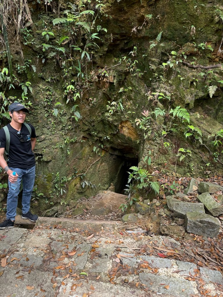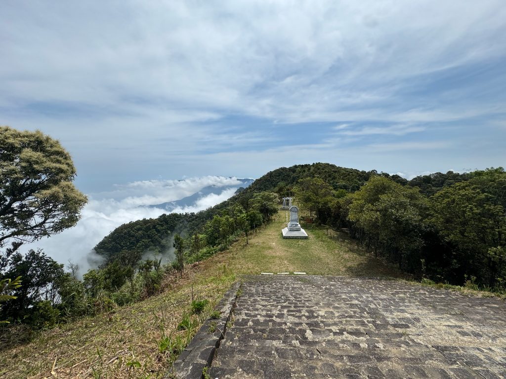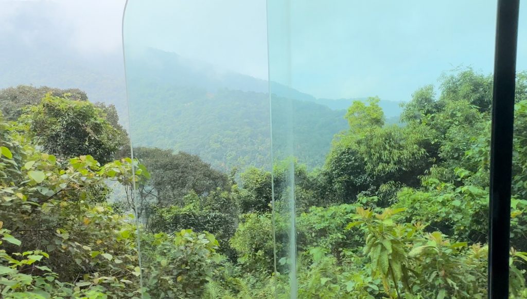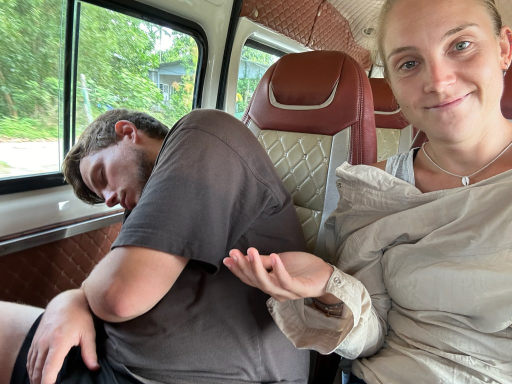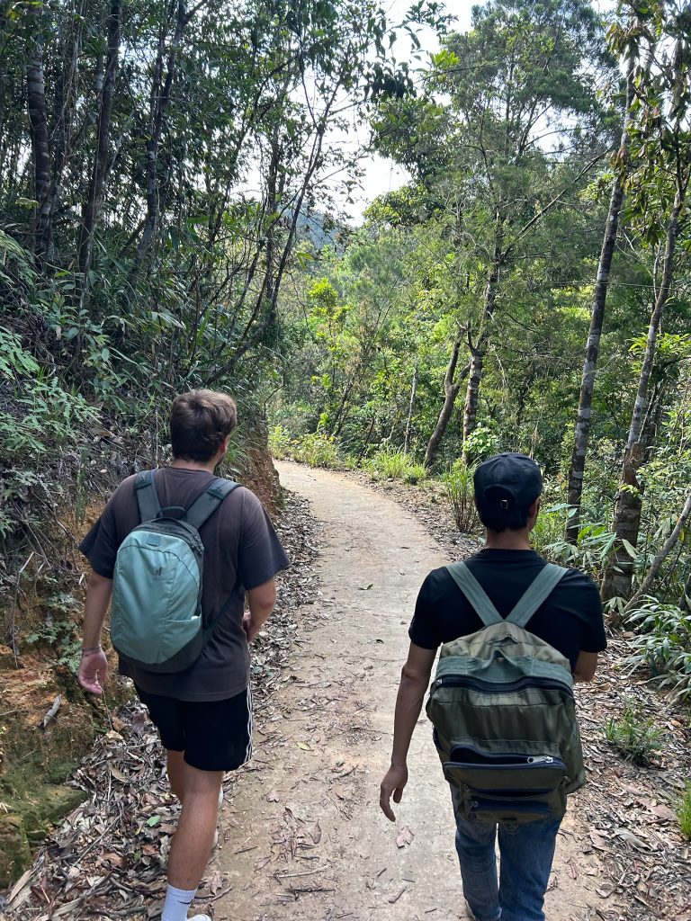 Um 7 Uhr ging Marco los, um uns belegte Baguettes zum Frühstück zu holen. Um 8:30 Uhr wurden wir von unserem Tourguide Sam mit einem Van an der Hauptstraße als vorletzte Teilnehmer abgeholt. Wir fuhren ca. 1,5 Stunden zum Bach Ma Nationalpark im Südwesten von Hue. An der Schranke angekommen, zeigte er uns auf einer großen Karte unsere Route für heute. Als erstes fuhren wir zum höchsten Punkt des Nationalparks. Die Fahrt von einer halben Stunde dorthin am Berghang entlang war schon ein Highlight. Vom Parkplatz aus mussten wir noch ein Stück zu Fuß über einen Weg zur Spitze laufen. Dabei zeigte Sam uns den Baum, aus dessen Rinde Tigerbalm hergestellt wird und die die Soldaten im Krieg zur Heilung ihrer Verletzungen benutzt haben. Er erklärte uns auch das kreischende Dauergeräusch, das wir hörten, welches nämlich von Zikaden (oder Zirpen) stammt und die man auch in der Stadt hört – wusste ich es doch, keine defekte Stromleitung oder so 😀 Außerdem zeigte er uns einen Kriegstunnel, Gänge und andere Überreste des Vietnamkriegs. Auf dem 1.450 m hohen Berg stand ein kleiner Pavillon, in dem mit Fotos die Geschichte des Nationalparks dargestellt war. Er wurde mal wieder von den Franzosen als Rückzugsort vor der Hitze genutzt. Hier machte Sam uns Tee und Kaffee aus einer Thermoskanne. Aussicht hatten wir mal wieder nur auf die Wolken.