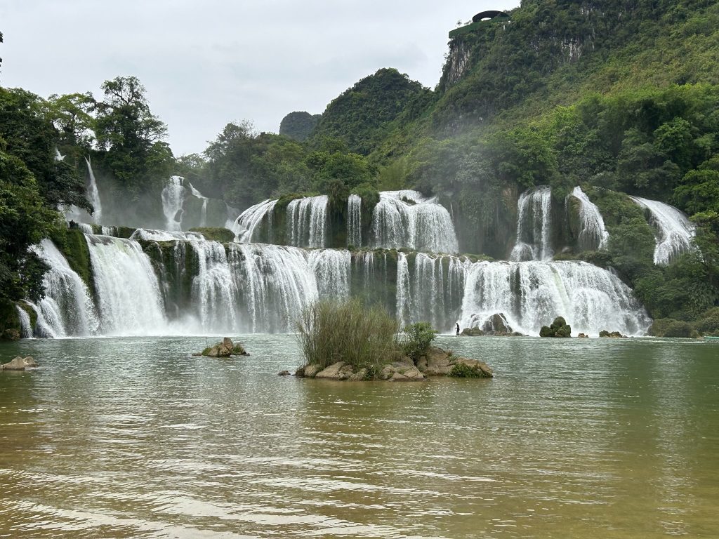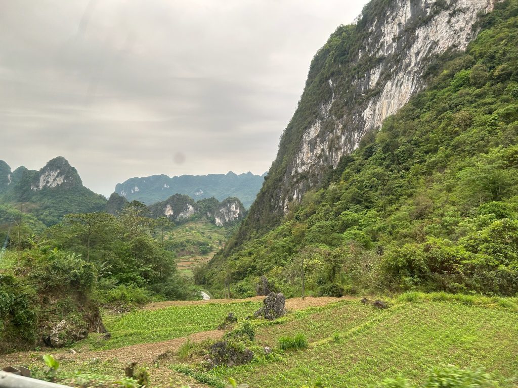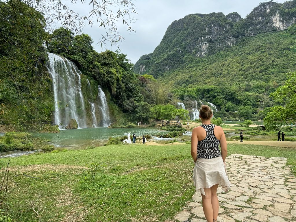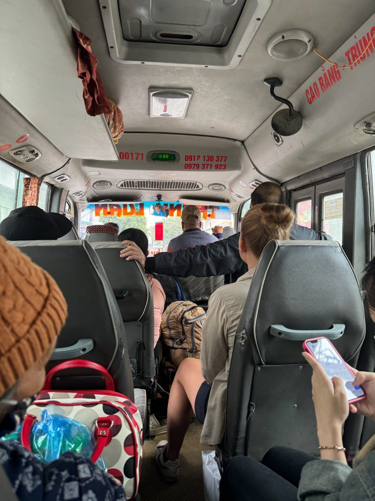 Ohne Frühstück liefen wir los zur Bushaltestelle, die nur 8 Minuten von uns entfernt lag. Um 8:30 Uhr kam der Kleinbus der Einheimischen, der bis unters Dach vollgestopft war mit Kartons und Paketen. Die Einheimischen nutzen die öffentlichen Busse auch als Lieferdienst. Wir haben noch die letzten beiden Sitzplätze ergattert und los ging die schaukelige Fahrt durch die Berge zum viertgrößten transnationale Wasserfall „Ban Gioc Detian“ an der chinesischen Grenze. Die lokalen Busse halten einfach zich mal an, um Leute raus oder reinzulassen oder Pakete ein und auszuladen. Dafür war die Stimmung unter den Einheimischen ziemlich gut. Die Fahrt dauerte einfach 3,5 Stunden für eine Strecke, die laut Google rund zwei Stunden gedauert hätte. Dazu kam, dass es mir heute leider nicht so gut ging mit starken Kopfschmerzen.