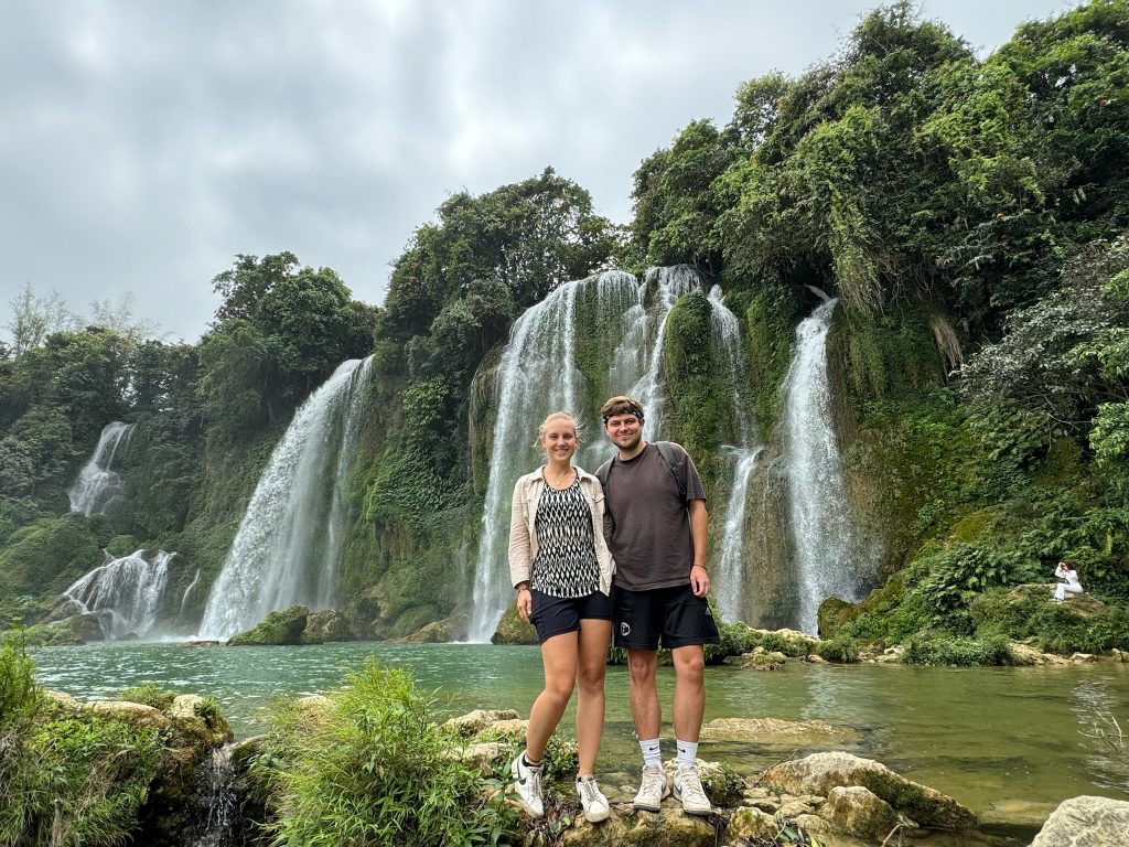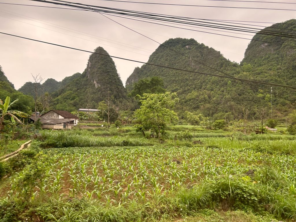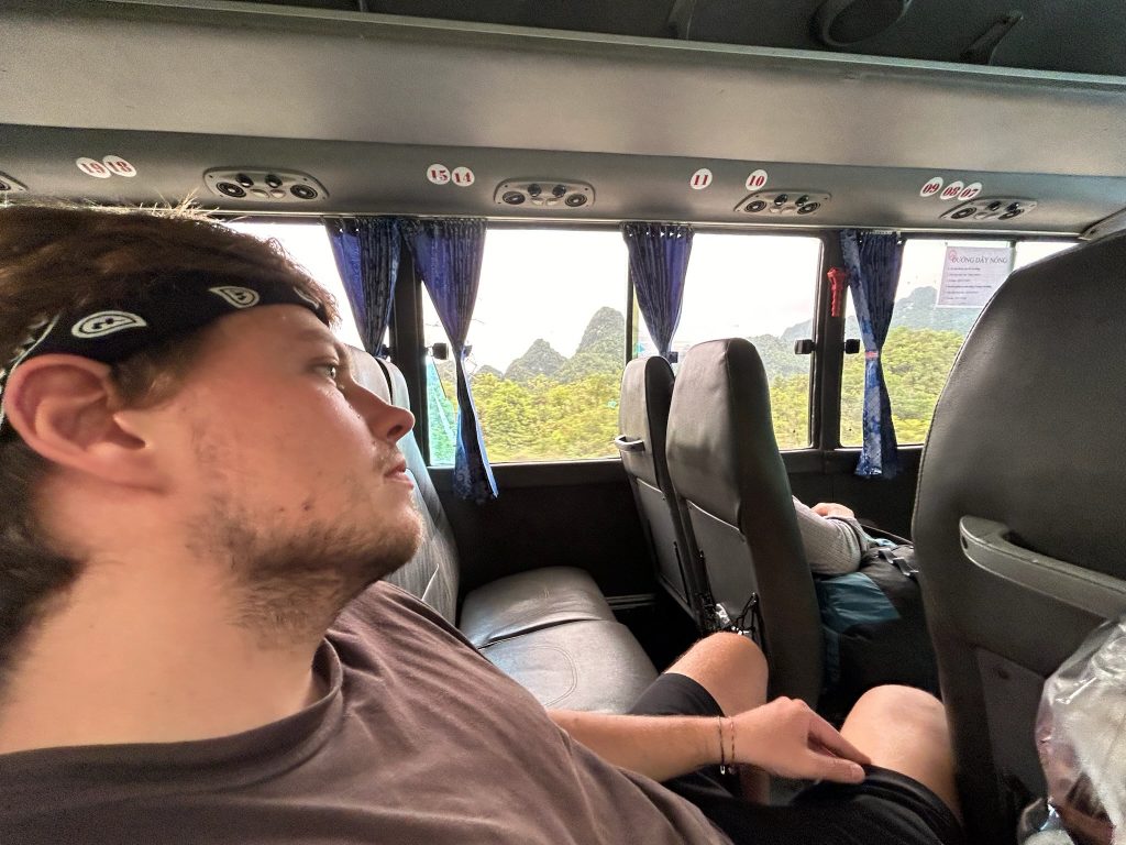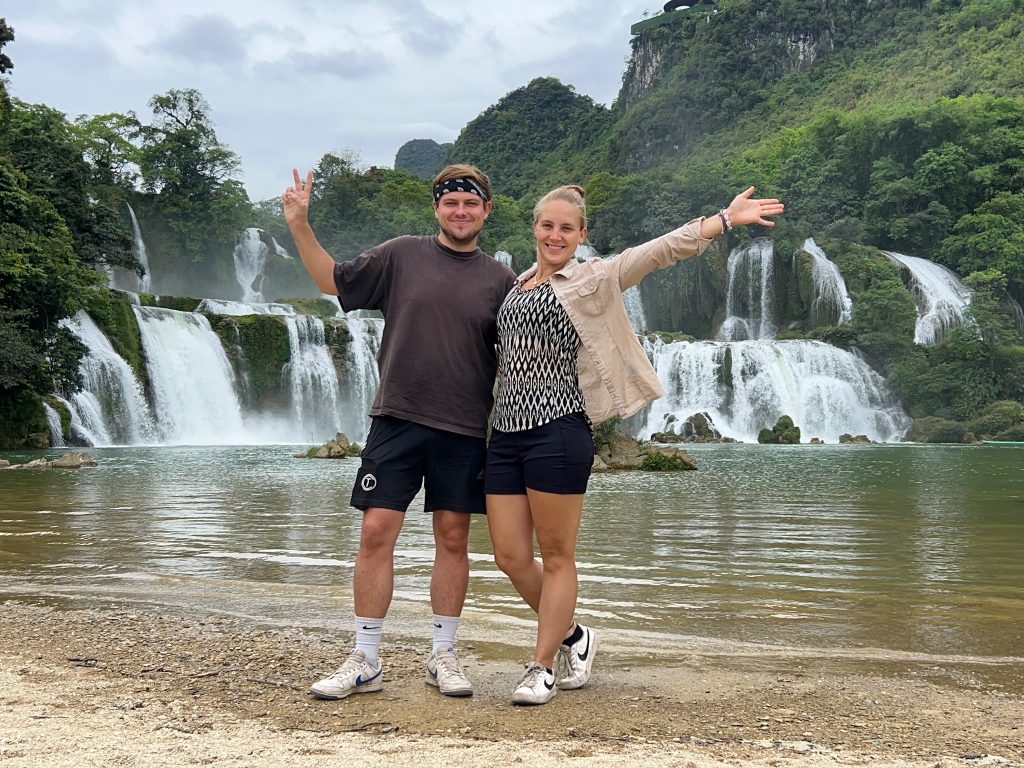 Ohne Frühstück liefen wir los zur Bushaltestelle, die nur 8 Minuten von uns entfernt lag. Um 8:30 Uhr kam der Kleinbus der Einheimischen, der bis unters Dach vollgestopft war mit Kartons und Paketen. Die Einheimischen nutzen die öffentlichen Busse auch als Lieferdienst. Wir haben noch die letzten beiden Sitzplätze ergattert und los ging die schaukelige Fahrt durch die Berge zum viertgrößten transnationale Wasserfall „Ban Gioc Detian“ an der chinesischen Grenze. Die lokalen Busse halten einfach zich mal an, um Leute raus oder reinzulassen oder Pakete ein und auszuladen. Dafür war die Stimmung unter den Einheimischen ziemlich gut. Die Fahrt dauerte einfach 3,5 Stunden für eine Strecke, die laut Google rund zwei Stunden gedauert hätte. Dazu kam, dass es mir heute leider nicht so gut ging mit starken Kopfschmerzen.