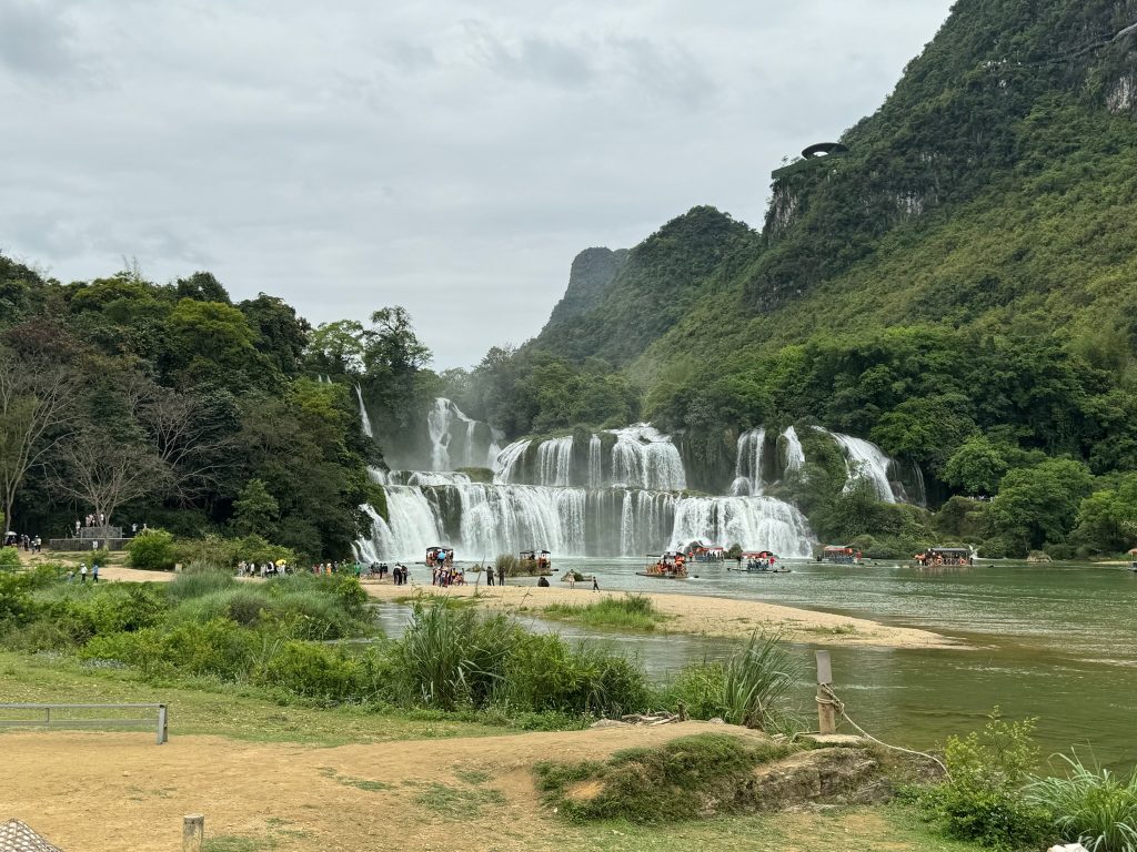 Wir kauften uns ein Ticket, liefen einen Weg runter und sind um 12:30 Uhr endlich beim Wasserfall angekommen. Er ist 300 Meter breit und der Hauptwasserfall bildet einen Fluss, links davon war noch ein weniger starker Wasserfall. Wir konnten auf die Berge von China schauen – schon verrückt. Auf der vietnamesischen Seite gab es leider keine Aussichtsplattform, von oben hätte der Wasserfall bestimmt noch imposanter ausgesehen. Wir verweilten eine Zeit lang (die Strapazen müssen sich ja auch gelohnt haben) und beobachteten die Leute beim Fotos machen und Boot fahren. Danach machten wir natürlich selber noch ein paar Fotos.