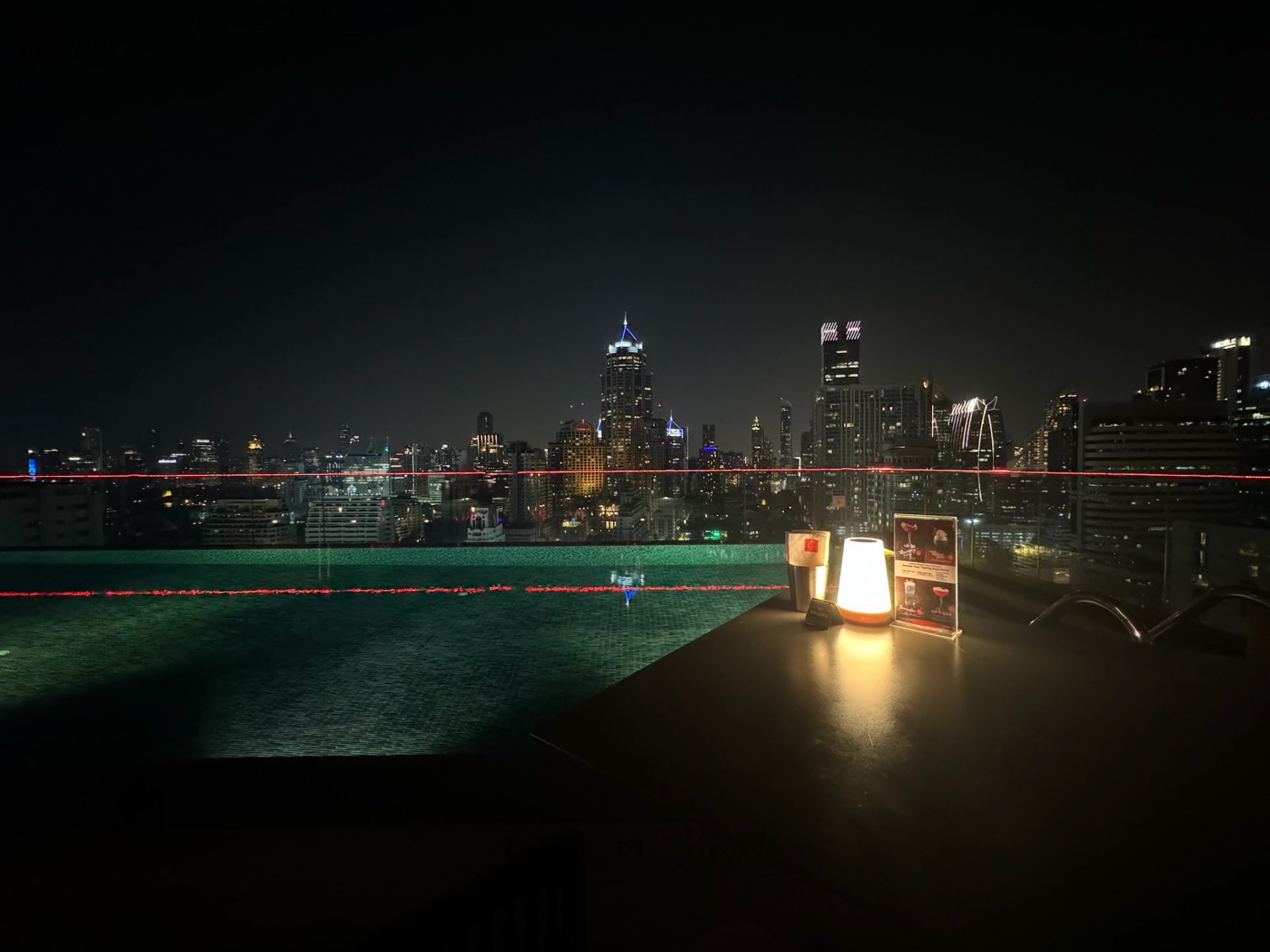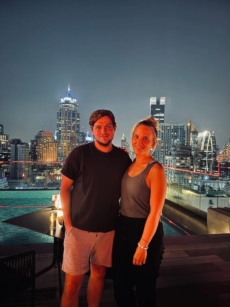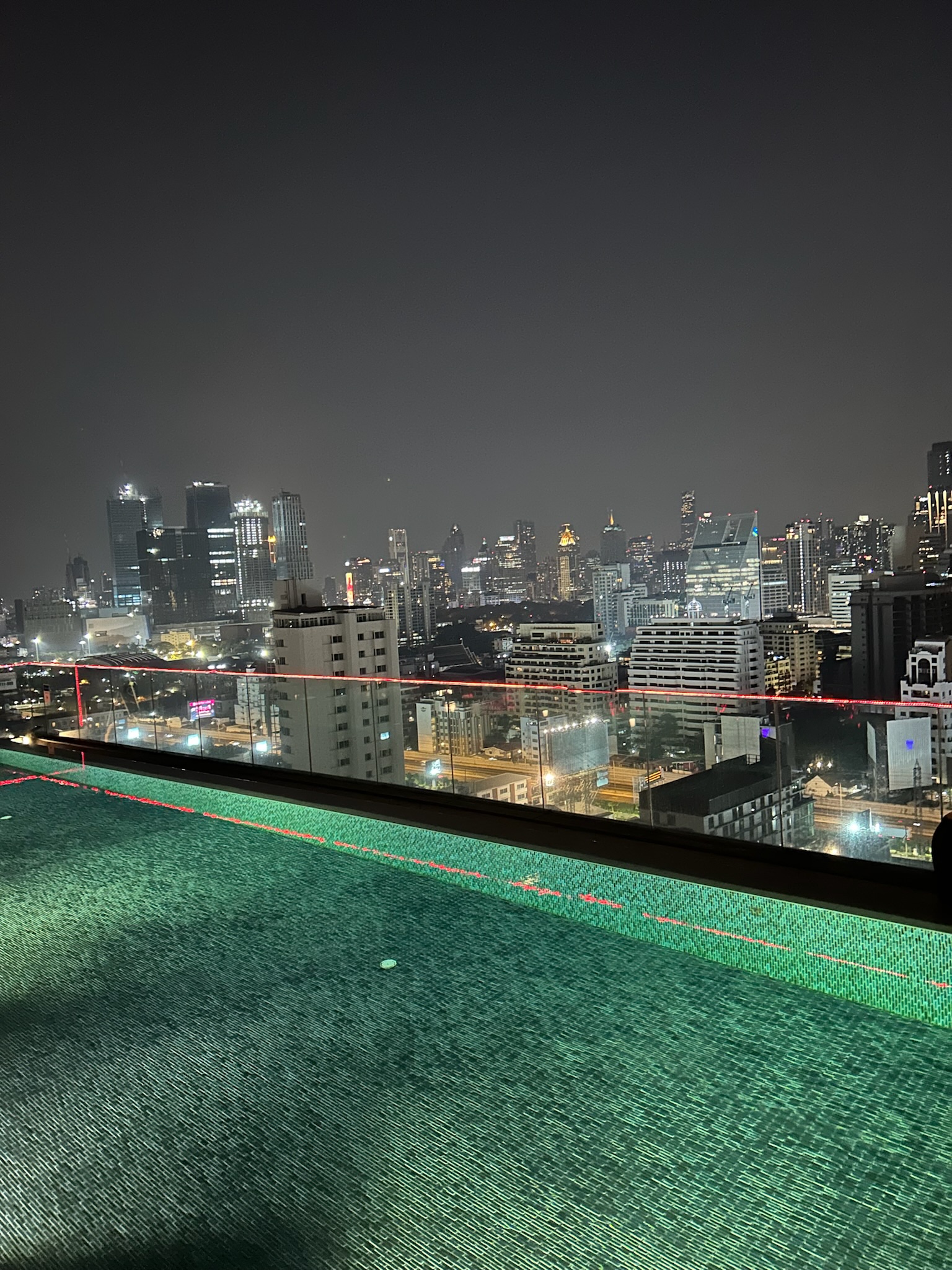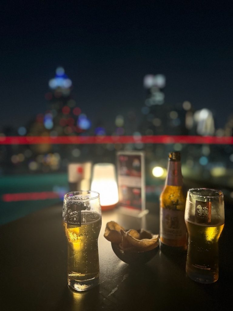 Für den Abend hatten wir einen Tisch in einer Sky-Bar reserviert. Da wir durch die Umplanung spät dran waren, nahmen wir ein Tuk Tuk zur „Redsquare Rooftop Bar“. Dort angekommen holten wir uns auf der Straße noch schnell ein paar Frühlingsrollen als Snack. Wir hatten so Hunger, weil wir bisher nur gefrühstückt hatten. In der Bar genossen wir bei ein paar Bier die Aussicht auf die Skyline. Zum Essen wollten wir dann in eine andere Location.
