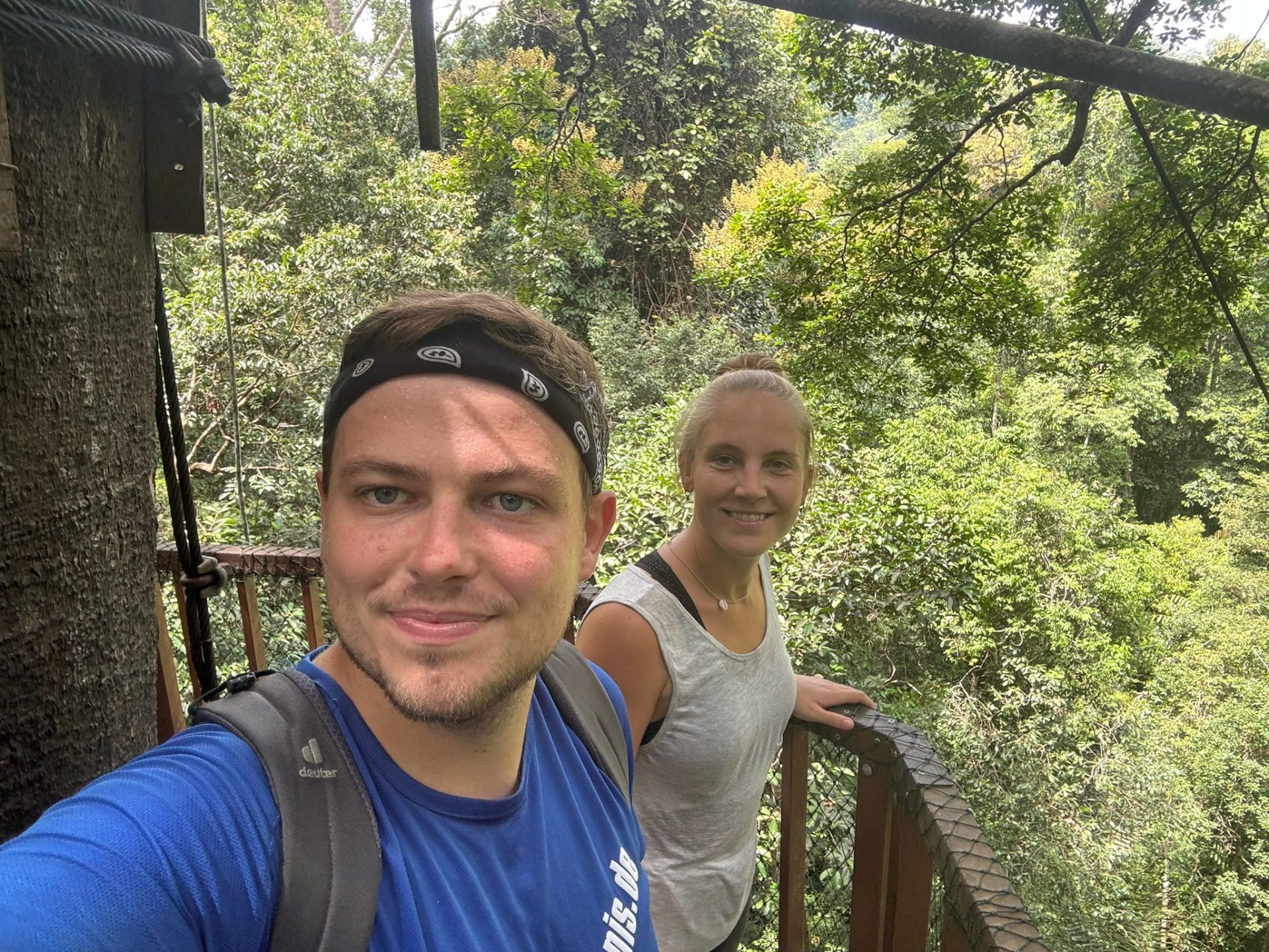Nach dem Frühstück fuhren wir wieder zum Nationalpark rüber. Wir liefen eine Wanderroute zum „Canopy Walk“, einem Baumwipfelpfad. Um dort hin zu kommen, mussten wir einige Treppen einen Berg hoch steigen. Vom Dorf aus sah der Nationalpark gar nicht so bergig aus. Um den Canopy Walk zu machen, mussten wir nochmal 1€ Eintritt zahlen, und dann ging es einige Zehnermeter über dem Boden auf wackeligen Holzplanken durch die Bäume. Vom Ende hätten wir viele Treppen wieder zum Ausgangspunkt steigen müssen, von wo wir eigentlich weiter zum Teresek Hill laufen wollten, aber wegen der schwülen Wärme waren wir schon ganz kaputt und durchgeschwitzt. Also entschieden wir uns, den anstrengenden Aufstieg zum Berg ausfallen zu lassen und zurück zum Parkeingang zu laufen.