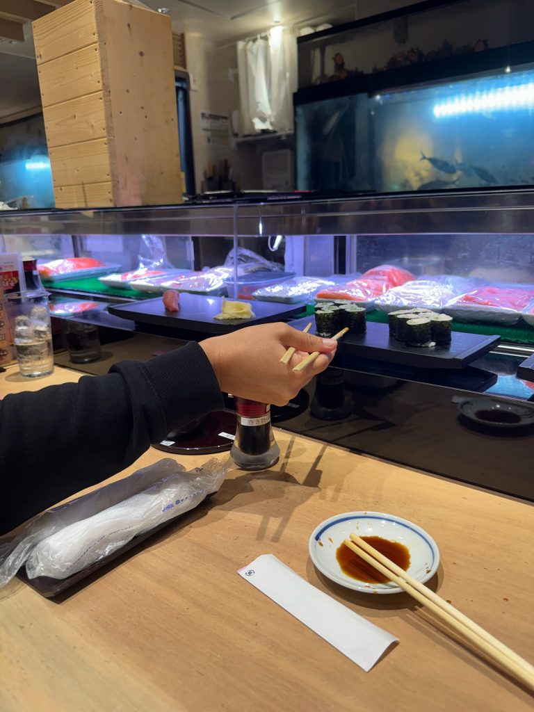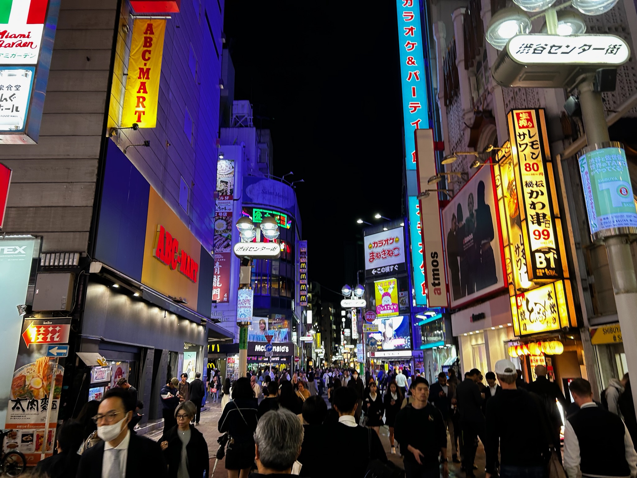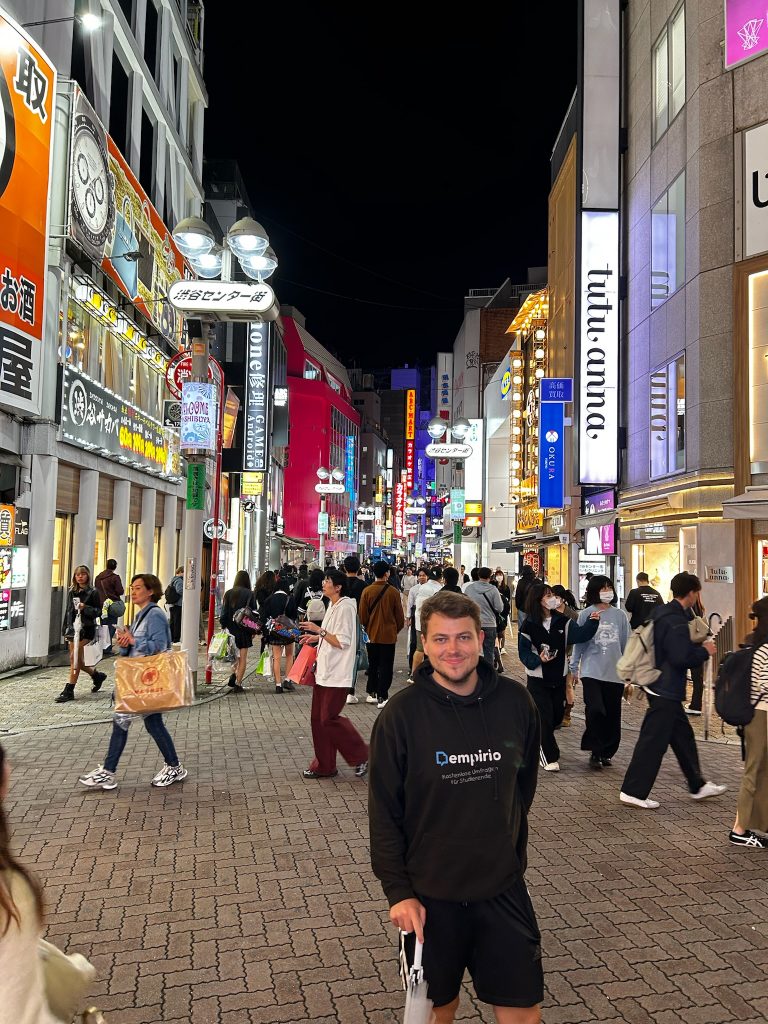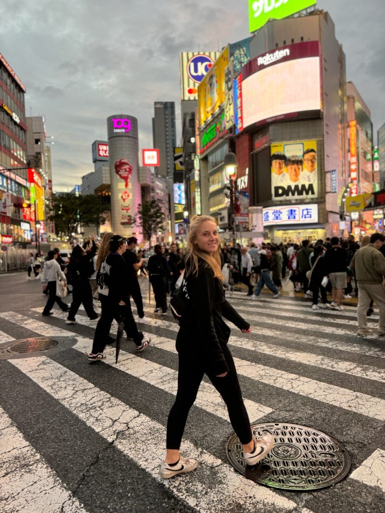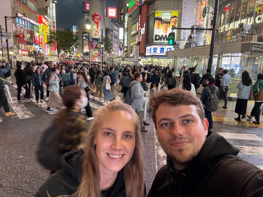 Die Matratzen sind zwar nicht mehr so hart wie in Peking, aber leider immer noch ziemlich hart… Wir wollten erst mal wieder ausschlafen, aber leider ging’s mir immer noch nicht wieder gut. Zumindest ist das Sushi aus dem Supermarkt drinnen geblieben. Wir holten uns Frühstück aus dem Supermarkt gegenüber („Brot“, Frischkäse, Gurken und Pfannkuchen). Danach hab ich mich nochmal ausgeruht. Am Nachmittag haben wir uns dann endlich auf den Weg gemacht. Wir fuhren ein paar Stationen zur Shibuya Station. Hier ist die bekannte Kreuzung, bei der es an allen fünf Zebrastreifen gleichzeitig grün wird. Diese Zebrastreifen an Kreuzungen, die auch quer rüber führen, haben wir noch öfter gesehen, aber da diese Kreuzung in einer Shopping-Gegend liegt, gehen hier super viele Leute gleichzeitig über die Straße. Wir holten uns einen Kaffee und beobachteten aus dem Fenster in der ersten Etage das Treiben. Danach liefen wir noch ein bisschen durch die bunt beleuchteten Shopping-Straßen. Wir fuhren mit der Metro zurück zu unserem Hotel. Marco hatte ein Sushi-Restaurant im Bahnhofsviertel rausgesucht. Wir saßen vorm Tresen und konnten direkt beim „Koch“ bestellen, der vor unserer Nase das Sushi zubereitet hat. Dazu wurde man mit lauten Ausrufen begrüßt und verabschiedet, was wir ziemlich cool fanden.