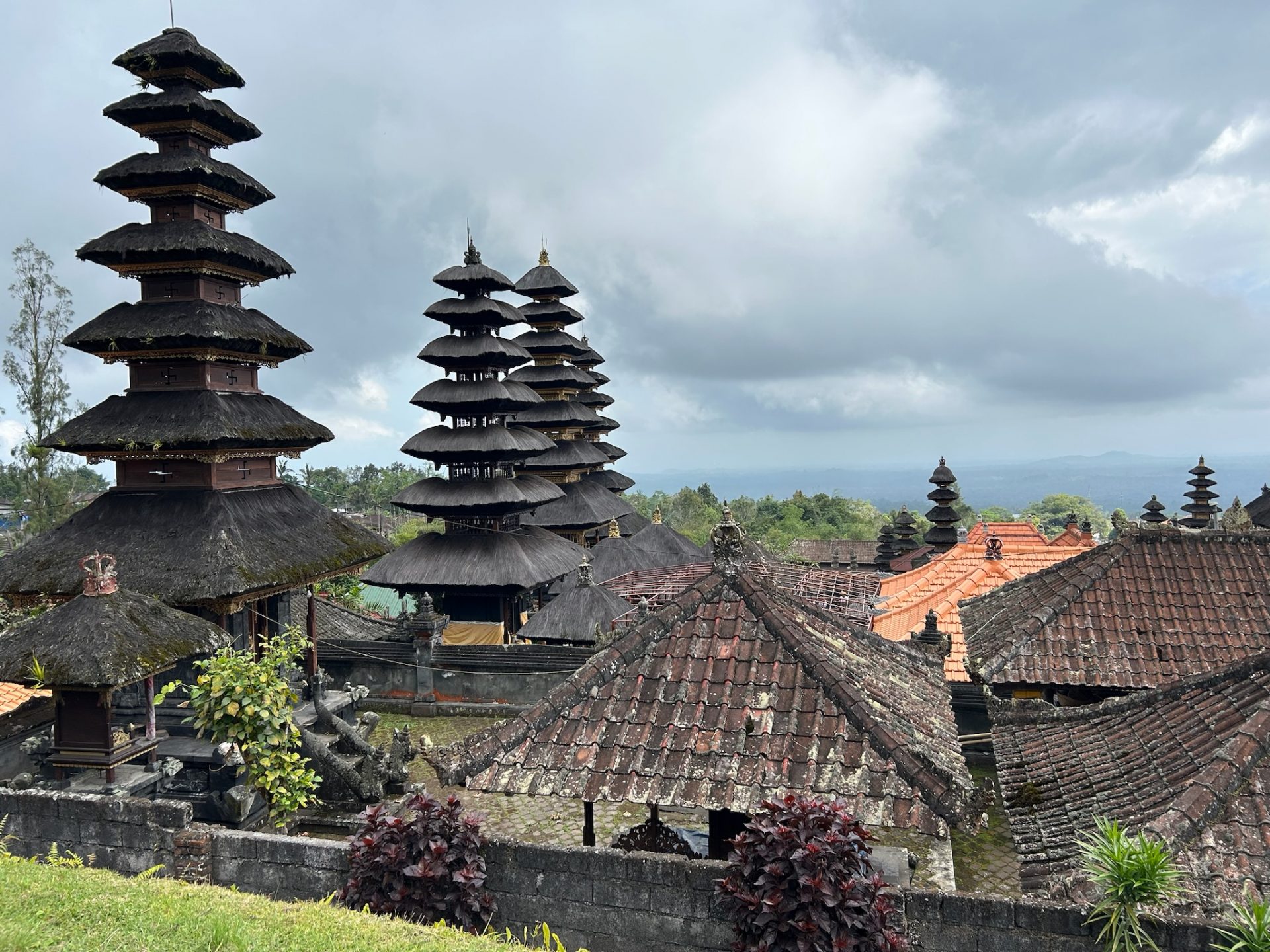 Nach dem Frühstück buchten wir ein Hotel in Pamenang, wo wir auf Lombok ankommen werden. Danach fuhren wir ca. 1,5 Stunden in die Berge zum Besakih Tempel, der größten Tempelanlage auf Bali mit 25 Tempeln. Wir zahlten Eintritt (9€ p.P.), bekamen einen Sarong und einen Guide gestellt. Wir fuhren mit einem Golfcart die Straße hoch zum Eingang des Tempels. Wir liefen ca. eine halbe Stunde über das Gelände, der Guide erzählte uns ein paar Fakten und machte Fotos von uns. Währenddessen wurde eine große Zeremonie im Haupttempel abgehalten. Den Berg Agung (höchster Berg/Vulkan auf Bali mit 3.100 m Höhe) im Hintergrund haben wir leider nicht gesehen, weil er mal wieder in den Wolken lag.