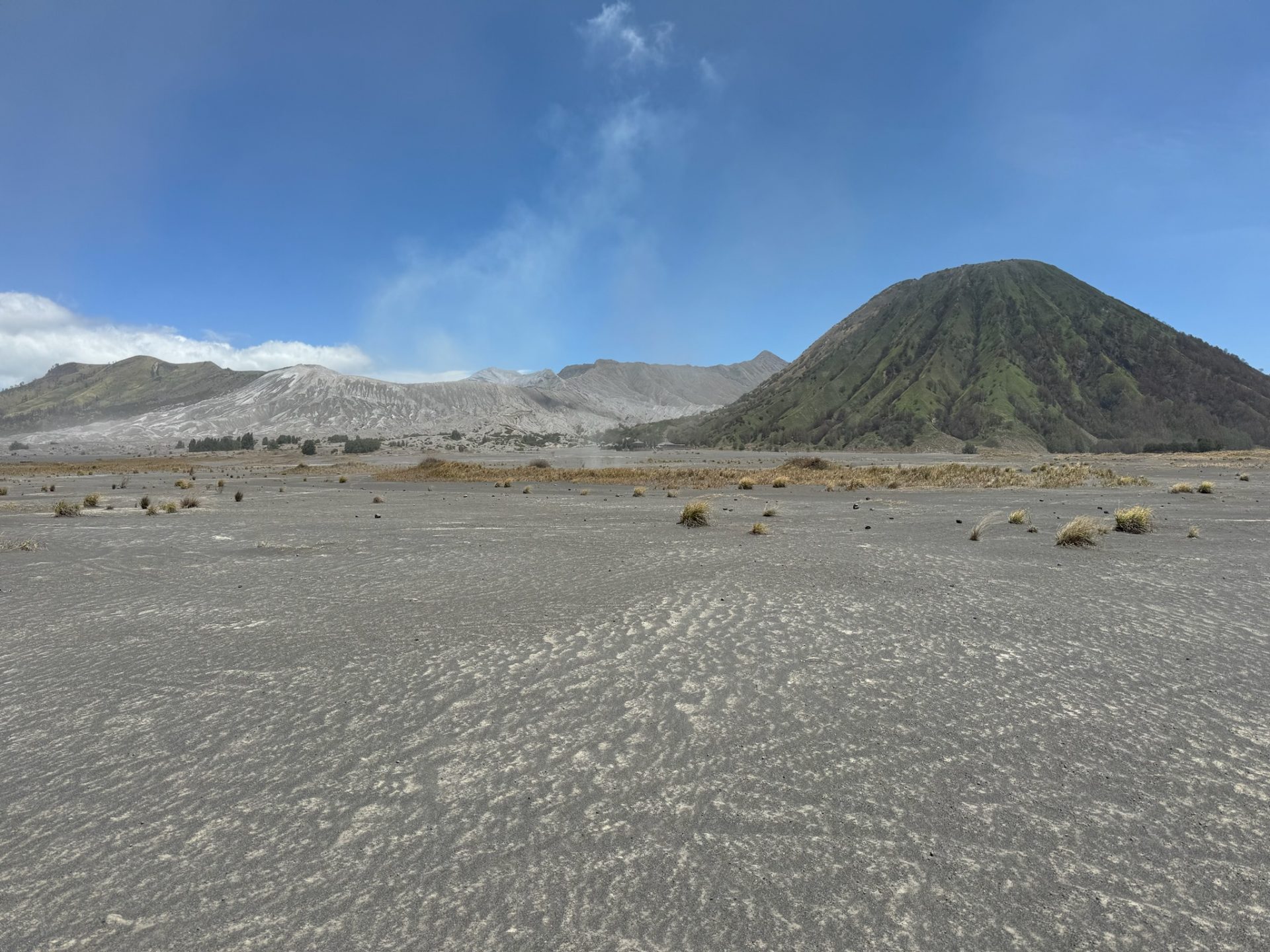 Heute wollten wir den Bromo besteigen. Da die meisten Tagestouristen nach Sonnenaufgang mit dem Jeep über die Ebene fahren, um den Bromo zu besteigen, wollten wir mittags los. Wir frühstückten gegen 9:30 Uhr in dem modernen Restaurant. Wir holten unsere Sachen aus dem Zimmer, zogen uns um und gingen gegen 11 Uhr los. Im Internet fand Marco einen Weg runter in die Ebene heraus, wo man den Haupteingang umgehen konnte und wir so den Eintritt (13€ p.P.) sparen konnten. Der Pfad den Berg runter war super staubig und rutschig. Auch in der Ebene wurde ziemlich viel Staub durch die fahrenden Autos und Roller sowie den Wind aufgewirbelt. Wir konnten nicht vermeiden komplett eingestaubt zu werden und der ganze Dreck sammelte sich in unseren Schuhen. Wir liefen durch die Ebene durch bis zum Bromo.