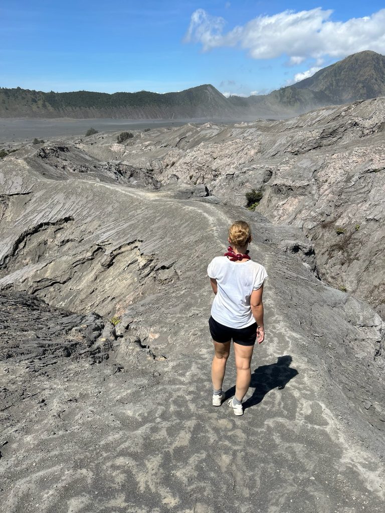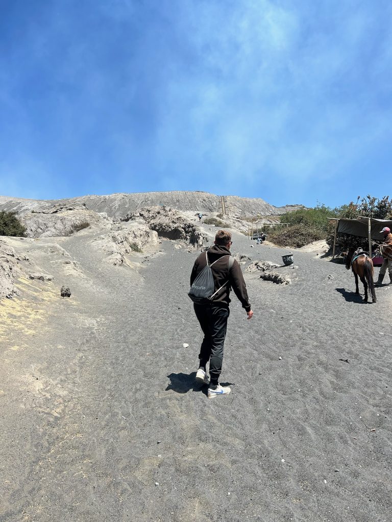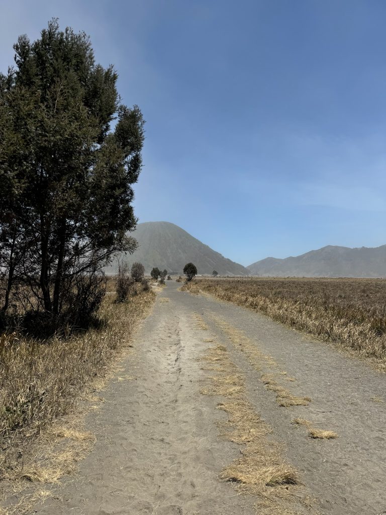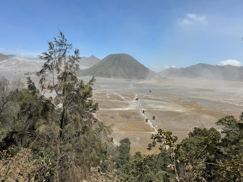 Heute wollten wir den Bromo besteigen. Da die meisten Tagestouristen nach Sonnenaufgang mit dem Jeep über die Ebene fahren, um den Bromo zu besteigen, wollten wir mittags los. Wir frühstückten gegen 9:30 Uhr in dem modernen Restaurant. Wir holten unsere Sachen aus dem Zimmer, zogen uns um und gingen gegen 11 Uhr los. Im Internet fand Marco einen Weg runter in die Ebene heraus, wo man den Haupteingang umgehen konnte und wir so den Eintritt (13€ p.P.) sparen konnten. Der Pfad den Berg runter war super staubig und rutschig. Auch in der Ebene wurde ziemlich viel Staub durch die fahrenden Autos und Roller sowie den Wind aufgewirbelt. Wir konnten nicht vermeiden komplett eingestaubt zu werden und der ganze Dreck sammelte sich in unseren Schuhen. Wir liefen durch die Ebene durch bis zum Bromo.