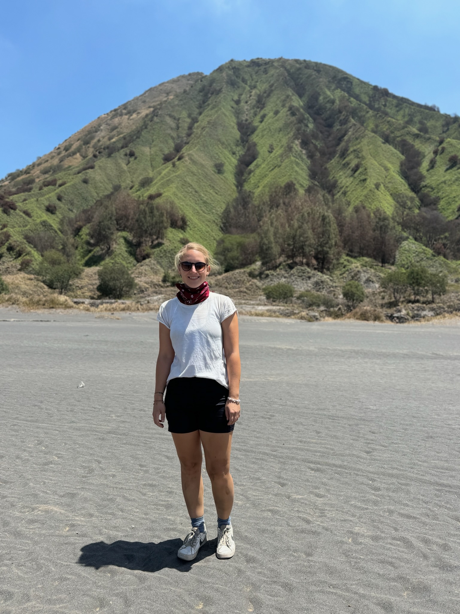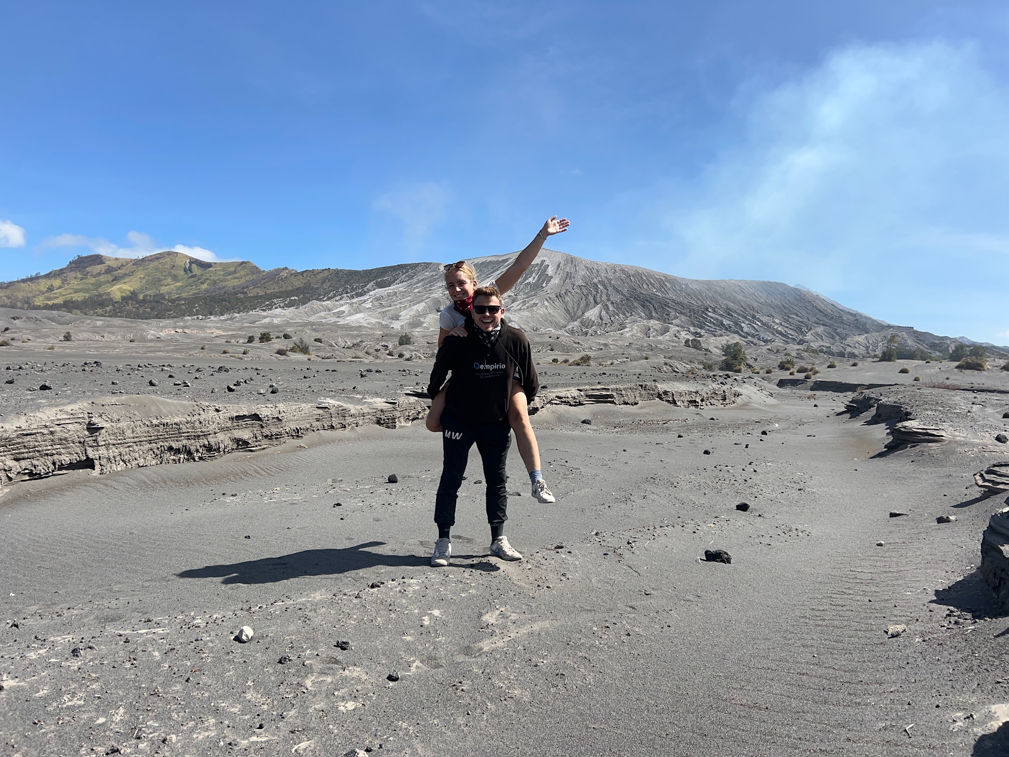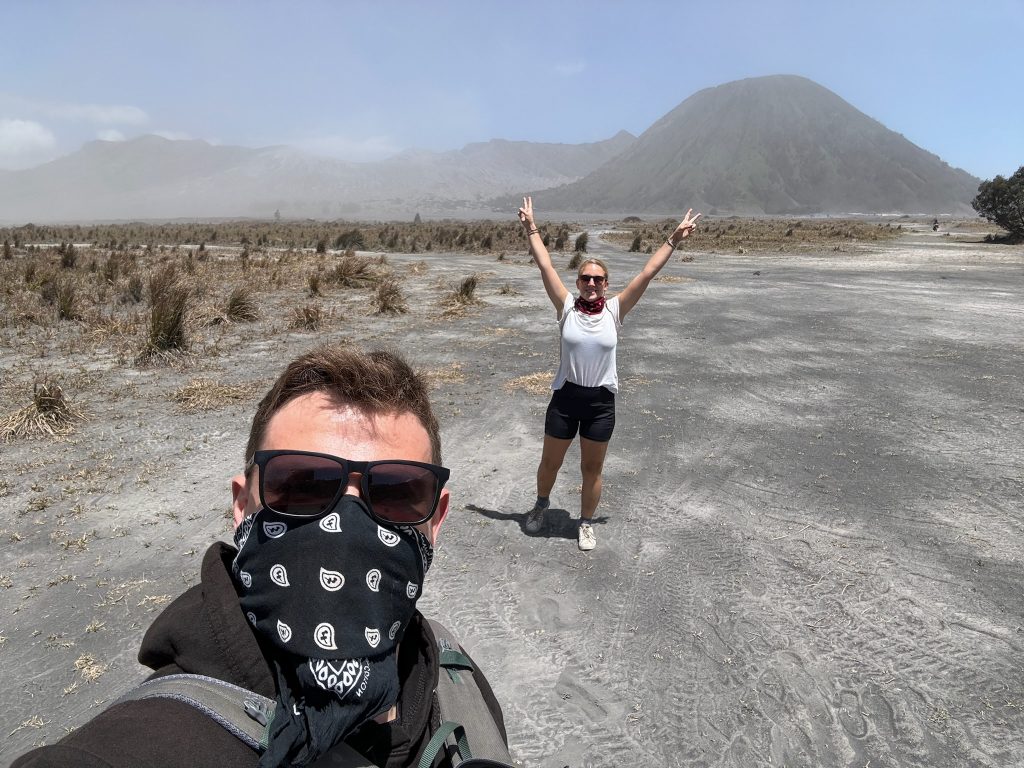 Heute wollten wir den Bromo besteigen. Da die meisten Tagestouristen nach Sonnenaufgang mit dem Jeep über die Ebene fahren, um den Bromo zu besteigen, wollten wir mittags los. Wir frühstückten gegen 9:30 Uhr in dem modernen Restaurant. Wir holten unsere Sachen aus dem Zimmer, zogen uns um und gingen gegen 11 Uhr los. Im Internet fand Marco einen Weg runter in die Ebene heraus, wo man den Haupteingang umgehen konnte und wir so den Eintritt (13€ p.P.) sparen konnten. Der Pfad den Berg runter war super staubig und rutschig. Auch in der Ebene wurde ziemlich viel Staub durch die fahrenden Autos und Roller sowie den Wind aufgewirbelt. Wir konnten nicht vermeiden komplett eingestaubt zu werden und der ganze Dreck sammelte sich in unseren Schuhen. Wir liefen durch die Ebene durch bis zum Bromo.