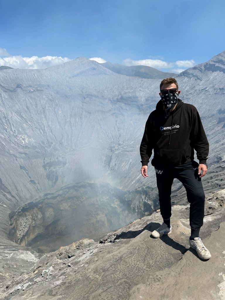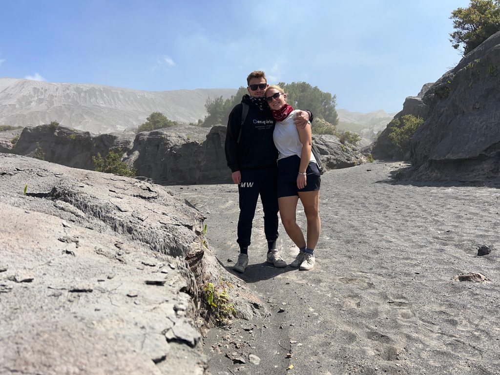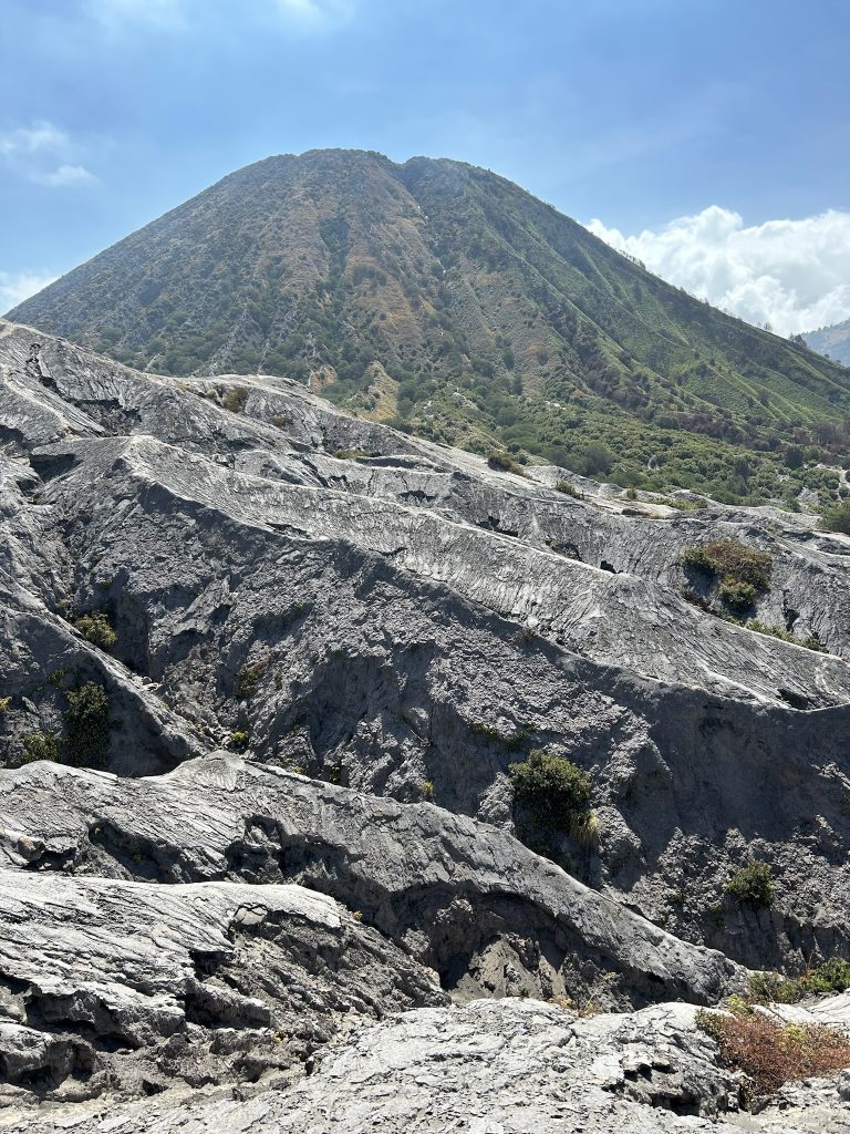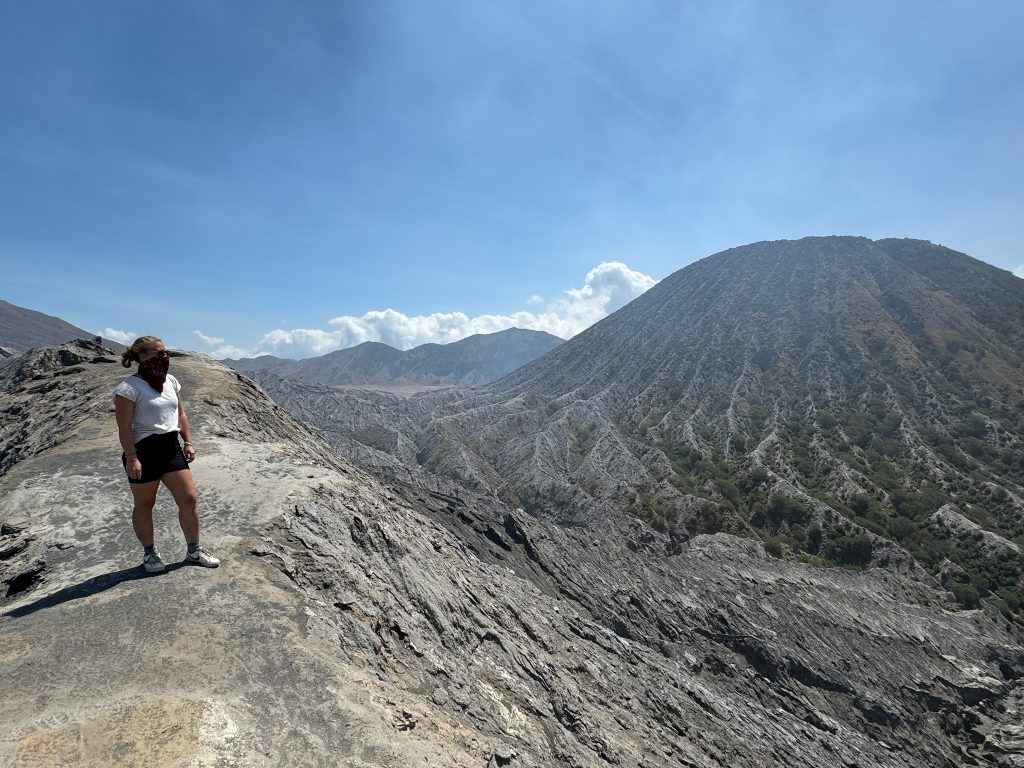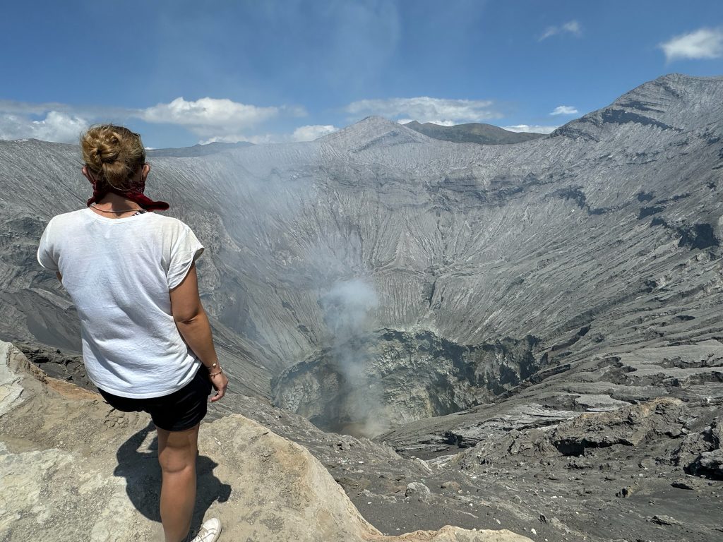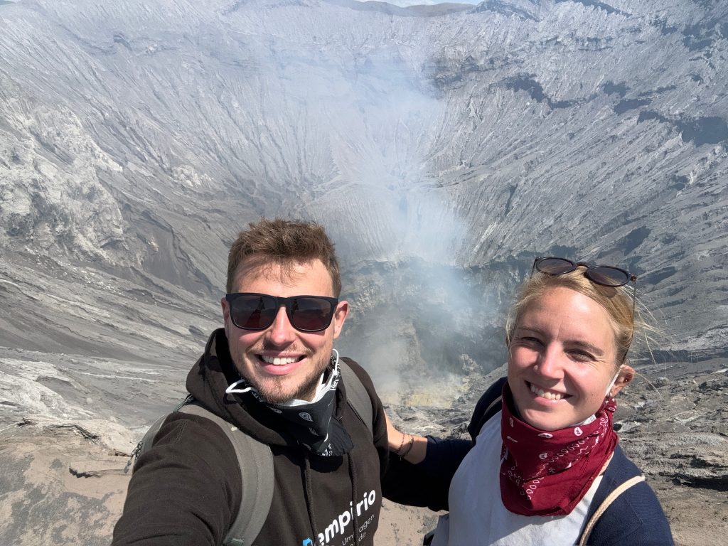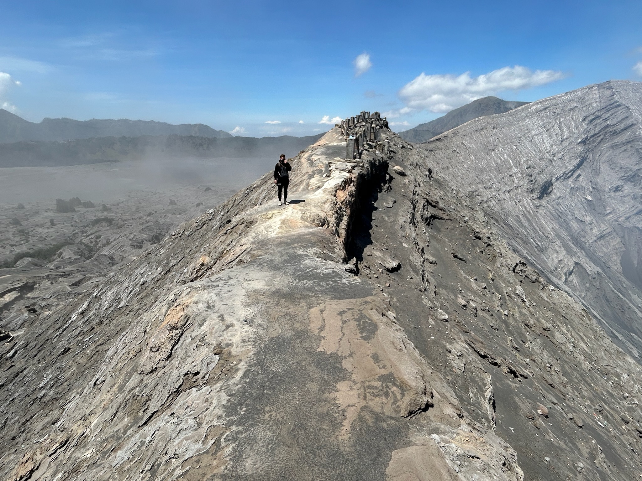 Am Anfang geht der Weg noch steil am Hang nach oben, das letzte Stück führt über eine Treppe. Hier merkt man schon die beißenden Schwefelgase, aber diesmal waren wir besser ausgestattet mit Maske und Halstuch. Als wir auf dem Kraterrand ankamen, war der Ausblick mega! Sowohl in den Krater rein, als auch der Blick auf den Berg Balok nebenan, in das riesige Tal hinein und auf die zerklüfteten Hänge des Bromo. Man hörte auch super laut den Gasaustritt. Wir liefen das zugängliche Stück am Krater einmal entlang.