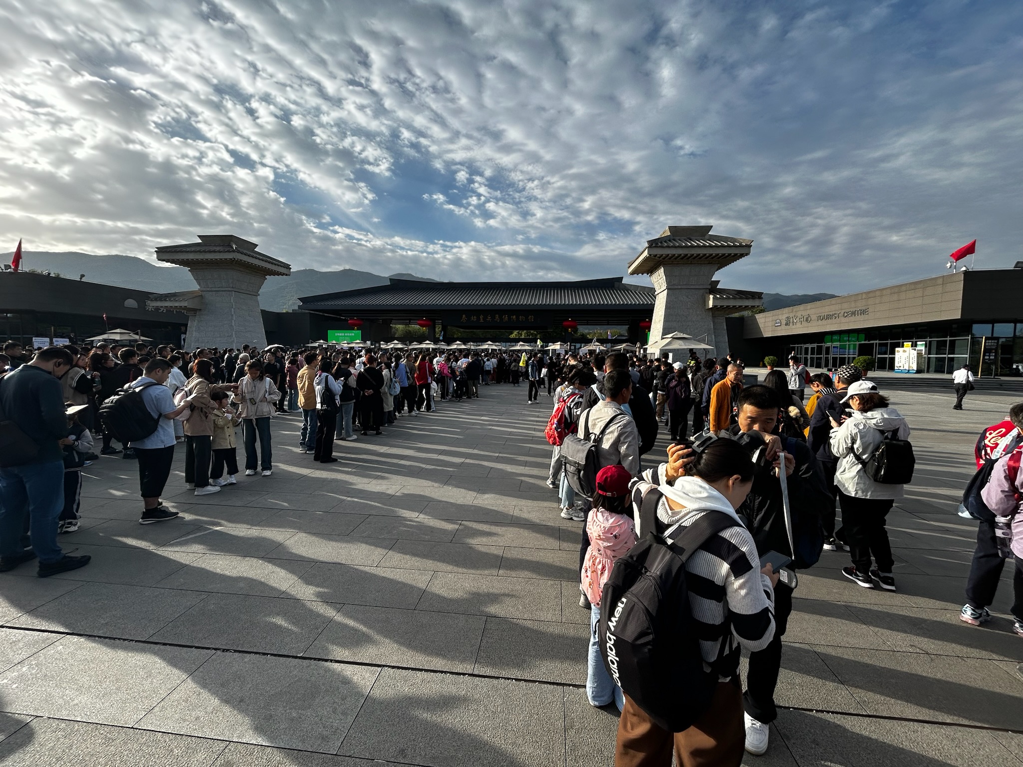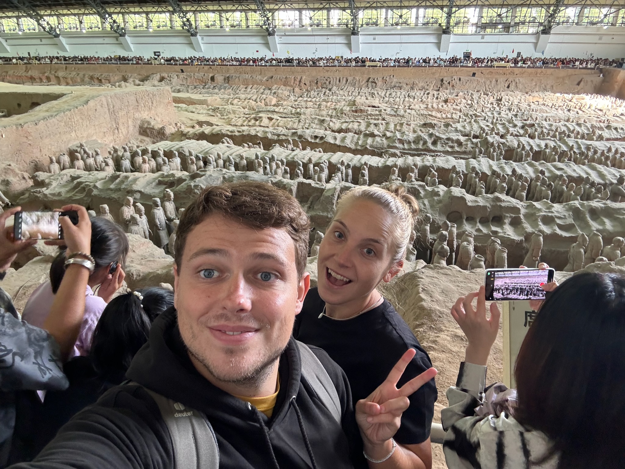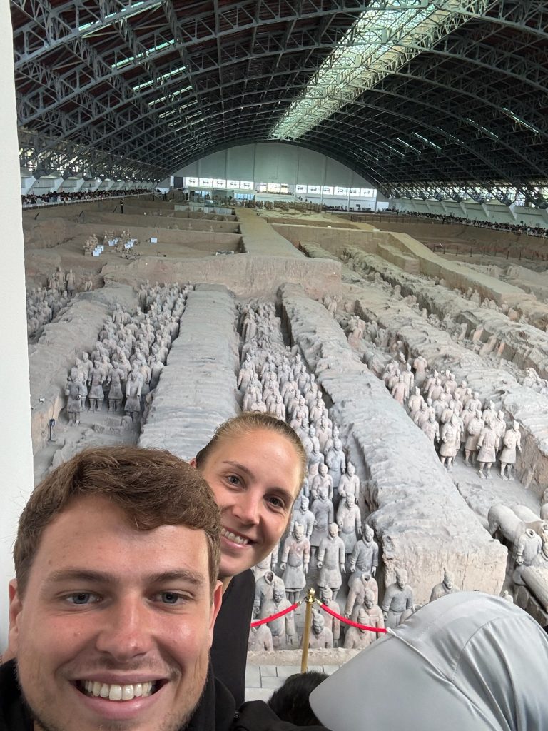 Heute hieß es früh aufstehen, da wir unsere Tickets für den ersten Zeitslot um 8:30 Uhr gebucht hatten. Um 6:30 Uhr gingen wir zum Frühstück und auf 7:15 Uhr bestellten wir uns ein Taxi zur Terrakotta-Armee. Der Abfahrtsort des Touristenbusses war nicht eindeutig rauszukriegen und wegen der frühen Urzeit entschlossen wir, uns für die Hinfahrt ein Taxi (15€) zu nehmen. Die Fahrt dauerte ca. eine Stunde, da die Anlage 35 km entfernt lag. Dort angekommen, war schon die Hölle los, die frühen Chinesen konnten wir nicht schlagen :D. Aber hier ist wohl immer viel los…Wir waren pünktlich da und stellten uns in einer der Schlangen vor der Ticketkontrolle an. Auch hier mussten wir nur unseren Pass scannen und durch eine Sicherheitskontrolle. Wir mussten noch ein Stück über das Gelände laufen und durch eine zweite Ticket-Kotrolle. Jetzt waren wir auf dem Gelände, wo in drei Hallen die Tonfiguren in ihren Gruben ausgestellt sind. Als erstes Gingen wir in ein Ausstellungsgebäude, wo einige Tonfiguren und weitere Fundstücke ausgestellt sind.