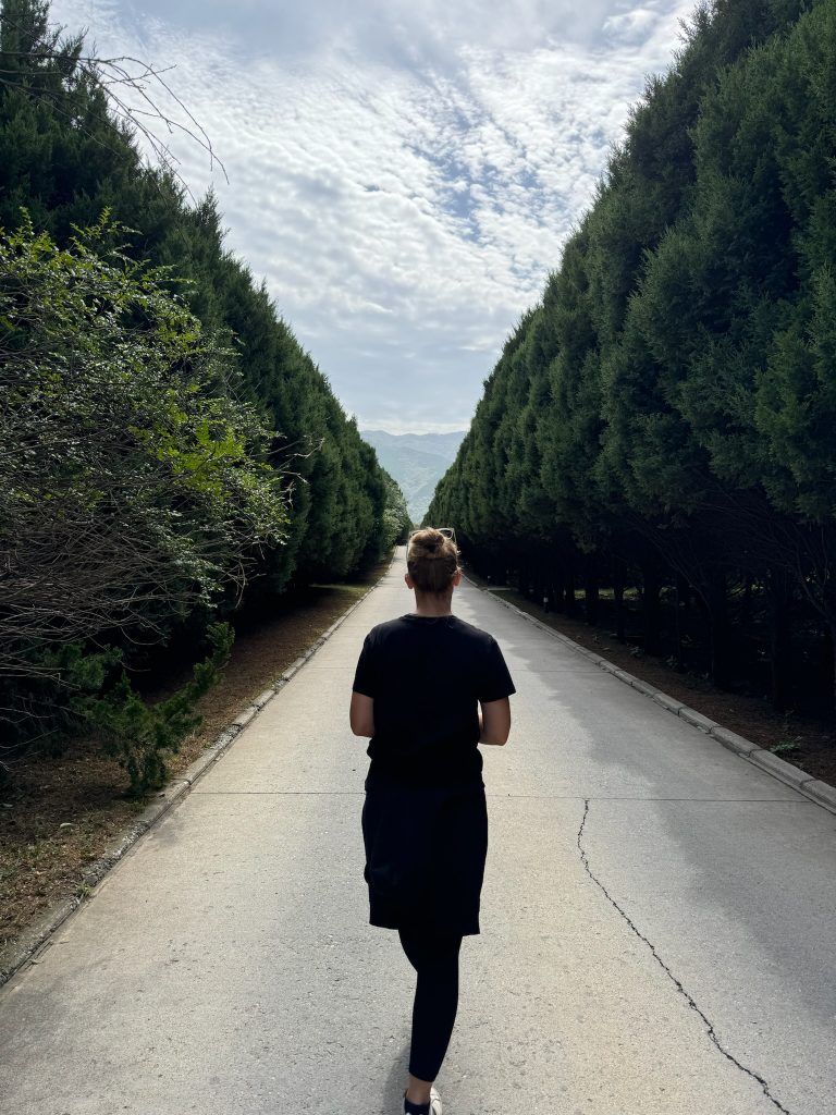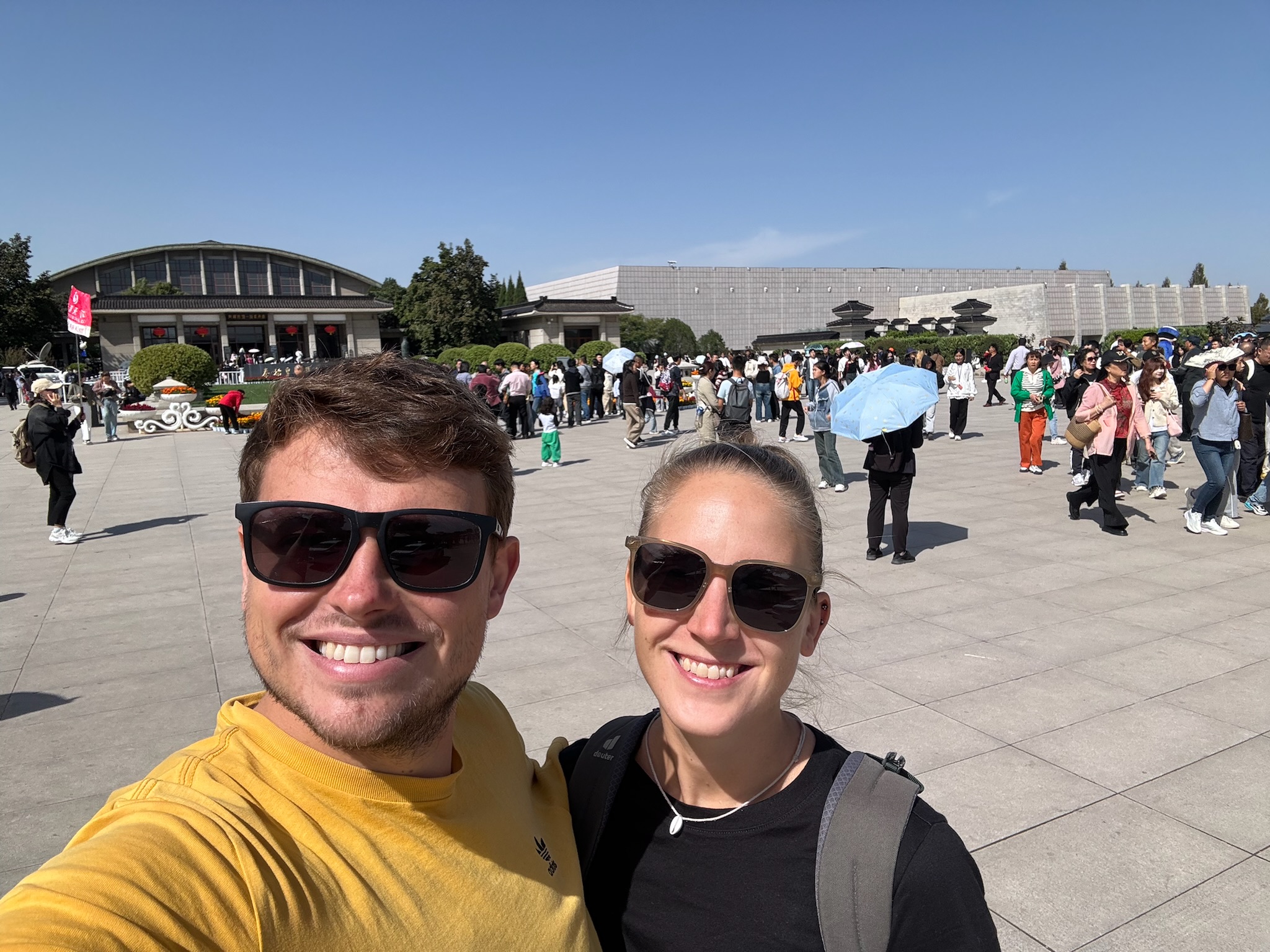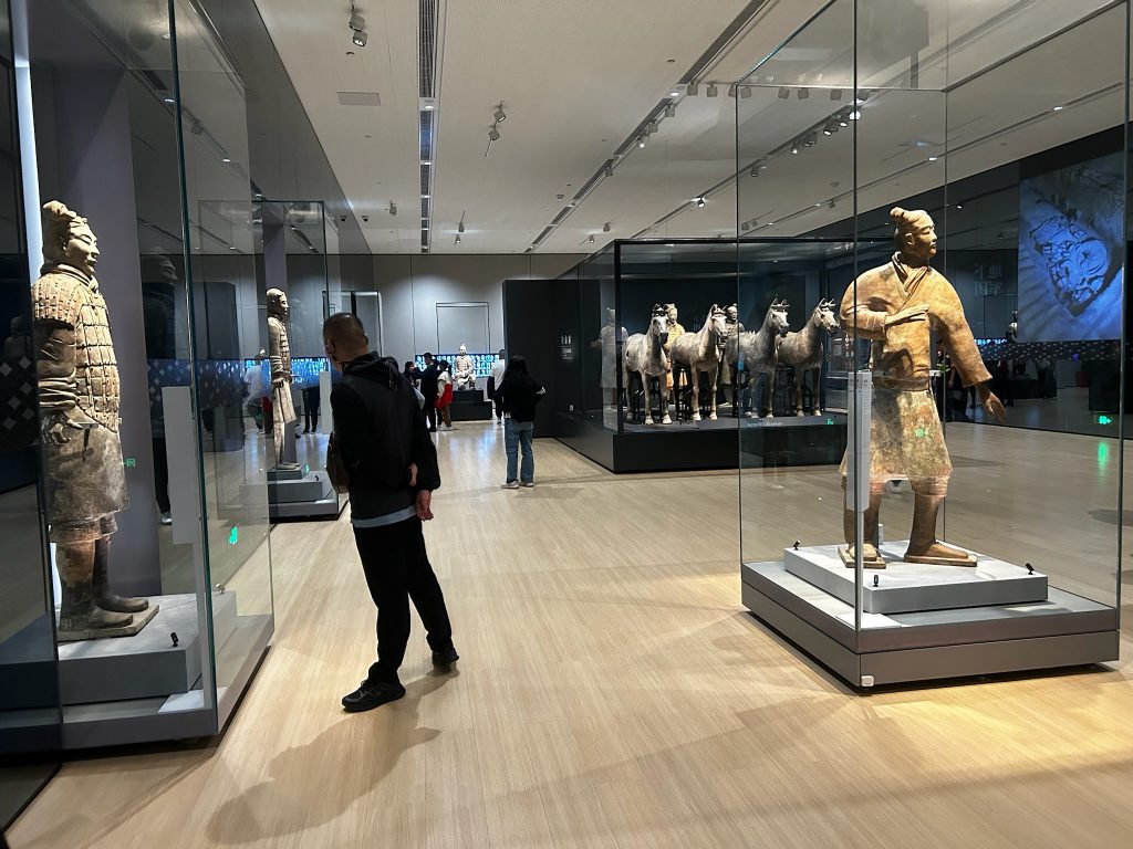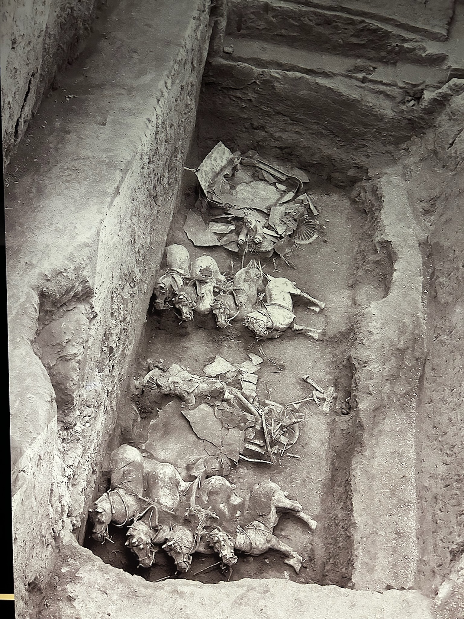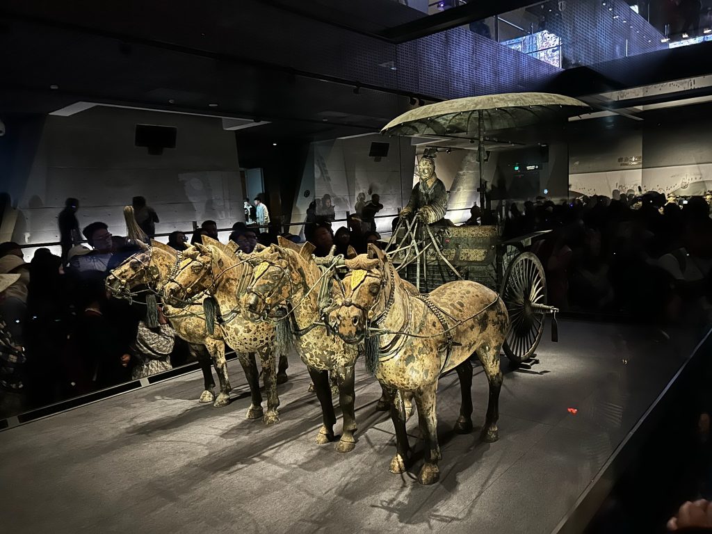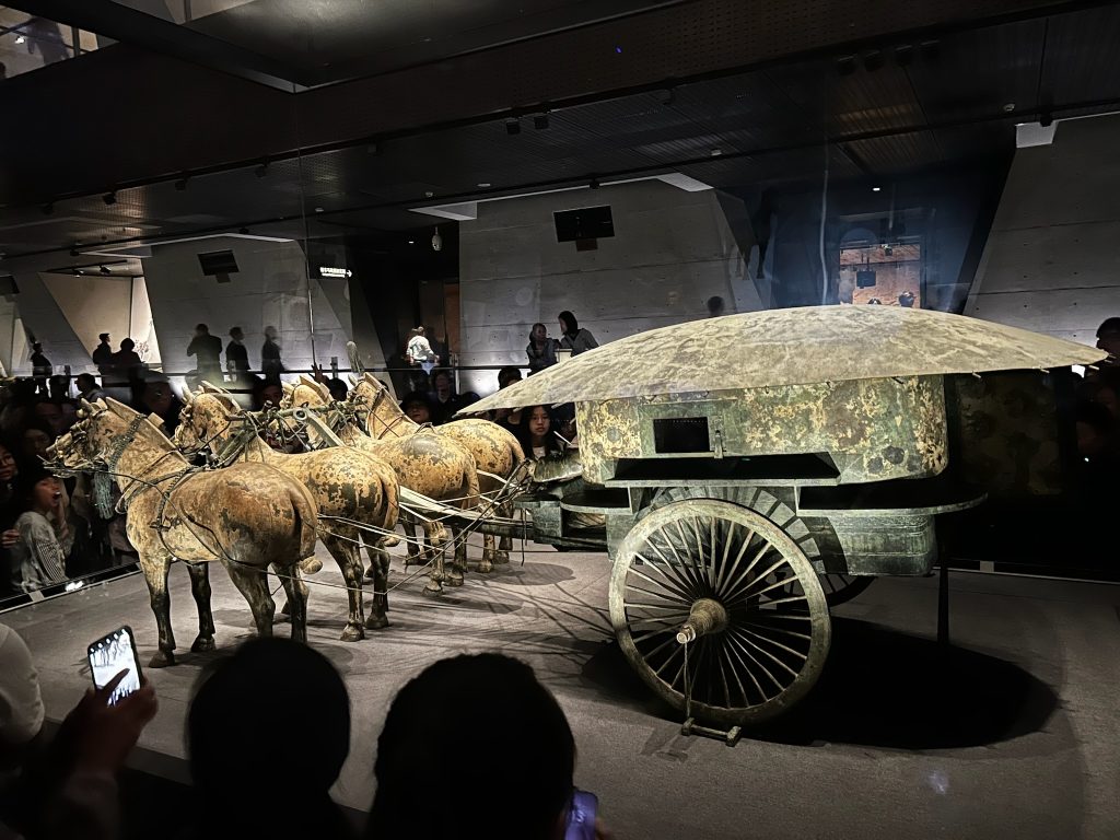 Wir fragten uns nach dem Shuttle-Bus durch, der uns zum Gelände des Mausoleums des Kaisers bringen sollte, das 1,5 km entfernt lag. Wir liefen einmal um das Mausoleum herum, weil wir dachten, dass man auch rein gehen kann, aber es war nur ein bewachsener Hügel. An einer Ecke war in einem Ausstellungshaus noch eine kleine freigelegte Grube und gegenüber war ein Museum, wo zwei ausgegrabene Wagen mit Kutscher und Pferden aus Bronze ausgestellt sind.