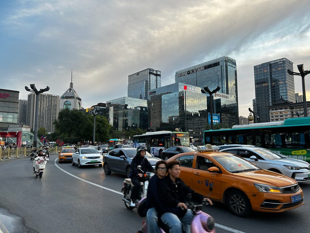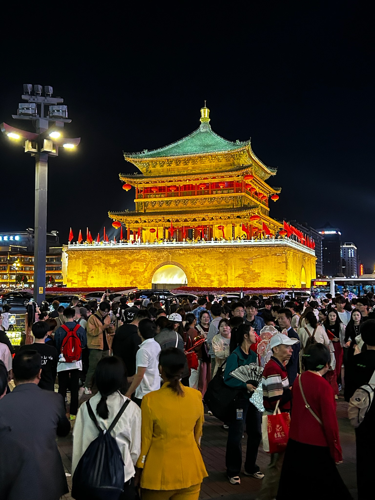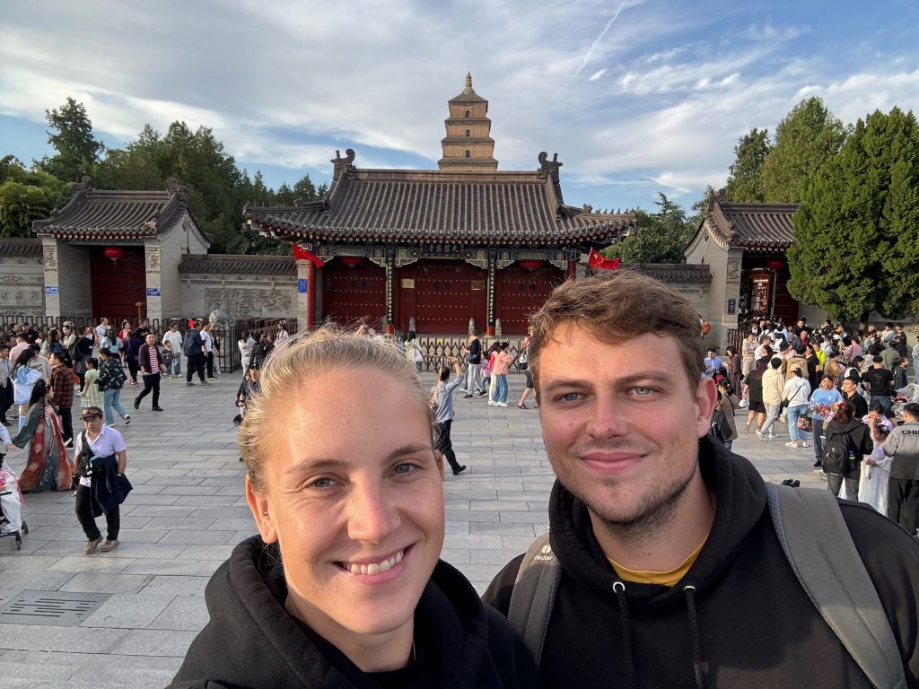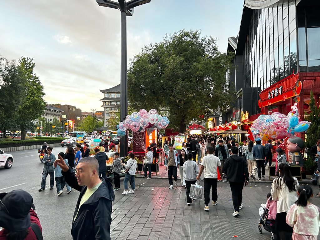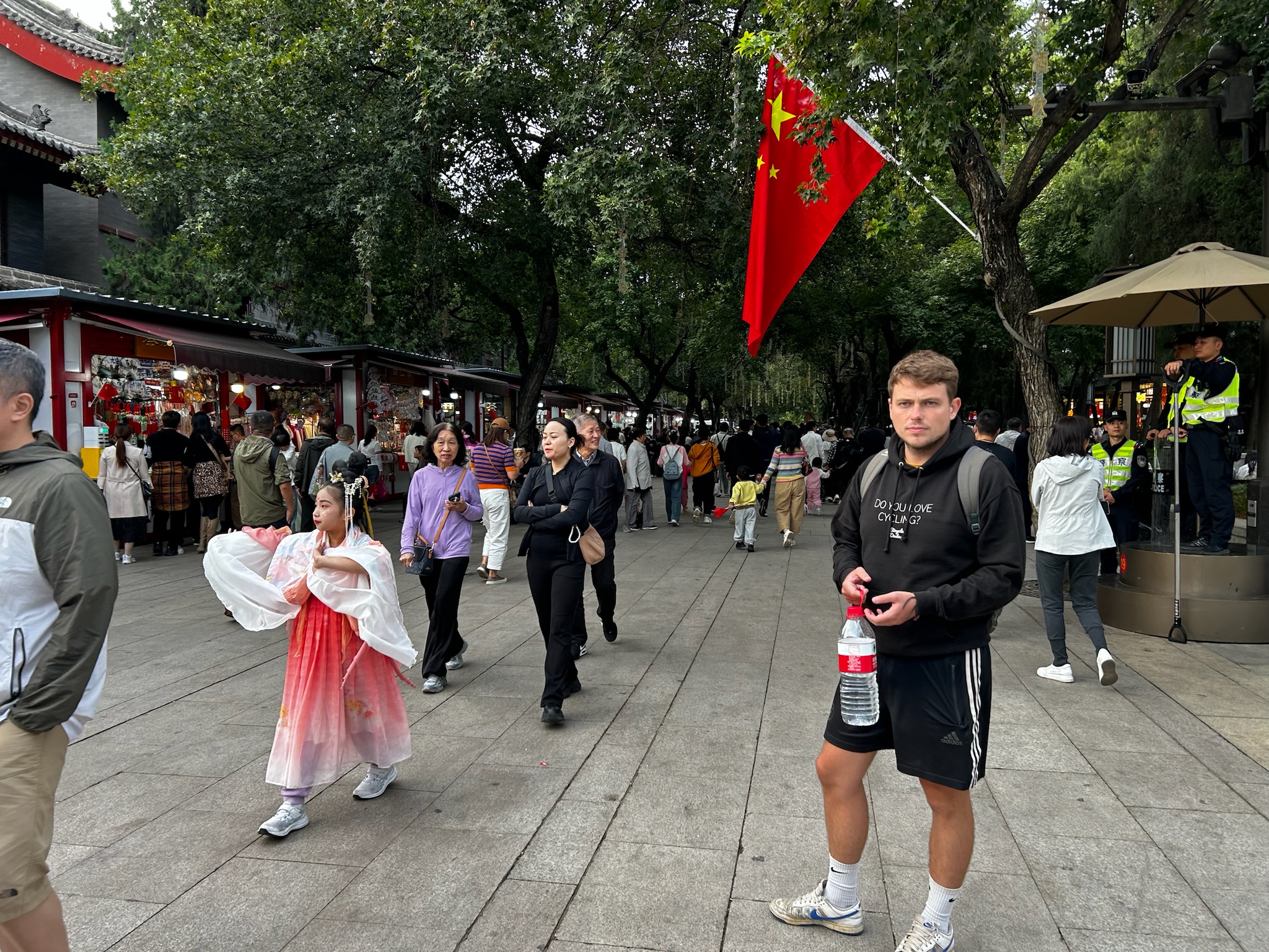 Die Beine schmerzten schon und nach ca. zwei Stunden machten wir uns auf den Weg zum Ausgang und zum Shuttlebus. Wir stiegen beim Haupteingang der Terrakotta-Armee aus und suchten den Touristenbus in die Stadt, was nicht einfach war. Es gab sogar zwei Haltestellen mit Linienbussen, wo aber nicht die richtige Nummer fuhr. Als wir beim zweiten nachfragten, ob er nach Xi‘an fährt, wurde es bestätigt und wir stiegen einfach ein. Die Endstation lag aber nur 6 km entfernt. Hier war immerhin eine Metro-Station – damit kommen wir besser klar! Wir suchten unsere Station raus, kauften zwei Tickets und fuhren in die Stadt. Wir mussten noch zweimal umsteigen und die Fahrt dauerte ca. eine Stunde. Gegen 17 Uhr kamen wir endlich an der „Big Goose Pagoda“ an. Auch in der Stadt war die Hölle los, viele hatten sich in traditionelle Kleider geschmissen mit entsprechender Frisur und Schminke. Als wir ankamen, begann gerade ein Wasserspiel vor der Pagode. Wir liefen einmal um das Gelände der Pagode herum, für das Gelände selber braucht man ein Ticket aber es hatte schon geschlossen. Hier waren viele Straßenstände und Spots, wo man sich professionell fotografieren lassen konnte.